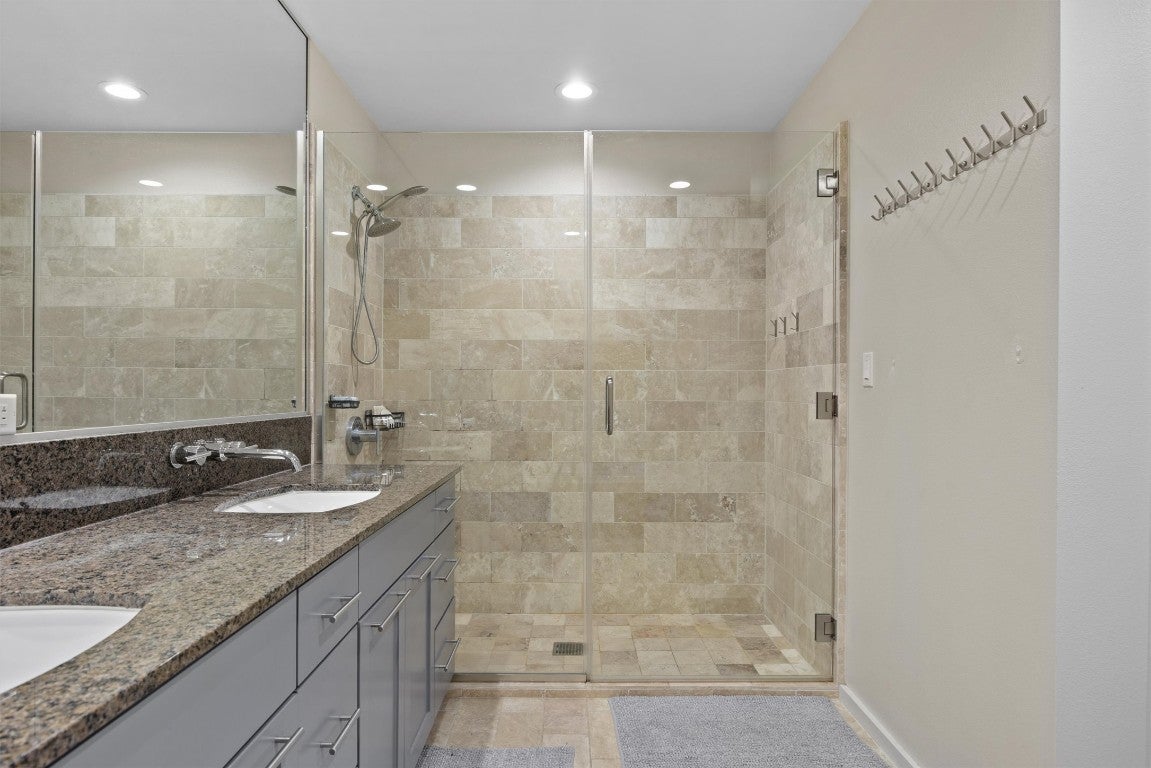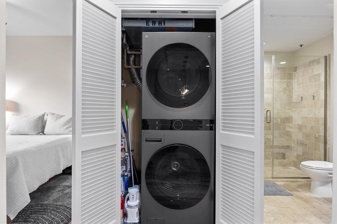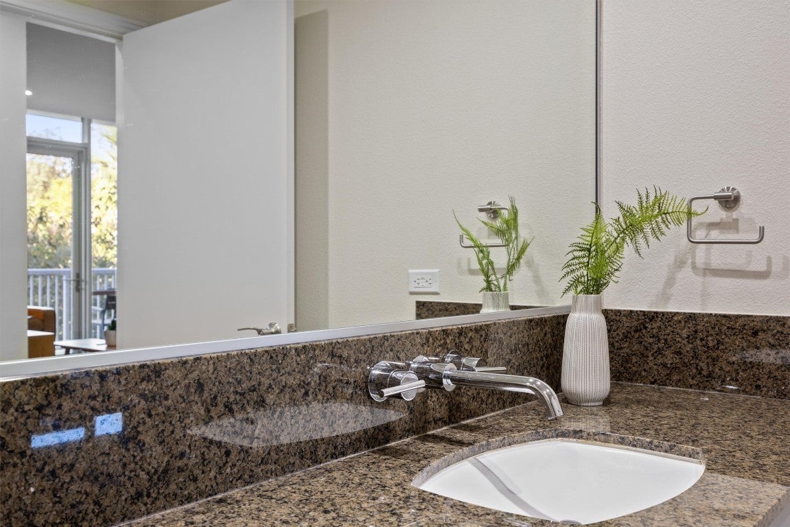 The Jewel at Barton Place earns its name the moment you step inside. The heart of this home — a brilliantly redesigned, brass-accented kitchen — is the showpiece that sets this residence apart. A modern gem, it anchors the entire living space with warmth, sophistication, and a level of detail rarely found at this price point. Located just steps from the Butler Hike and Bike Trail, this 2-bed, 2-bath condo delivers the kind of Austin living people wish for: a private perch surrounded by trees with the city’s best dining and entertainment minutes away. A coveted east-facing balcony tucked into the canopy sets the tone. From the sun-drenched living room, views of the trail and treetops frame the warm, inviting space. Inside, every detail feels intentional, from smart-home lighting to contemporary fixtures and updated hardwood-style LVP flooring. The kitchen features a waterfall quartz island with deep seating, professionally refinished two-tone cabinetry, brass hardware, a metallic honeycomb backsplash, under-cabinet lighting, a Kraus Workstation sink, and stainless appliances, including a gas range and vent hood. The dining and living areas flow easily around the island, creating a bright, social layout. A newer stacked LG washer and dryer and an updated water heater add everyday convenience. The primary suite feels calm and welcoming with designer paint tones, blackout roller shades, and an ensuite bath with a dual vanity, walk-in shower, and deep soaking tub. The second bedroom works perfectly for guests or a home office. Barton Place elevates daily living with a saltwater pool, fitness center, community garden, rooftop terraces, concierge, and secure underground parking (two large side-by-side spots). The guest suite and gym are conveniently one flight down, and an Urban Storage Unit is included. Modern, connected, and surrounded by nature — The Jewel at Barton Place is a rare find above the trees.