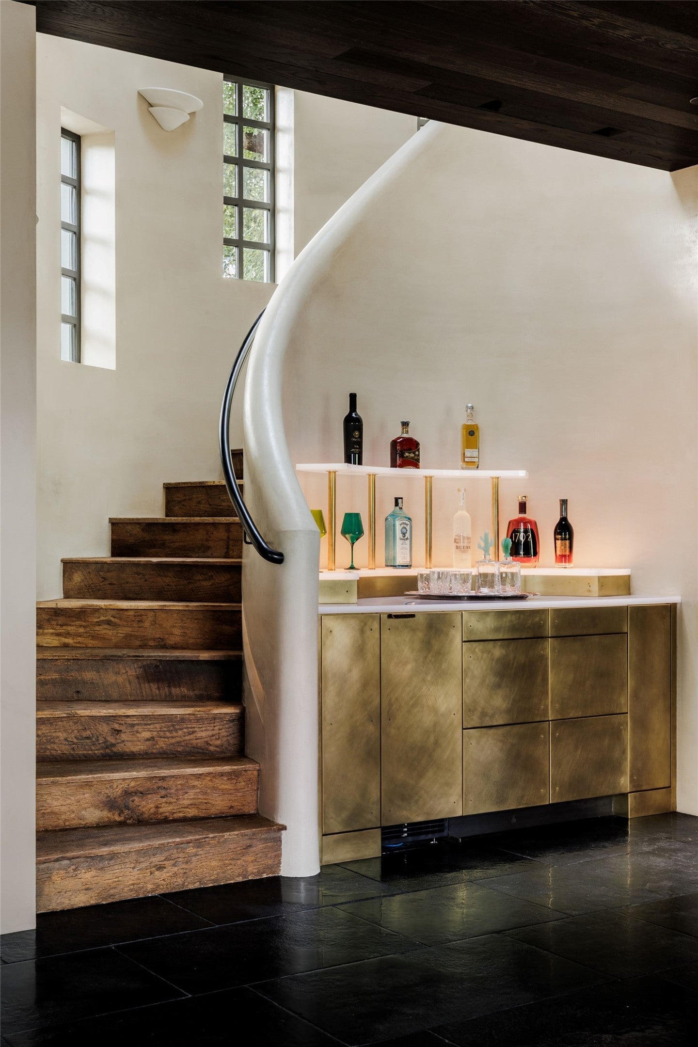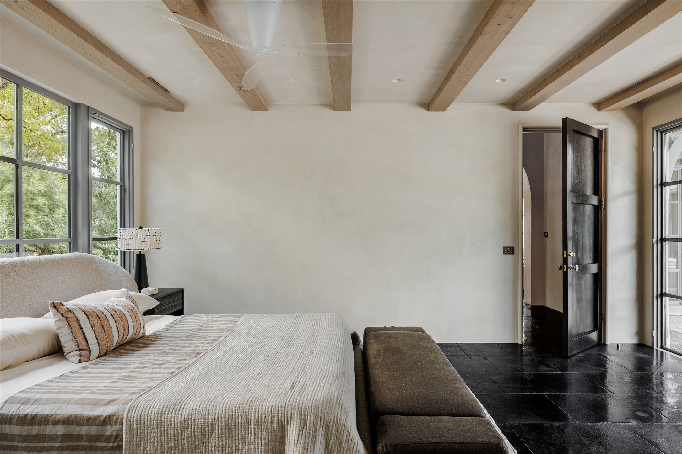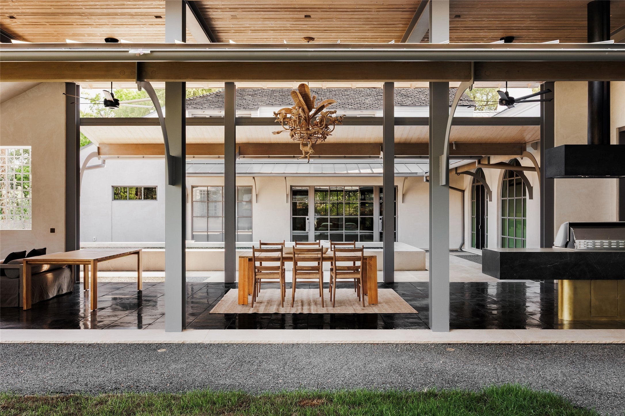 Tucked at the end of a quiet cul-de-sac and set behind a seven-foot privacy wall, 2600 Tanglewood Trail is a one- of-a- kind architectural masterpiece in the heart of Tarrytown. Built by Dalgleish Construction on over half an acre, this home marries Old World craftsmanship with modern design, offering enduring elegance and contemporary comfort in one of Austin’s most coveted neighborhoods. The Vermont slate roof and custom steel-framed doors and windows by Presidio set the tone for the bespoke interiors within. Hand-applied plaster walls, two-inch Calacatta marble with chiseled edges, black limestone imported from India, and reclaimed barnwood floors create a richly layered aesthetic. At the heart of the home, the kitchen makes a striking statement with its sculptural 19-foot steel vent hood, custom white oak cabinetry, and top-of-the-line appliances. The adjacent living area features a custom brass-plated bar with illuminated shelving, while the great room, highlighted by a coffered spruce ceiling, soapstone fireplace, and stained- glass accents brings warmth and sophistication to everyday living. The first-floor primary suite serves as a serene retreat with dual spa-like bathrooms featuring heated limestone floors, Moroccan Zellige tile, unlacquered brass fixtures, and electrochromic privacy glass. Upstairs, reclaimed barnwood floors and skylit hallways lead to spacious bedrooms with custom baths and integrated built-ins. Designed for seamless indoor-outdoor living, the backyard resembles a private resort with a pool and spa by Cascade Custom Pools, lush landscaping, and architectural lighting. The covered Moroccan-inspired terrace offers heated flooring, a fireplace, and a soapstone grill station for year-round entertaining. A rare opportunity to own a newly built Dalgleish home in one of Austin’s most established neighborhoods.