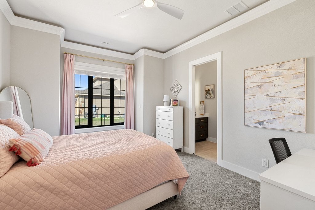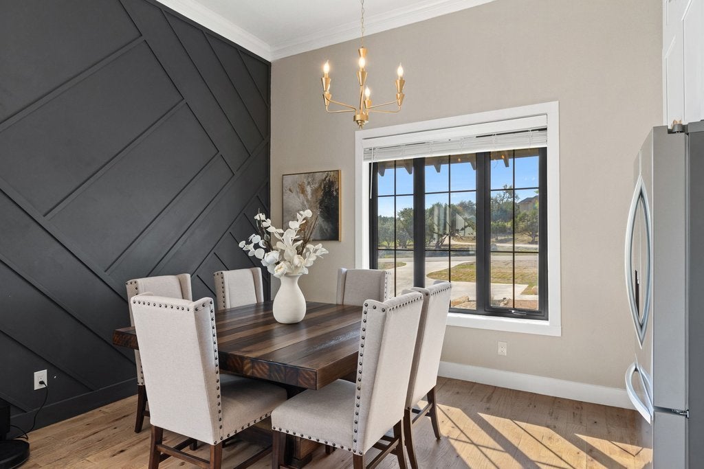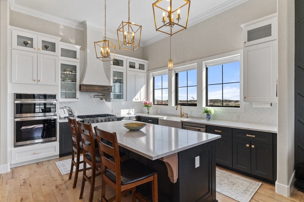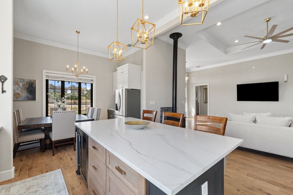 Welcome to your Hill Country retreat in the highly desirable Mountain Springs Ranch, thoughtfully crafted by Sisto Homes. Set on a full acre, this remarkable property showcases a blend of refined finishes, spacious design, and sweeping views of the surrounding landscape. From the moment you arrive, the home’s striking curb appeal and quality craftsmanship leave a lasting impression. Inside, 3,356 square feet of well-designed living space delivers both comfort and sophistication, highlighted by soaring 12-foot ceilings and an open-concept layout suited for everyday living and effortless gatherings. The kitchen anchors the home with high-end appliances, custom cabinetry, a propane stove, and an expansive island that flows seamlessly into the living and dining areas, while a separate formal dining room adds versatility. Oversized bifold doors open to the back patio, creating a seamless indoor-outdoor connection complete with an outdoor wood-burning stove. The home features generously sized bedrooms, including a luxurious primary suite designed as a private retreat with direct access to a peaceful deck and a bonus nursery or flex space, along with dual office areas ideal for work-from-home flexibility. Secondary bedrooms share a convenient Jack-and-Jill bath, while a private downstairs mother-in-law suite with a full bath provides an ideal space for guests or extended family. Additional spaces include a dedicated study and a game room, offering plenty of room to work and unwind. The oversized two-car garage includes a bonus area perfect for storage, a workshop, or hobby space. Outdoors, the expansive one-acre homesite offers endless possibilities—from creating a custom outdoor living area to adding a pool and enjoying the Texas Hill Country lifestyle. Located just minutes from Canyon Lake, the home provides easy access to boating, fishing, and scenic beauty, along with nearby schools, shopping, and dining.