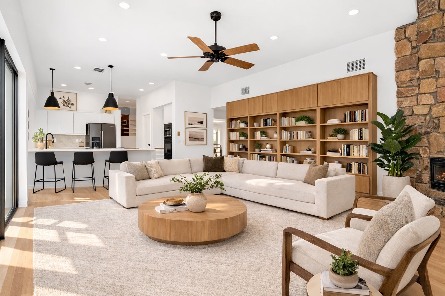- Family Room, Outside, Dining Room, Double Sided, Living Room, Raised Hearth, Stone, Wood Burning