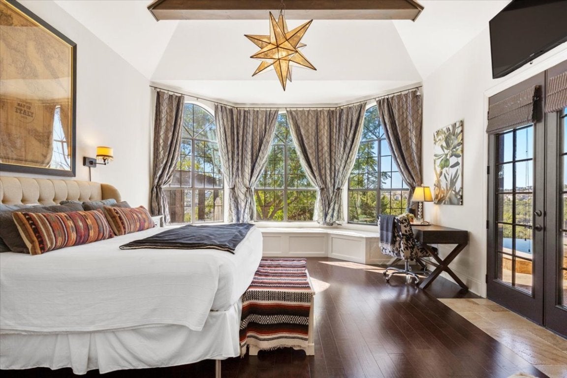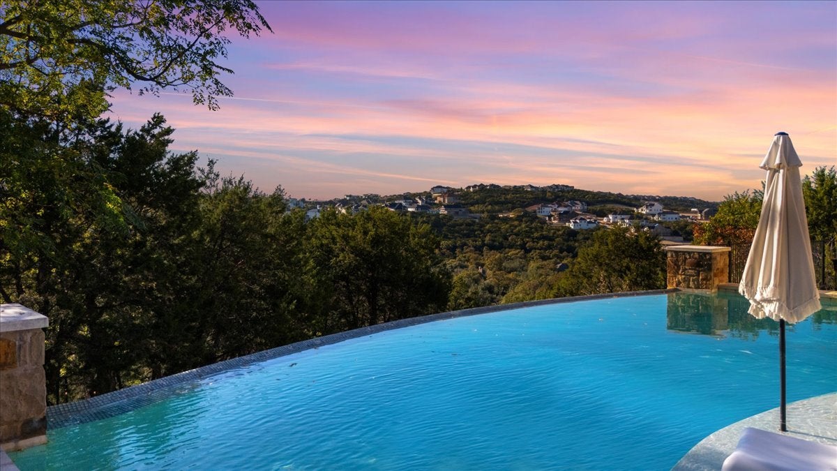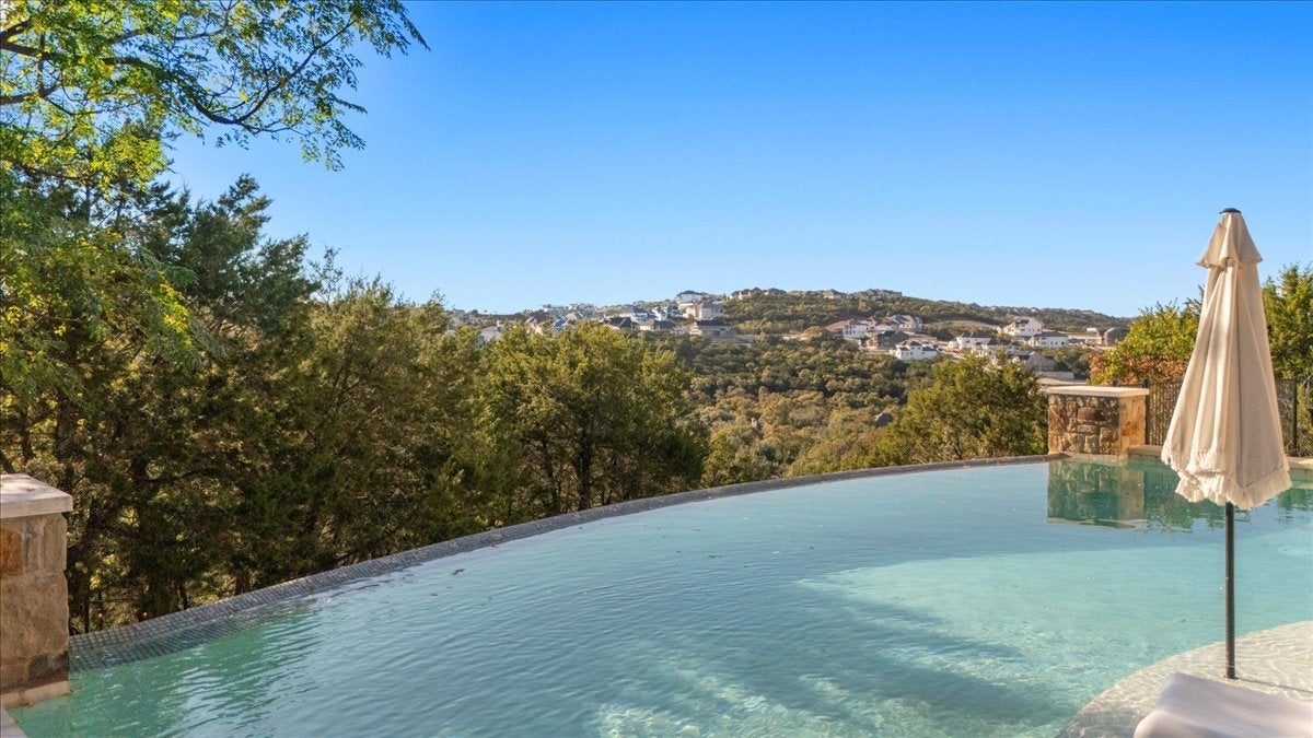 Privately positioned on a quiet cul-de-sac within the exclusive Grand Mesa community, this residence offers the perfect balance of refined elegance and resort-style living—complete with breathtaking views that extend endlessly across the hills. Every element of this home reflects meticulous craftsmanship and architectural mastery. The grand great room is a true showpiece, with six sets of 8’ double French doors that open to sweeping vistas, seamlessly merging indoor and outdoor living. The gourmet kitchen is designed to impress even the most discerning chef, featuring granite countertops, top-tier Jenn-Air stainless steel appliances, double ovens, and designer lighting. Step outside and indulge in your private resort retreat. Expansive dual-level decks overlook a spectacular infinity-edge pool that appears to merge with the horizon. Entertain under the stars at the fully equipped outdoor kitchen or unwind by the fire pit as you take in the endless views of the Hill Country. The main residence offers four luxurious bedrooms and three and a half baths, including a serene owner’s suite with a private balcony and spa-inspired bath that has French doors opening onto the stunning panoramic views of the outdoor patio. Take note of a downstairs bedroom complete with en suite bath that would make perfect mother-in-law quarters. A detached garage apartment extends the estate’s versatility with two additional bedrooms, a full bath, and a comfortable living area—ideal for guests, extended family, or private staff quarters. Set on 1.184 acres of pristine landscape, this 3,433-square-foot main home plus 702-square-foot guest residence embodies the pinnacle of luxury living. From its timeless Tuscan architecture to its awe-inspiring Hill Country panoramas, this is more than a home—it’s a statement of elegance, privacy, and distinction. Discover the ultimate in refined living at this Grand Mesa masterpiece—where every sunset feels like a work of art. Welcome home!!