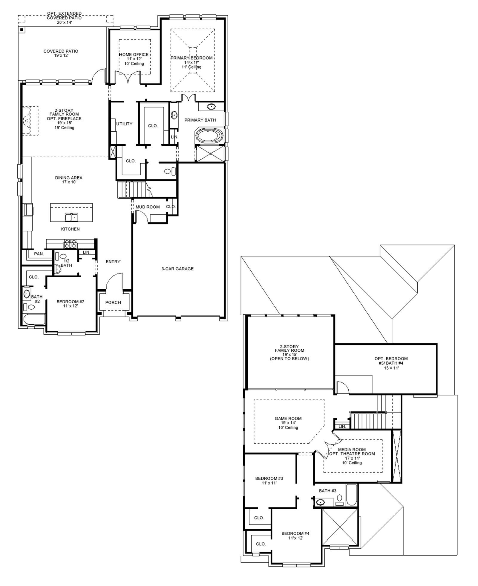 Front porch opens into the entryway. A private guest suite off the main hallway features a full bathroom and walk-in closet. The kitchen hosts an island with built-in seating, a 5-burner gas cooktop, and corner walk-in pantry. The dining area connects the living spaces. The two-story family room boasts a wall of windows and the entrance to the extended covered backyard patio. French doors open into the home office off of the family room. The primary bedroom hosts a wall of windows. The primary suite offers dual vanities, a freestanding tub, glass enclosed shower, two walk-in closets and dual access to the utility room. On the second level you enter the game room with ample natural light. French doors open into the media room. Secondary bedrooms with walk-in closets and a full bathroom complete the upstairs. The mud room with storage is located off of the three-car garage.