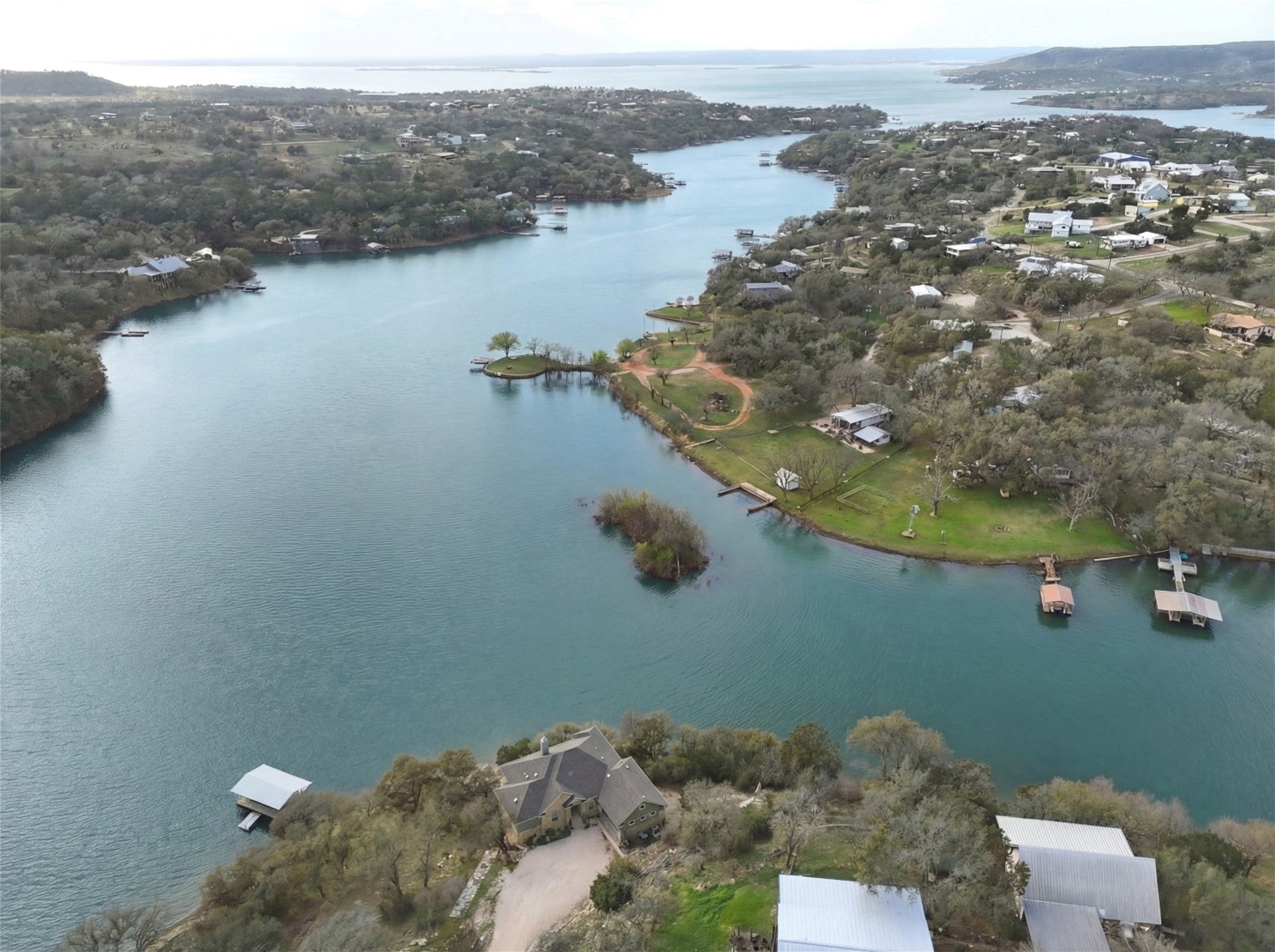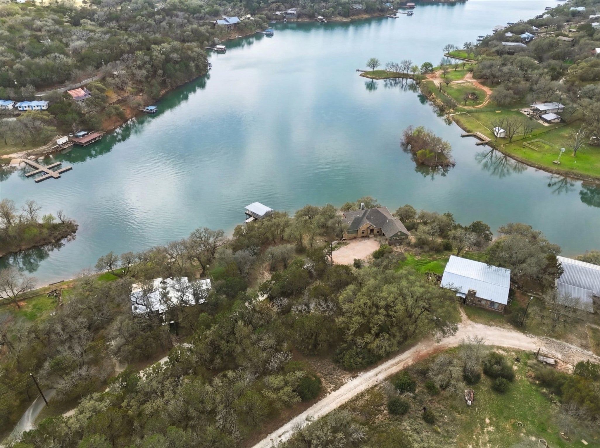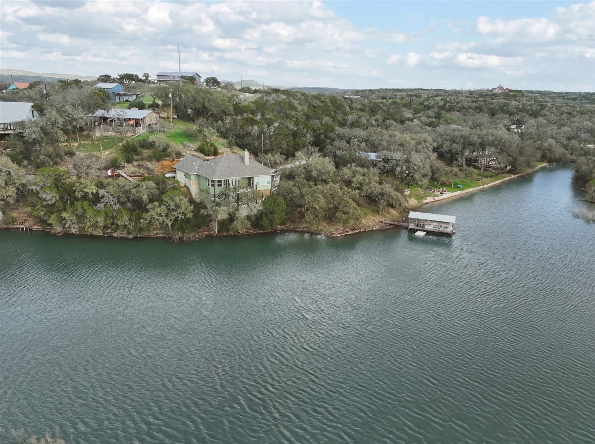 Waterfront living on Lake Buchanan! This quiet 4 bedroom, 2.5 bath custom home offers incredible Hill Country views and a peaceful, secluded setting with 485+/- feet of shoreline. Located at the end of a private dead-end street, the home features tray ceilings and a flat driveway with plenty of parking and space to turn around. Two levels of covered back porches stretch across the rear of the home, creating the perfect space to relax, entertain, and take in the expansive lake views. Enjoy direct access to the water with a private boat dock (in a No Wake part of the lake) making boating, fishing, and lake days effortless. Approximately 600 sqft of unfinished space on the lower level awaits your custom design—game room, additional living space, bedrooms, you decide! Whether as a full-time residence or weekend retreat, this property captures the best of casual Texas Hill Country lakefront living.