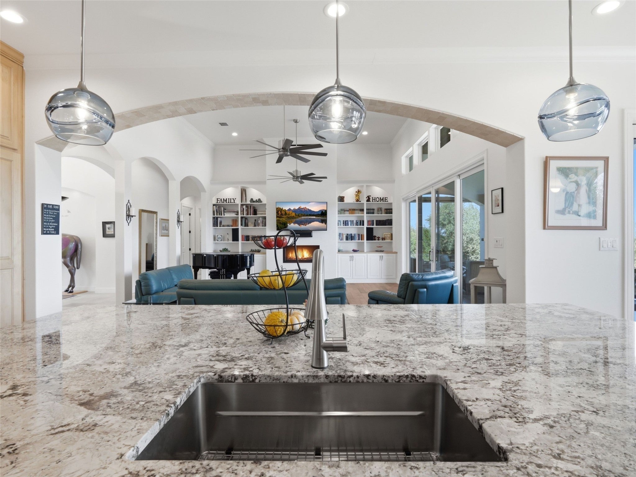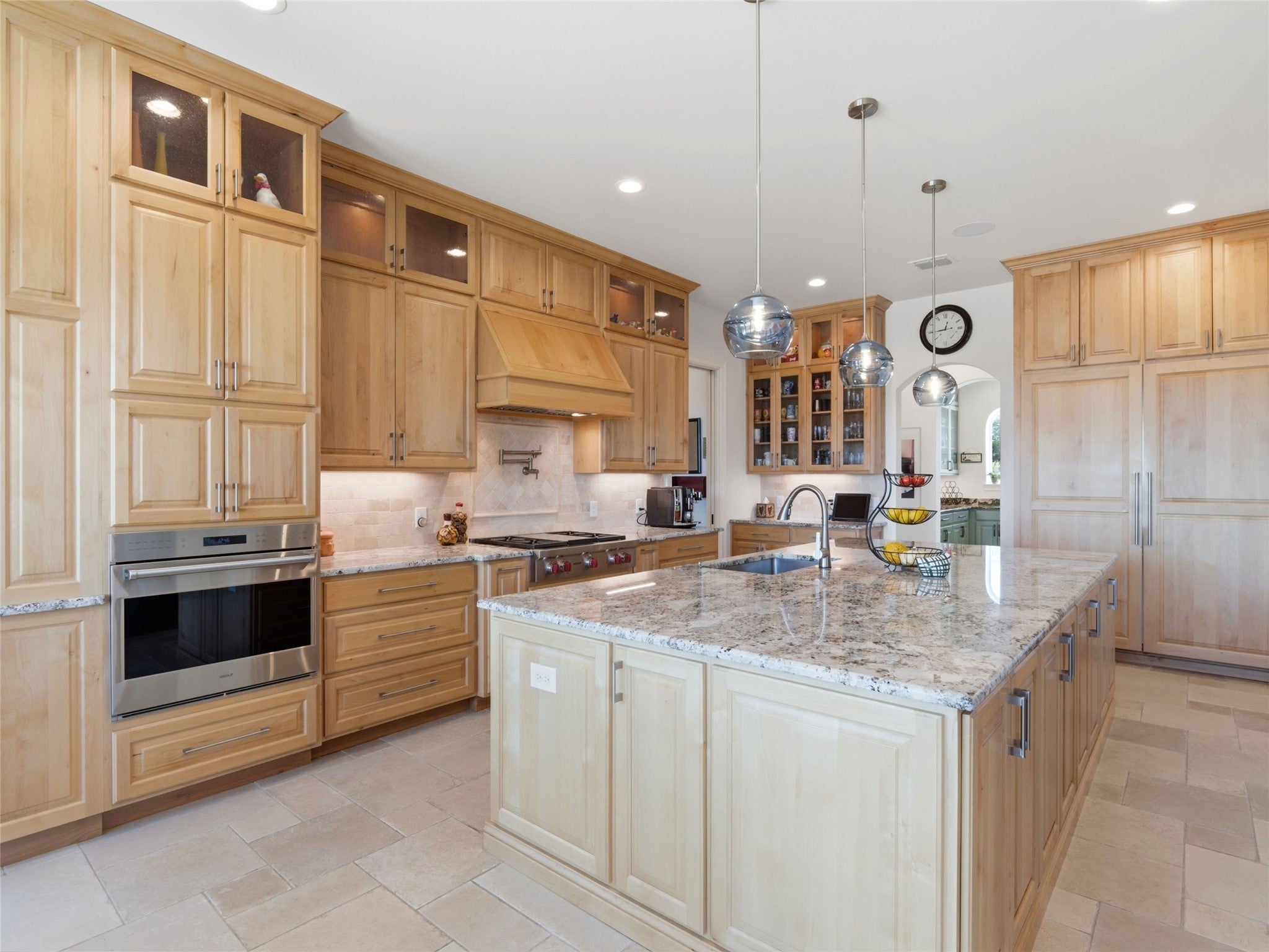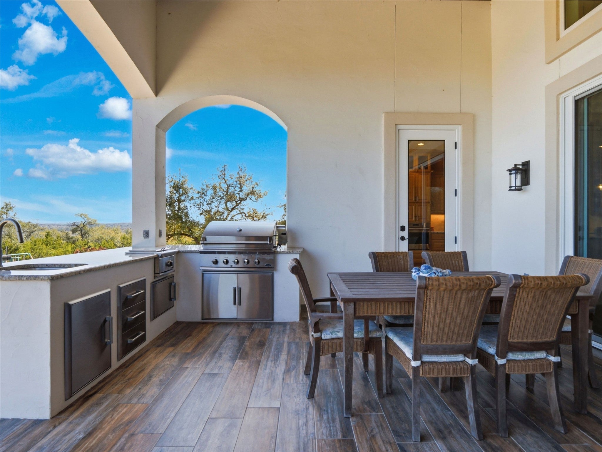 Set at the end of a quiet cul-de-sac in Cordova Bend, this meticulously constructed residence captures sweeping lake and Hill Country views while offering exceptional indoor-outdoor living designed for both everyday comfort and elevated entertaining. A metal-and-glass entry door opens to a dramatic foyer with vaulted ceilings and Italian tile flooring, drawing the eye through the home toward the lake beyond. The main living area features soaring 14-foot ceilings, custom built-ins, and a gas fireplace, while oversized windows frame the lake and surrounding landscape. The chef’s kitchen blends beauty and performance with a Sub-Zero refrigerator, Wolf appliances, pot filler, knot-free alder cabinetry, and a striking one-piece granite island. A spacious butler’s pantry with granite counters, sink, and abundant storage serves as an additional prep area, ideal for hosting, while the formal dining room sits adjacent to a fully appointed wet bar for seamless entertaining. The primary suite offers a private retreat complete with a custom-designed sauna. A guest bath reinforced as a tornado shelter reflects the home’s thoughtful engineering. Built with a Class 3 hail-resistant concrete tile roof, the home was designed with durability and longevity in mind. Outside, a large covered patio with fireplace and outdoor kitchen overlooks the pool and spa while taking in expansive lake and Hill Country views, creating an ideal setting for relaxed evenings or larger gatherings. Additional features include a three-car epoxy-floored garage with WiFi-enabled LiftMaster openers, insulated doors, dedicated workshop space, surround sound with in-wall speakers, mudroom storage, irrigation system, and professionally landscaped grounds. A rare opportunity to own a beautifully built custom home combining lake views, privacy, luxury amenities, and exceptional construction quality in one of Canyon Lake’s most desirable settings.