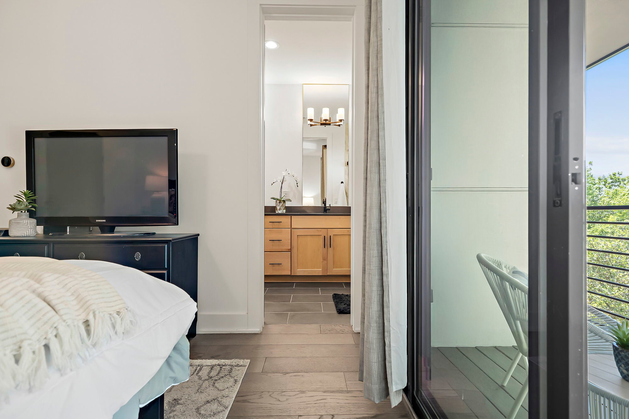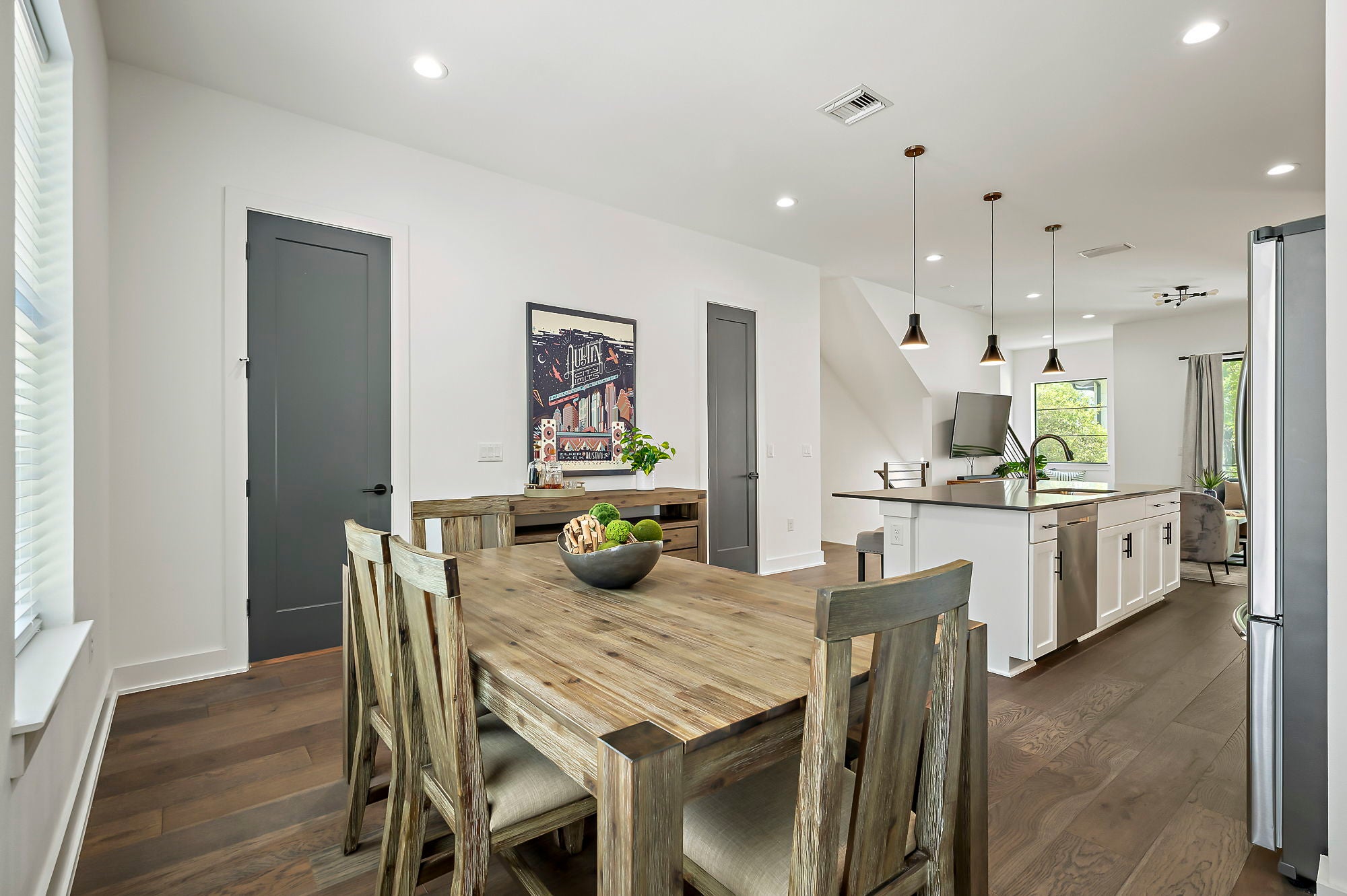 Exceptional by Design. Priced to Sell. Only in 78704. Tucked beneath a canopy of mature trees, this newer construction townhome opens to soaring ceilings, clean contemporary lines, and natural light that pours through oversized windows into an open-concept layout that balances effortless entertaining with the beauty of how you actually live. Whether you're hosting a crowd or settling in for a quiet night, the flow just works. The kitchen is the kind you actually want to cook in: professional-grade appliances, gorgeous cabinetry with ample storage, and an oversized island with generous bar seating that draws everyone in. The adjacent dining room has genuine square footage — a real table, real chairs, room to breathe. Three spacious bedrooms, each with its own fully appointed en-suite bath — no sharing, no compromising. The primary suite is a proper retreat with a luxurious bathroom and excellent closet space. A stylish guest half-bath rounds out the layout, along with storage that will genuinely catch you off guard. Step onto any of the three private balconies and you're overlooking a lush, tree-filled green space that feels like a world away — morning coffee, evening wine, or just fresh air whenever you need it. At ground level, Adirondack chairs circle a fire pit under towering live oaks, with a grill area ready for company. The garage fits two full-size cars side by side — not tandem, not a tight squeeze. In 78704, that's rarer than you'd think. 78704 isn't a zip code so much as a way of life. Weekend mornings start at Radio Coffee. Friday nights end at the Broken Spoke. In between, there's Matt's El Rancho for a cold margarita, Loro for a long lunch, and Barton Springs for when you need to remember why you love Austin. South Congress is a stroll away, Zilker Park is practically your backyard, and downtown is close enough to be convenient without being on top of you. This is the zip code people move to Austin for — and once they're in it, they don't leave.
