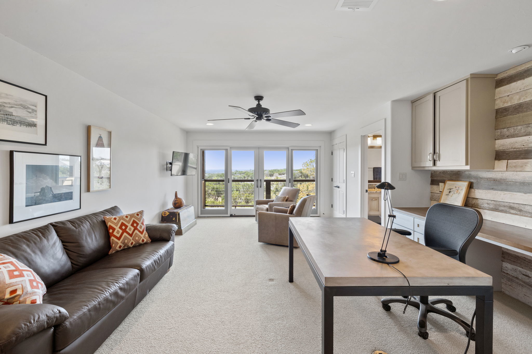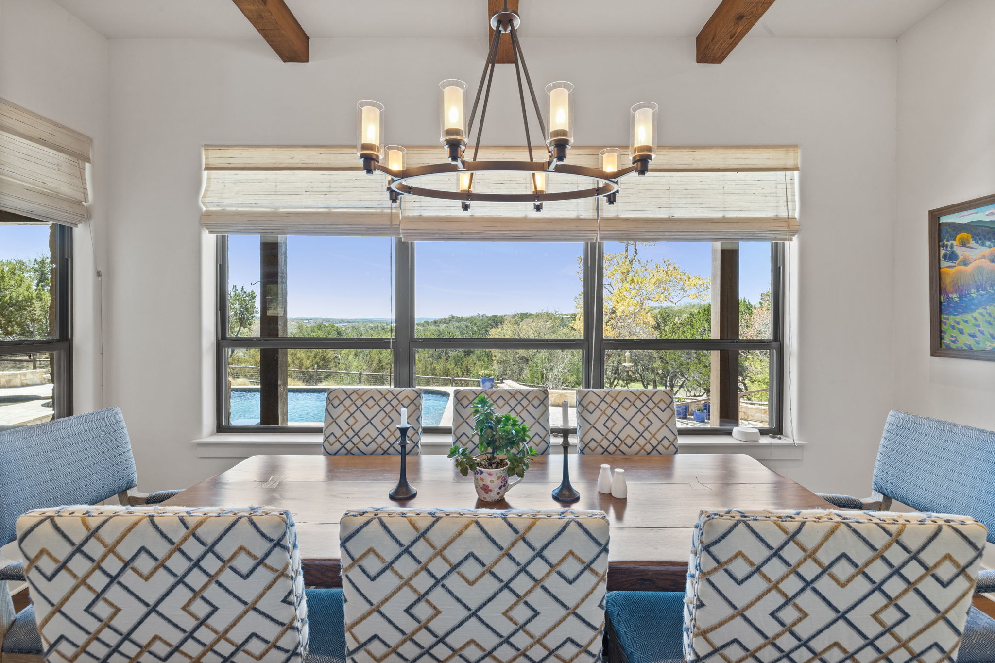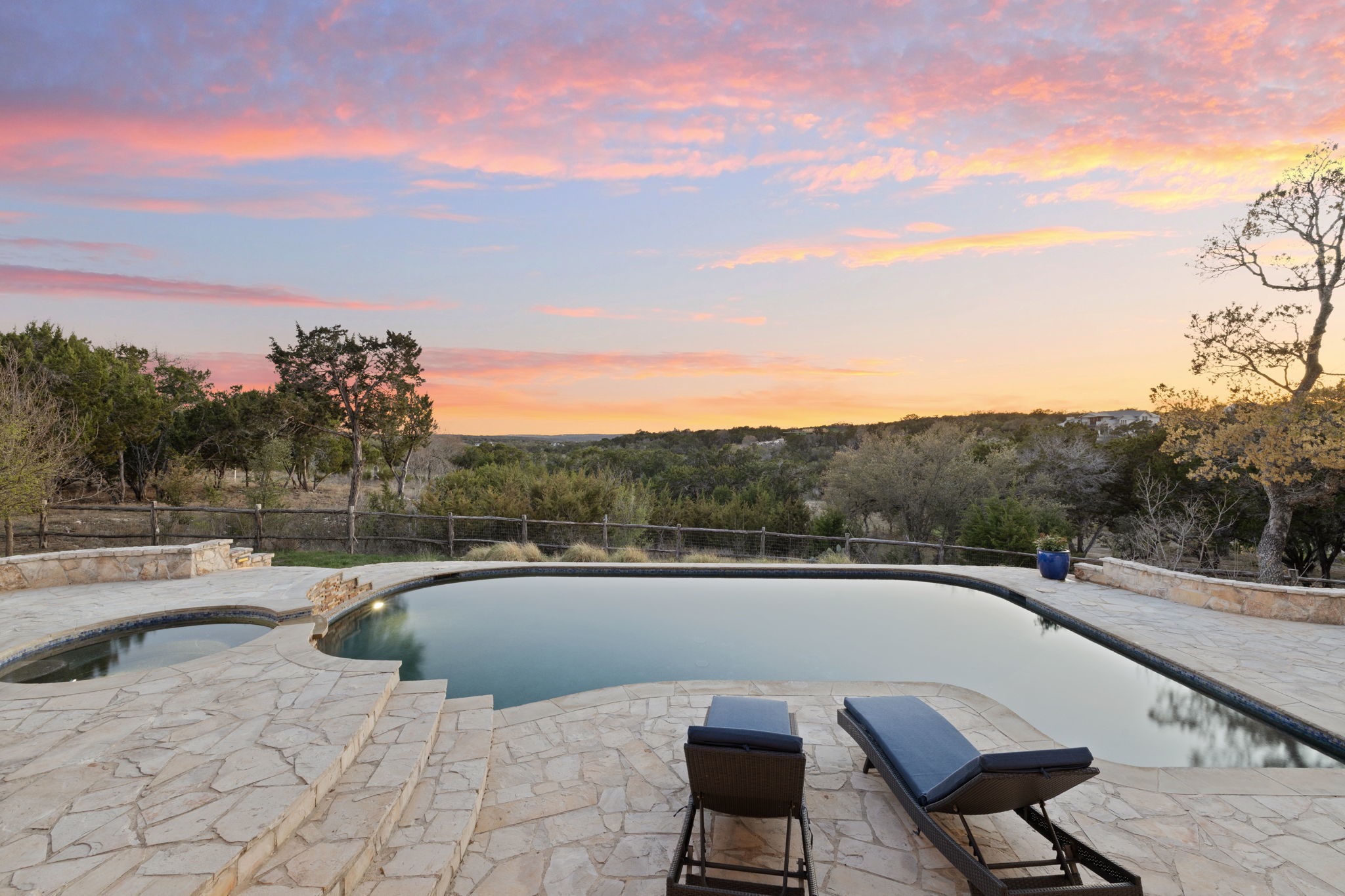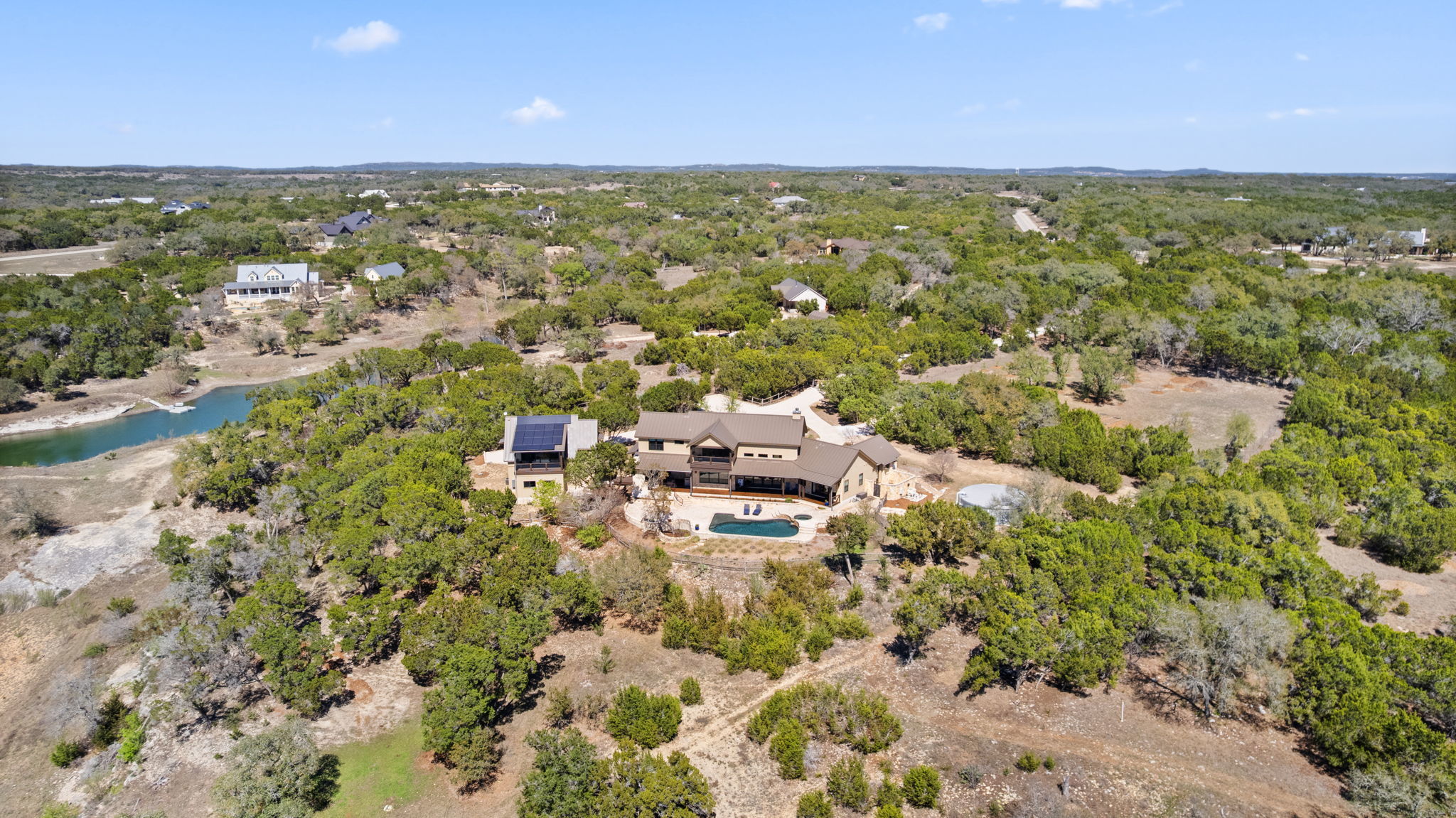 Discover the beauty of this thoughtfully designed home, ideally situated to capture the scenic allure of the Texas Hill Country. Offering breathtaking, unobstructed views, this home is crafted with an emphasis on privacy and hospitality. The layout features an expansive open kitchen, dining, and great room, which serve as a natural gathering spot for family and friends. Surrounding the heart of the home at one end is a spacious master suite with a pocket office, and on the opposite end, a generous guest suite which opens on to the outdoor living space complete with a kiva fireplace and views of the pool and valley. The second floor includes a third bedroom and bath as well as a bonus room with a spectacular view, which could be used as a study, game room, or a fourth bedroom. Additionally, the property includes an attractive and inviting guest house featuring 1 bedroom, 1 bath, a kitchen, and a deck with scenic views—perfect for hosting guests. Emphasizing sustainability, this property boasts eco-friendly rainwater collection and a water well. Additionally, a privately owned solar system provides cost effective and reliable energy. The north-facing orientation combined with thick insulation ensures year-round comfort throughout every season. Ideally located within the friendly Mustang Valley community, you'll enjoy access to nearby lake and park areas, enhancing your lifestyle with outdoor activities and social opportunities. Mustang Valley’s dark sky emphasis means you can the relish clear, starry nights. The acreage is ag-exempt, providing open space and lower taxes. Adjoining unimproved Lot 36 is available separately (ABOR MLS #2768701) or additionally with subject property for a total 18+/- acres with lakefront. This inviting home harmoniously blends comfort, sustainability, and community, making it an exceptional choice for those seeking a peaceful Texas Hill Country retreat. Don’t miss your chance to call this captivating property your own!