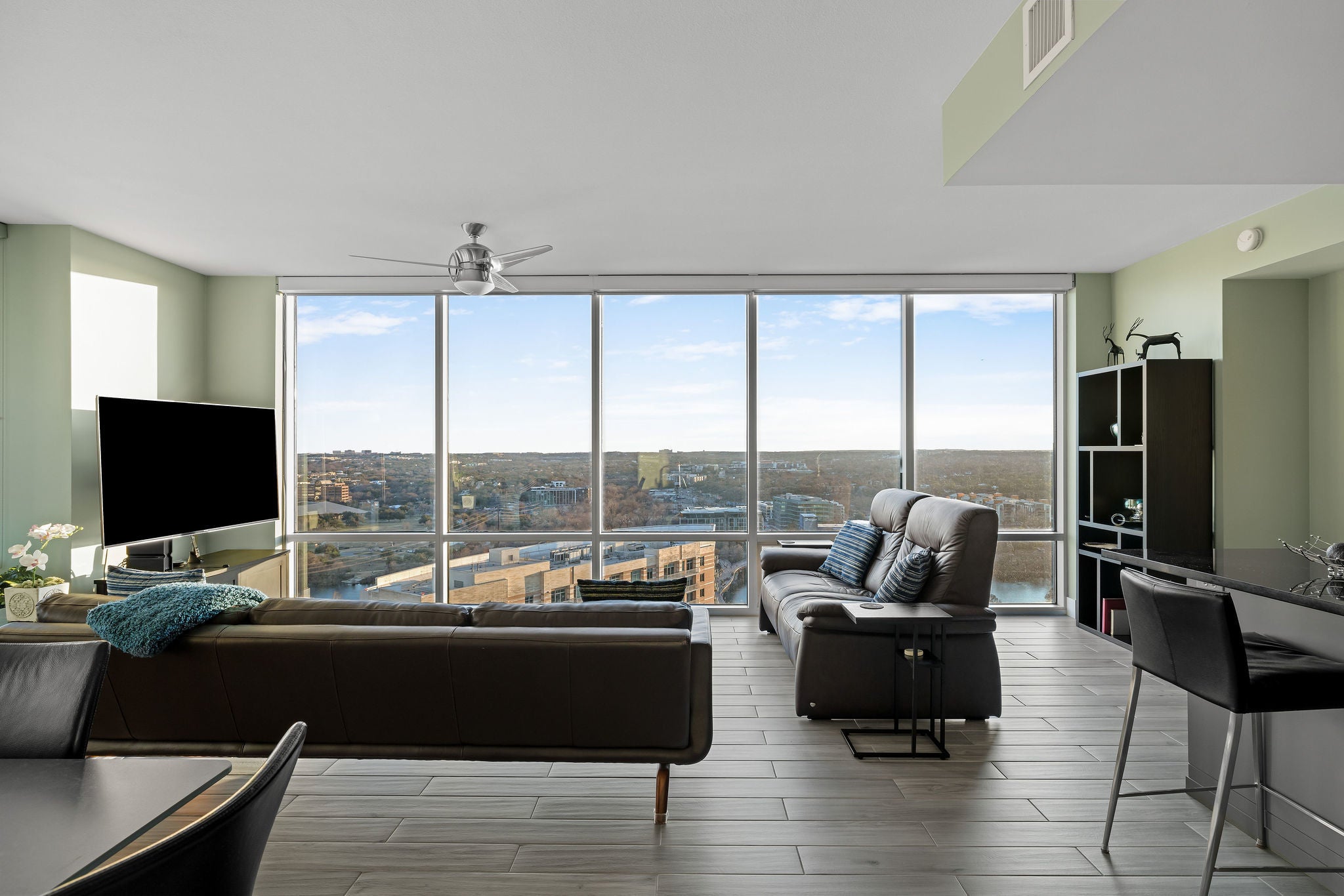 Experience elevated downtown living at Spring Condominiums with breathtaking, front-on views of Lady Bird Lake & the Pfluger Pedestrian Bridge. This immaculate corner âFâ floorplan one of only a few in the building & the only one currently available offers dramatic floor-to-ceiling windows showcasing panoramic vistas of the skyline, greenbelt, & sweeping Hill Country sunsets. The coveted south-facing orientation fills the home with natural light & beautiful daytime views. Thoughtfully remodeled within the past three years, the residence is fully turnkey & meticulously maintained. The open-concept living & dining areas flow seamlessly to two private balconies, creating an ideal setting for entertaining or quiet evenings above the city. The kitchen features Black Galaxy granite countertops, gas cooking, Bosch stainless steel appliances, a Whirlpool refrigerator, & solid core doors throughout. Additional highlights include custom tile in the primary shower, motorized window shades & sunshades, recessed lighting with updated designer fixtures, a remote-operated ceiling fan in the great room, three-zone air conditioning, & custom closets. Floor-to-ceiling double-paned windows enhance energy efficiency & comfort, & an in-unit GE high-efficiency stackable washer & dryer convey. This well-maintained, smoke-free, pet-free home includes two premier parking spaces & a basement storage unit. Austin Energy has awarded Spring Condominium a Green Building rating. For more info, go to: https://wkf.ms/3O3tMWk