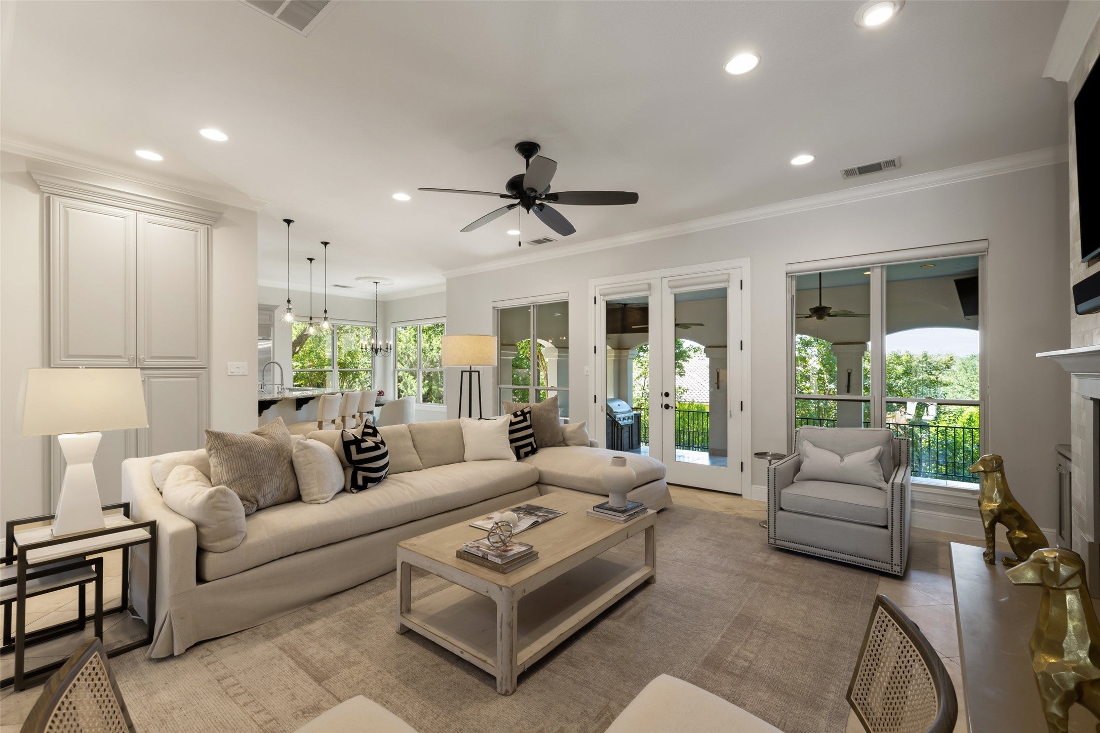 110 Golden Bear Drive combines Hill Country beauty with resort-style living inside the prestigious, guard-gated golf community of Flint Rock Falls. Overlooking rolling views, this 4-bedroom, 4-bathroom home is thoughtfully designed with generous living and entertaining spaces across two levels, blending elegance with everyday comfort. On the main floor, the expansive primary suite is a true retreat, offering an additional sitting area, a spa-like bathroom with dual vanities, soaking tub, walk-in shower, and ample closet space. A private office and formal dining room enhance the home’s versatility, while the family room with its cozy fireplace and custom built-ins serves as the heart of the home. The light-filled kitchen and breakfast nook open seamlessly to this space, making it ideal for gatherings both large and small. Upstairs, a large media room creates the perfect setting for movie nights or game days, while three additional bedrooms provide plenty of room for family or guests. From the upper-level balcony, sweeping Hill Country vistas set the stage for relaxation and quiet moments. Outdoors, the property is designed for enjoyment year-round. A spacious covered porch with a built-in grill invites al fresco dining and entertaining, while the surrounding grassy yard offers space for play, pets, or simply soaking in the peaceful golf course setting. Nestled in sought-after Flint Rock Falls, this home offers not only security and privacy but also close proximity to Lakeway amenities, Lake Travis schools, golf, dining, and the natural beauty of Lake Travis. 110 Golden Bear Drive is more than a home, it’s a lifestyle of comfort, convenience, and Hill Country charm.
