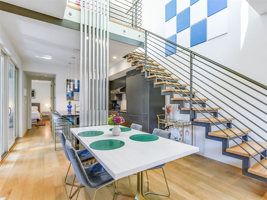 Modern, light-filled, and impeccably designed, this like-new three-story end-unit townhome offers a rare ownership opportunity in the heart of Old Enfield—one of Austin’s most established and sought-after neighborhoods. Distinctive architectural elements include custom sculptural metalwork crafted from brushed aluminum and dramatic floating staircases that set the tone for a sophisticated, contemporary living experience. The thoughtfully planned layout provides exceptional privacy, with the primary suite located on the first level and a separate third-floor secondary or guest suite, ideal for visiting family, guests, or a dedicated home office. High-end finishes are featured throughout, including white oak flooring, honed granite countertops, designer fixtures, and premium appliances such as a Wolf range, Sub-Zero refrigerator and Miele washer/dryer set. Unit D also offers a covered patio and gated private yard with low-maintenance turf, creating a seamless indoor-outdoor lifestyle. From the upper level, enjoy unobstructed views of Downtown Austin, an increasingly rare feature in this historic central neighborhood. Additional highlights include covered parking and pre-wiring for a private electric vehicle charging station. The location delivers unmatched walkability to top dining, neighborhood markets, and some of Austin’s most loved green spaces, including Pease Park and the Shoal Creek hike-and-bike trail. A true lock-and-leave residence that combines modern design, privacy, and location. This is an exceptional opportunity to own in Old Enfield.