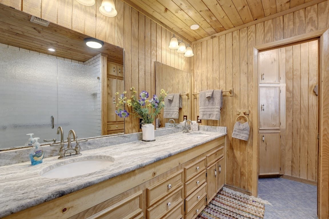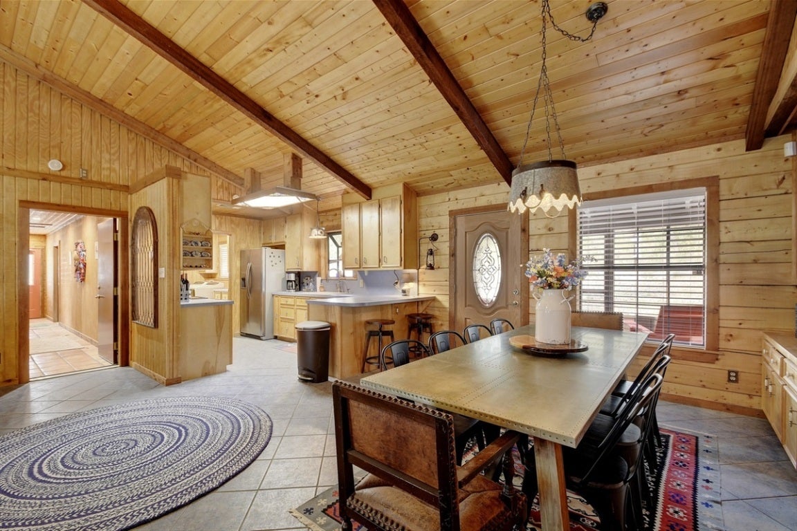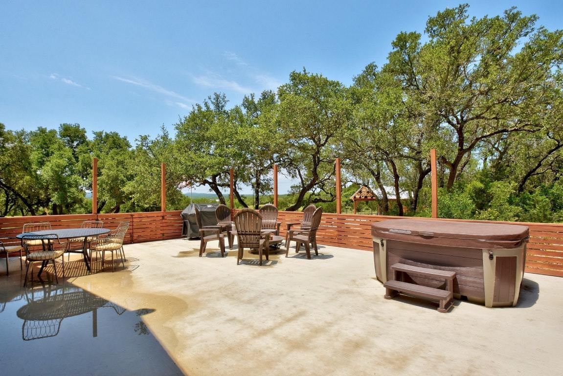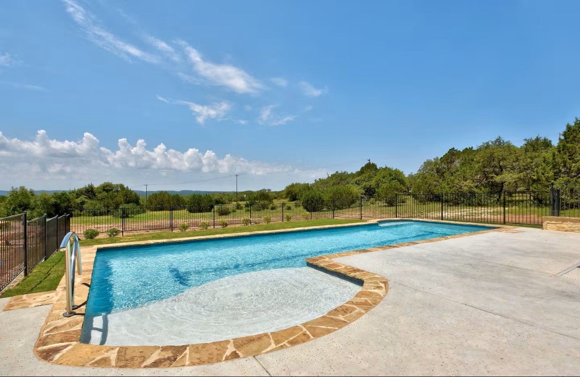 Long-distance views highlight this unique custom-built home featuring 7-inch log exterior walls. Privately nestled off the road, in the hill country on nearly 8 acres, the property offers exceptional seclusion and tranquility. Currently configured as a 5-bedroom, 4-bathroom STR, it is well-suited for a full time residence, a second home home, or an investment property. Additional improvements include a 3-bay, 1,200 sq. ft. garage ideal for RV parking or storage. Doors are 10' x 10', one bay is insulated and has AC. Enjoy a serene waterfall flowing into a koi pond with a charming bridge leading to a shaded sitting area. Outdoor living spaces include a screened back porch, a large side patio with a hot tub and propane grill, and a fenced swimming pool with a shaded pavilion. Water well storage holding tank in place. Ample room to build an additional home.