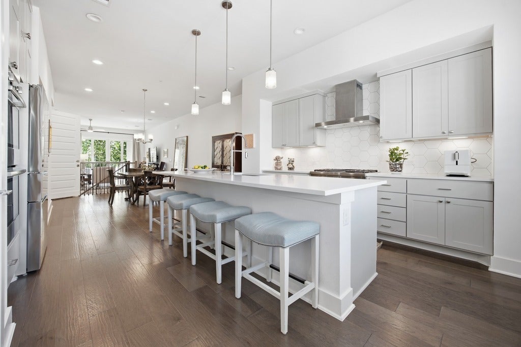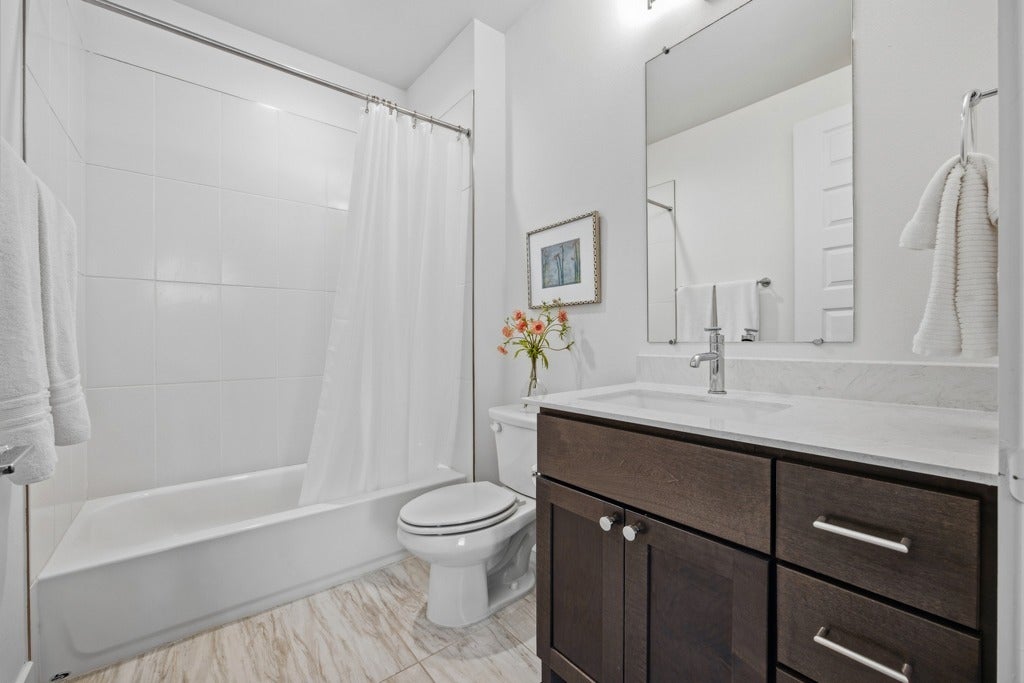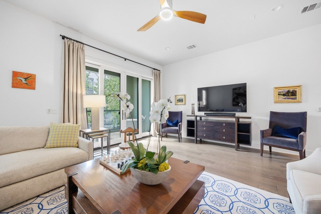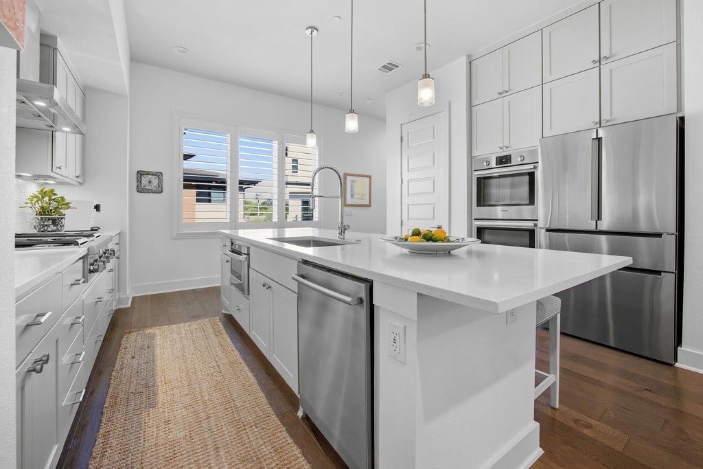 Welcome to easy, elevated living in this beautifully designed multi-level condo near Central Austin, where comfort and convenience come together in a truly inviting way. Enter from a charming, tree-lined street into a thoughtfully laid out home filled with natural light, offering a relaxed, lock-and-leave lifestyle with the added bonus of a private elevator connecting every level. The entry level welcomes you with a warm foyer, a versatile guest bedroom with a built-in Murphy bed and private bath, plus two built-in workspaces that are perfect for working from home or staying organized. You’ll also find direct garage access, extra storage, and seamless elevator access to the upper floors. Upstairs, the main living level is open and airy, creating a natural gathering space for everyday living. The kitchen is both functional and beautiful, featuring an oversized island, quartz countertops, gas cooktop, double ovens, and a distinctive honeycomb backsplash. It flows easily into the dining and living areas, making it just as suited for quiet evenings as it is for hosting. Step out onto the balcony to enjoy a breath of fresh air or your morning coffee. The top floor offers a peaceful retreat with a spacious primary suite, complete with built-in shelving and a spa-like bath featuring a soaking tub, walk-in shower, and dual vanities. An additional bedroom with its own private bath and walk-in closet provides comfort and privacy for guests or family. Throughout the home, you’ll notice thoughtful touches like plantation shutters, custom lighting and fans, built-ins, and smart home features that make daily life feel just a bit easier. Located in the heart of The Grove, this walkable neighborhood puts green space, walking paths, community gathering spots, dining, shopping, and everyday conveniences all within easy reach. With a welcoming front courtyard and access to parks, a pond, grilling areas, and more, this is a place where you can truly settle in and enjoy the lifestyle.
