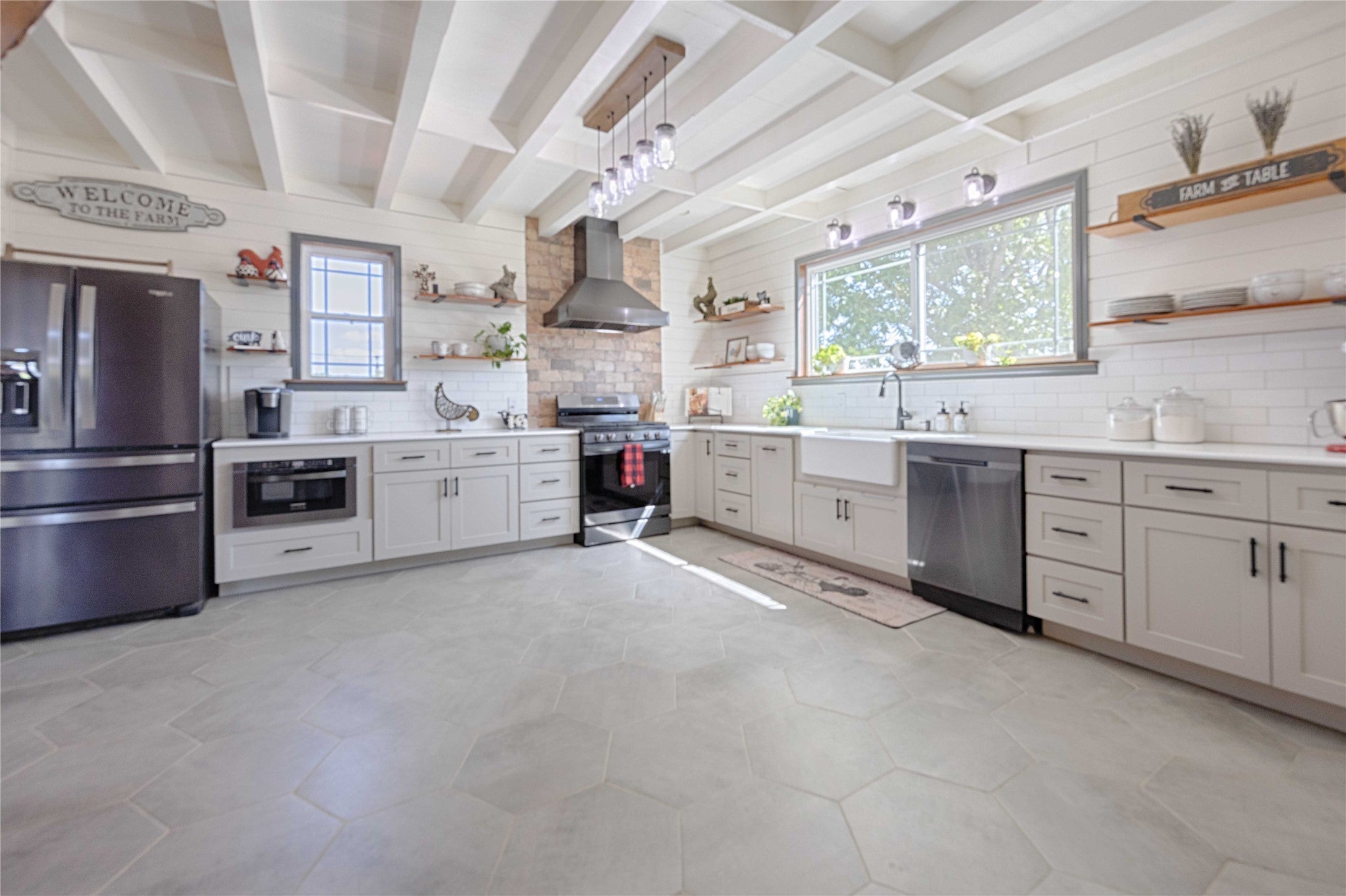 - Dishwasher, Gas Range, Microwave, Range Hood, Stainless Steel Appliance(s)