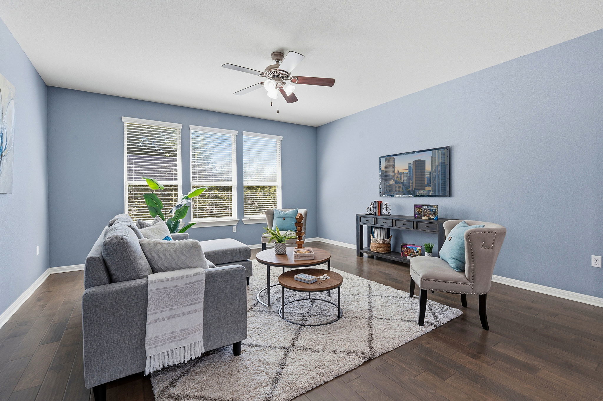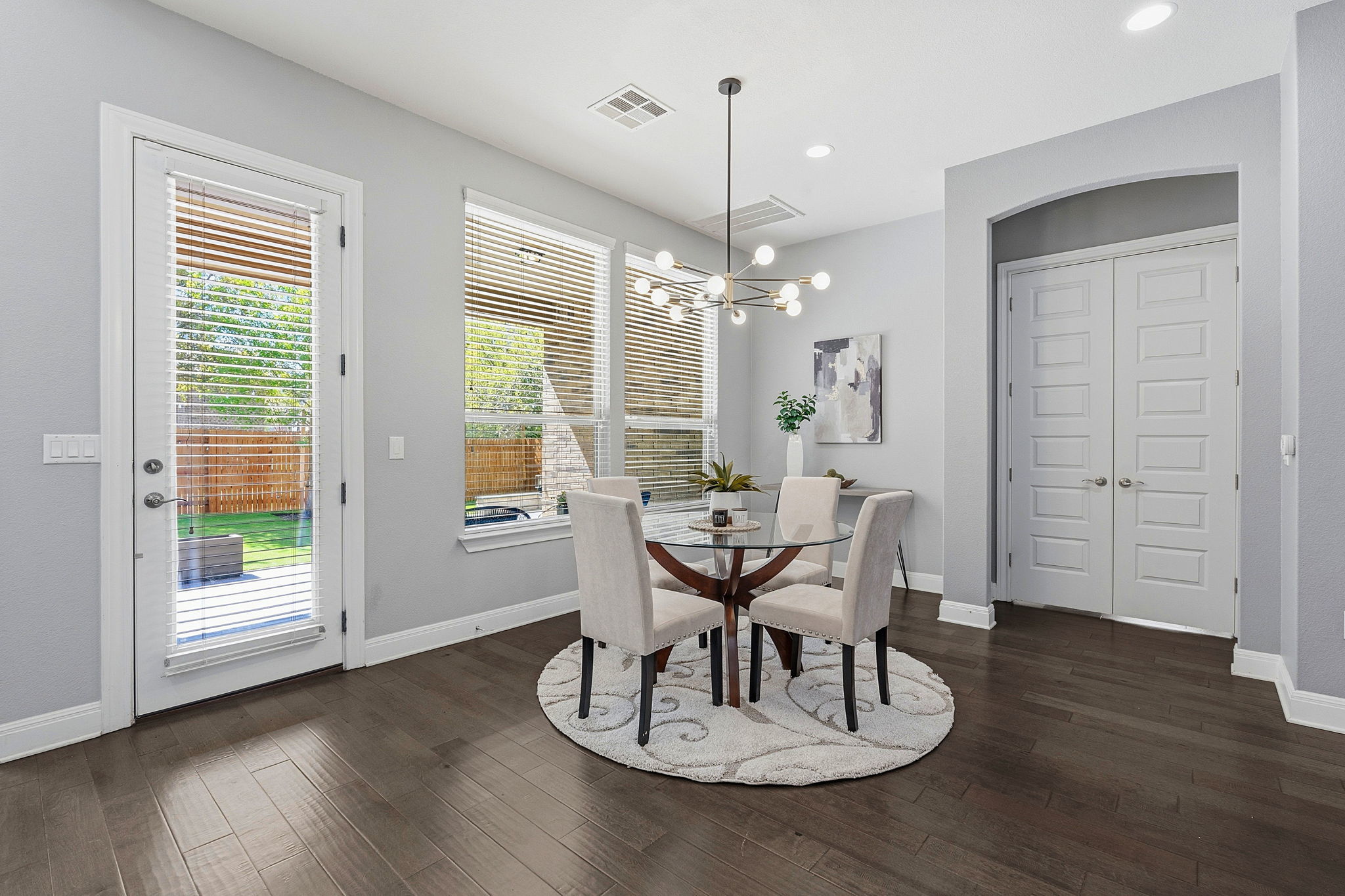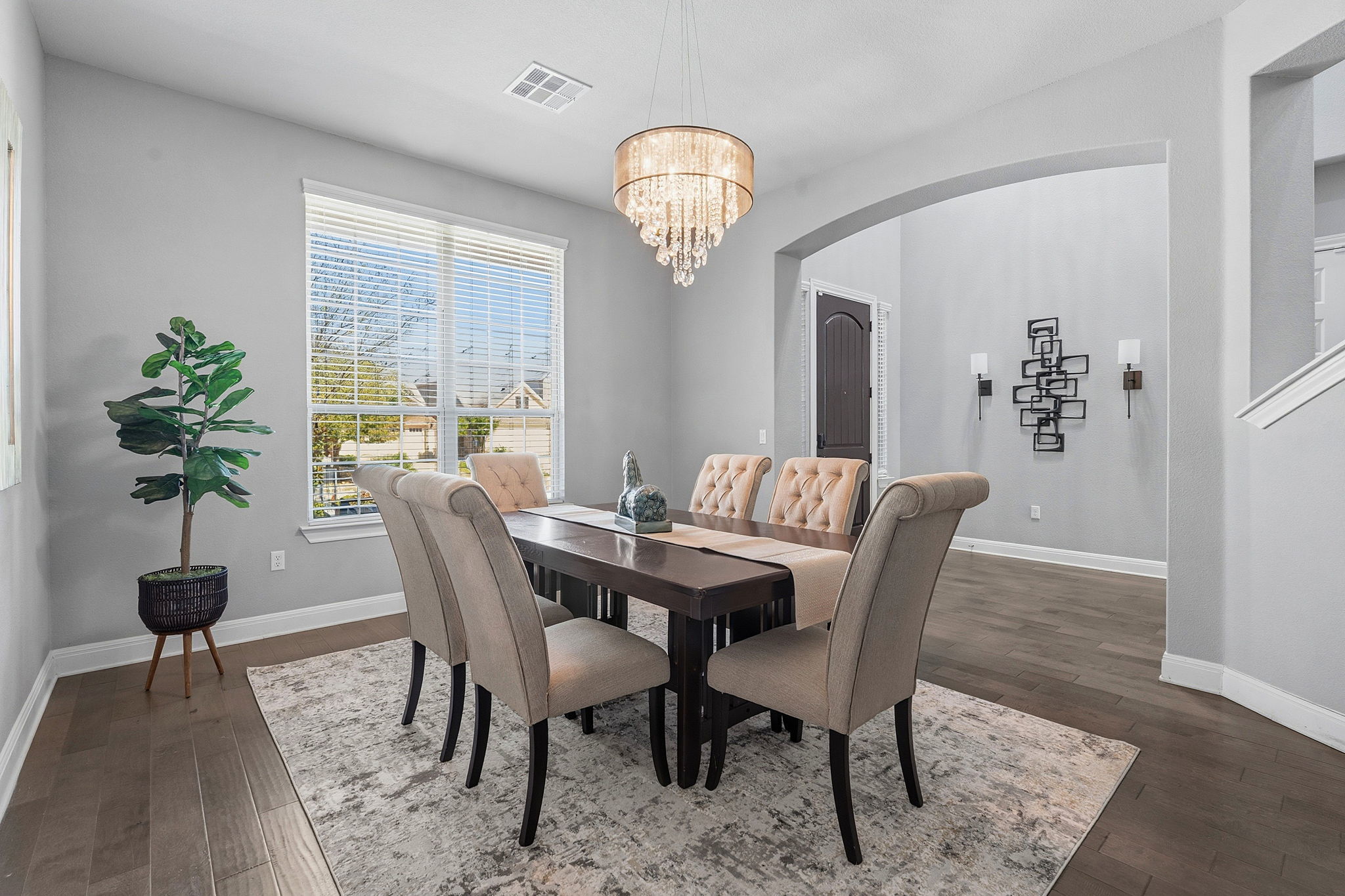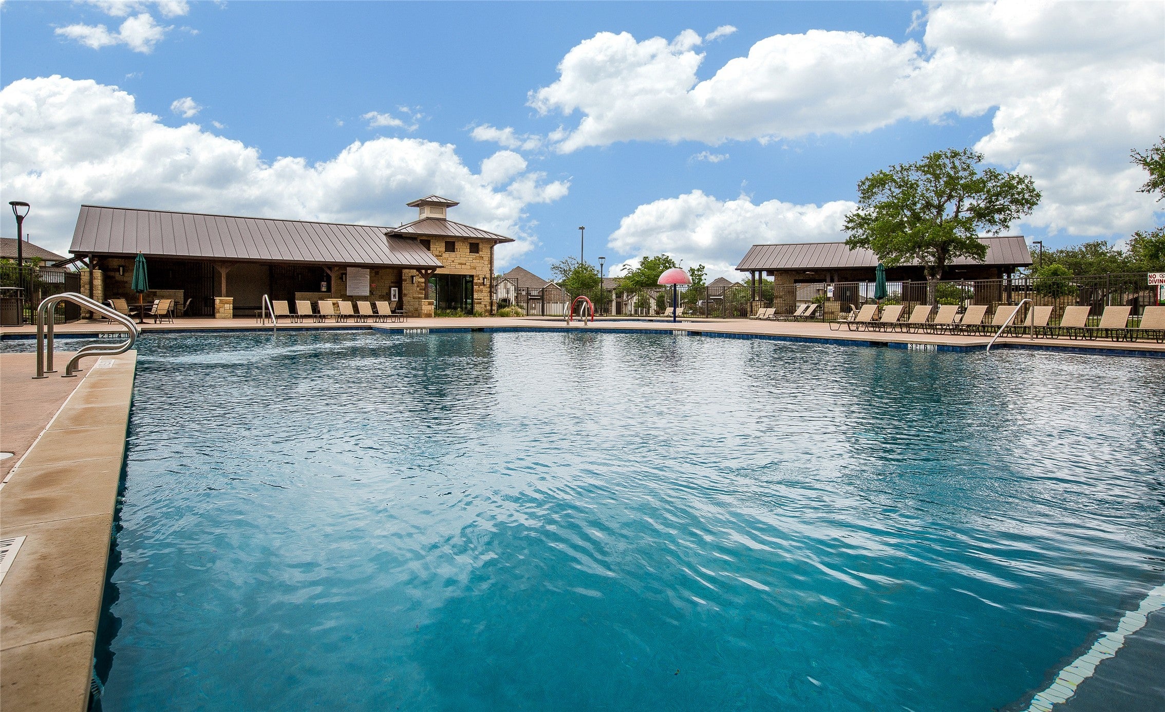 Welcome to this beautifully appointed north-facing residence, where timeless design meets modern comfort. Featuring 5 spacious bedrooms, 4 full baths, and a desirable 3-car garage, this home is thoughtfully designed for everyday living and entertaining. Step inside to a grand foyer with soaring double-height ceilings that set the tone for the elegant interior. Rich wood flooring flows throughout the main living areas, complemented by a striking contemporary chandelier. A dedicated office with French doors offers the perfect work-from-home space. The oversized living room is filled with natural light and offers backyard views, seamlessly connecting to the breakfast area and kitchen in an open-concept layout. The chef-inspired kitchen features granite countertops, a large center island, gas cooktop with vent hood, white cabinetry, under-cabinet lighting, recessed lights, and a spacious walk-in pantry. A butler’s pantry connects the kitchen and formal dining room, making entertaining effortless. The main level includes two bedrooms and two full baths—ideal for guests or multi-generational living. The primary suite is a true retreat with a versatile flex space perfect for a sitting area, home gym, office, or nursery. The spa-like bath showcases dual vanities, a walk-in shower, garden tub, and a custom-designed walk-in closet. Upstairs, enjoy a game room, media room—perfect for movie nights—and three secondary bedrooms with two full baths. Step outside to a beautifully designed outdoor living space with a covered patio, elegant tile flooring, extended patio, and string lights for ambiance. The backyard features low-maintenance turf and a dedicated sport court—ideal for recreation and relaxation. Located within highly regarded Round Rock ISD, including England Elementary, with convenient access to major highways, shopping, dining, and employers—offering comfort, style, and an exceptional location.