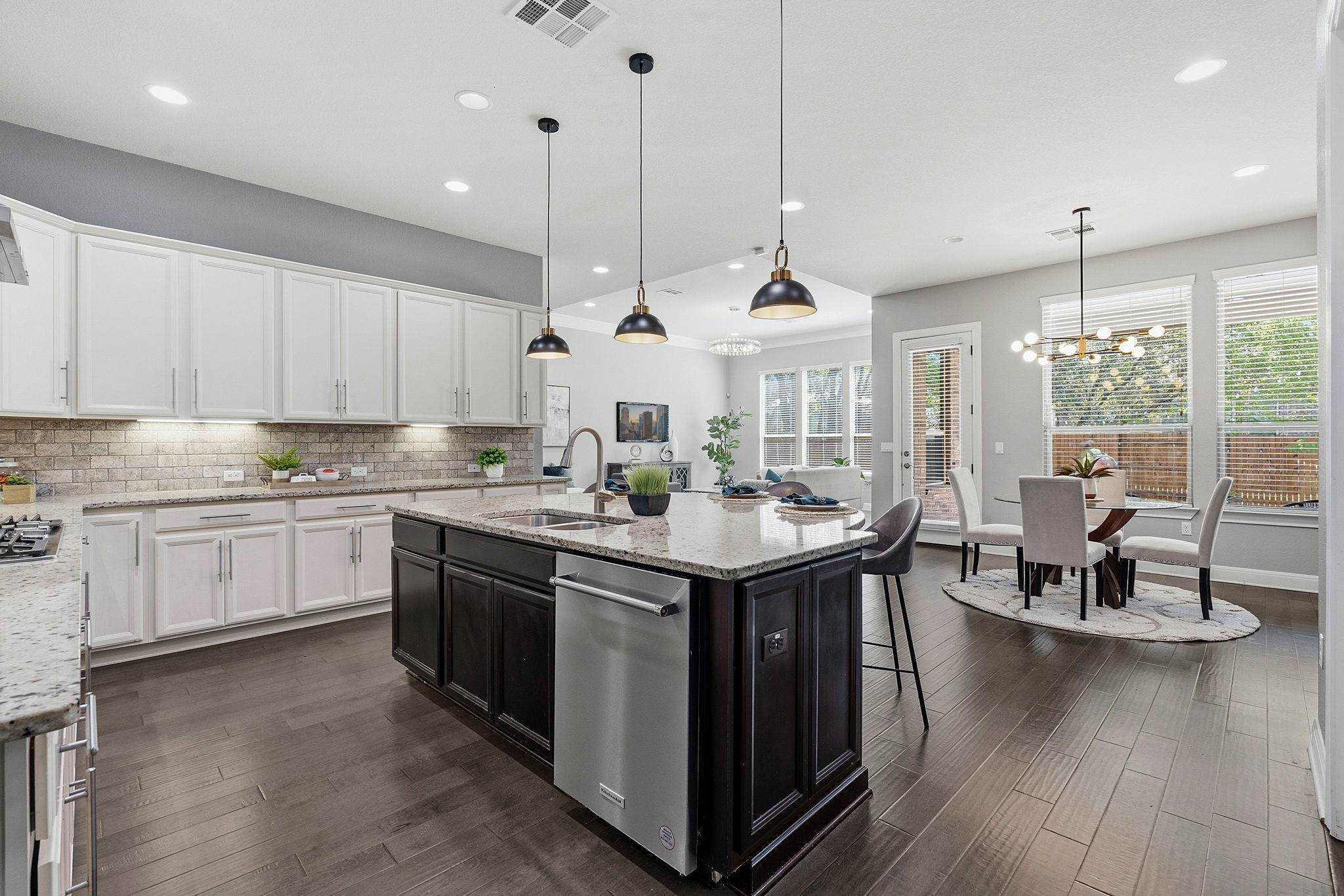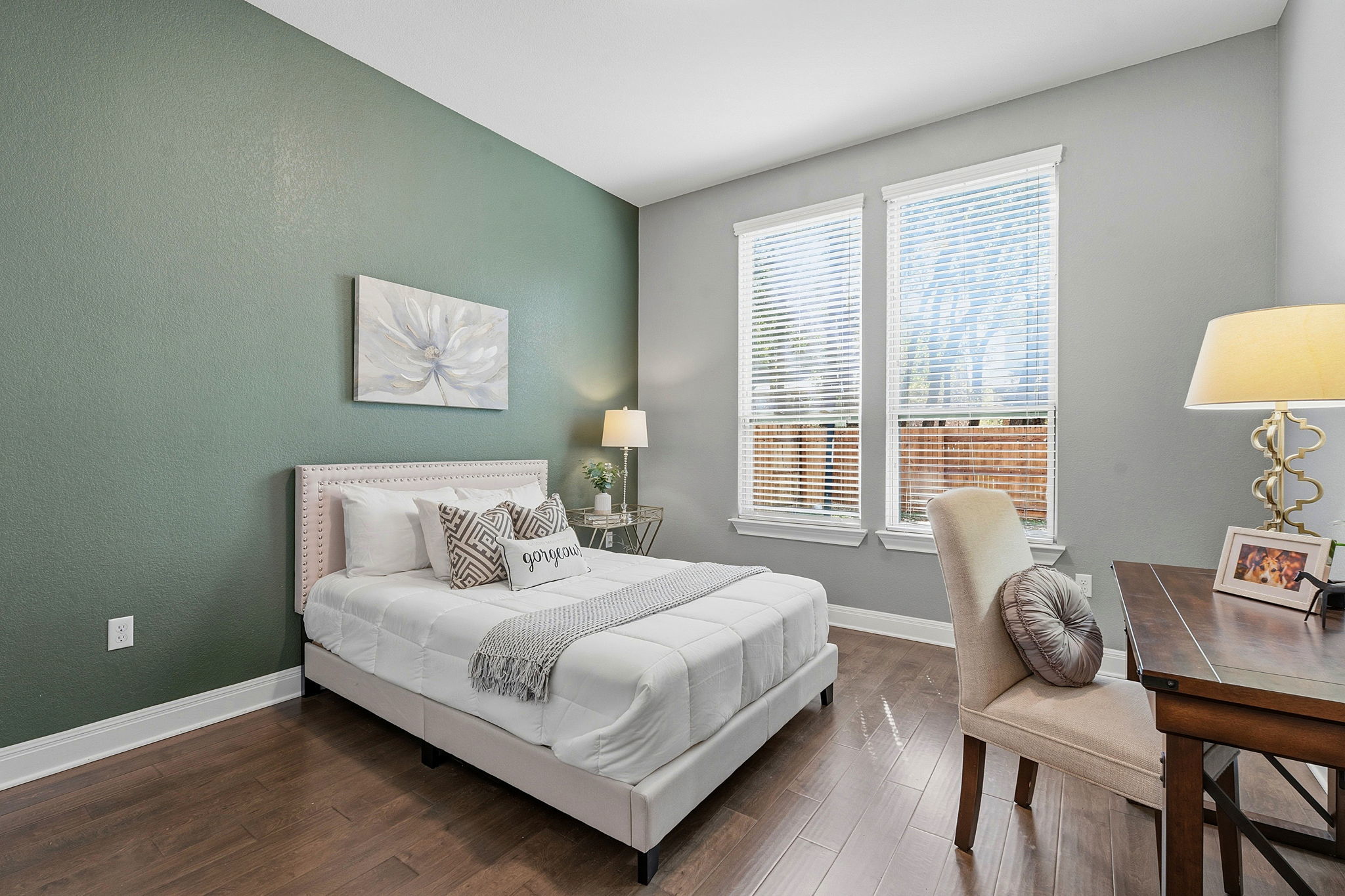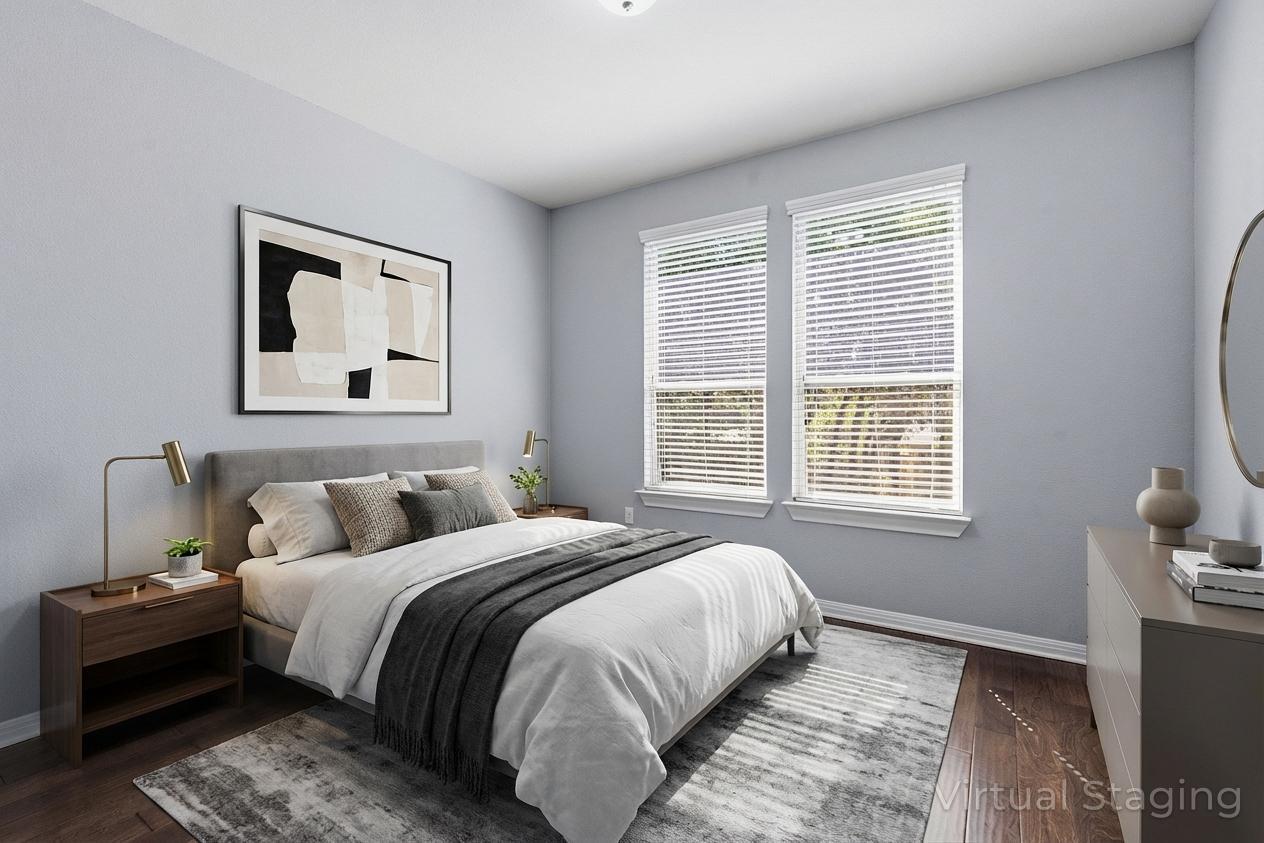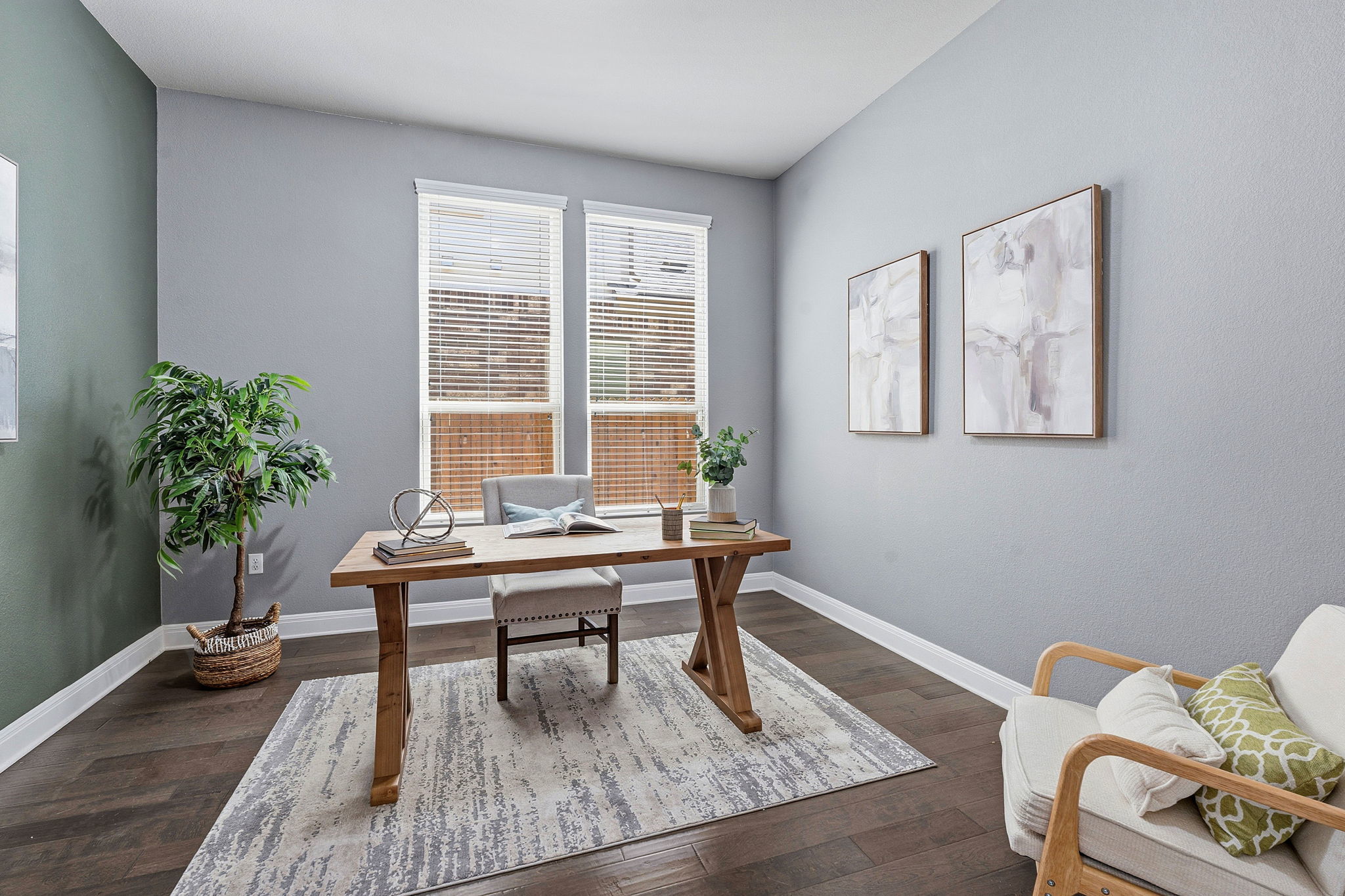 Welcome to this beautifully appointed north-facing residence, where timeless design meets modern comfort. Featuring 5 spacious bedrooms, 4 full baths, and a desirable 3-car garage, this home is thoughtfully designed for everyday living and entertaining. Step inside to a grand foyer with soaring double-height ceilings that set the tone for the elegant interior. Rich wood flooring flows throughout the main living areas, complemented by a striking contemporary chandelier. A dedicated office with French doors offers the perfect work-from-home space. The oversized living room is filled with natural light and offers backyard views, seamlessly connecting to the breakfast area and kitchen in an open-concept layout. The chef-inspired kitchen features granite countertops, a large center island, gas cooktop with vent hood, white cabinetry, under-cabinet lighting, recessed lights, and a spacious walk-in pantry. A butler’s pantry connects the kitchen and formal dining room, making entertaining effortless. The main level includes two bedrooms and two full baths—ideal for guests or multi-generational living. The primary suite is a true retreat with a versatile flex space perfect for a sitting area, home gym, office, or nursery. The spa-like bath showcases dual vanities, a walk-in shower, garden tub, and a custom-designed walk-in closet. Upstairs, enjoy a game room, media room—perfect for movie nights—and three secondary bedrooms with two full baths. Step outside to a beautifully designed outdoor living space with a covered patio, elegant tile flooring, extended patio, and string lights for ambiance. The backyard features low-maintenance turf and a dedicated sport court—ideal for recreation and relaxation. Located within highly regarded Round Rock ISD, including England Elementary, with convenient access to major highways, shopping, dining, and employers—offering comfort, style, and an exceptional location.