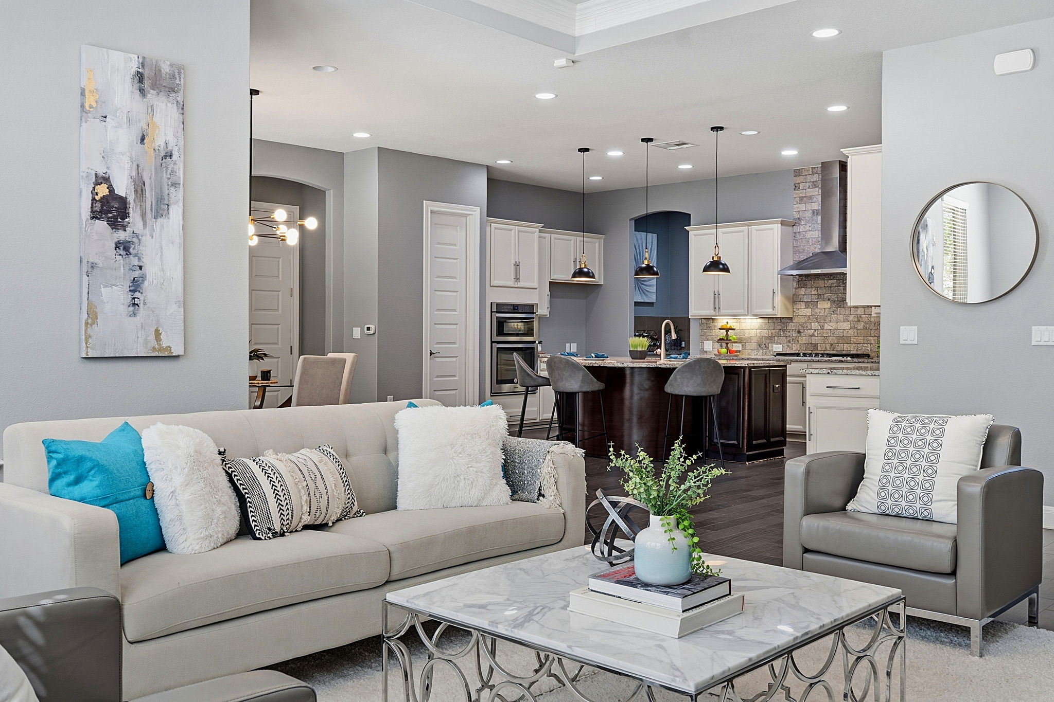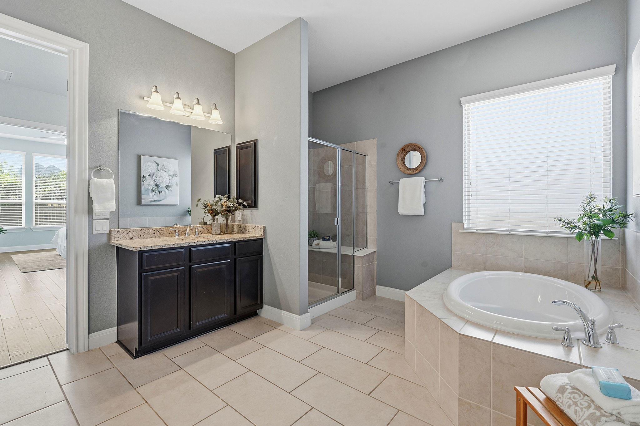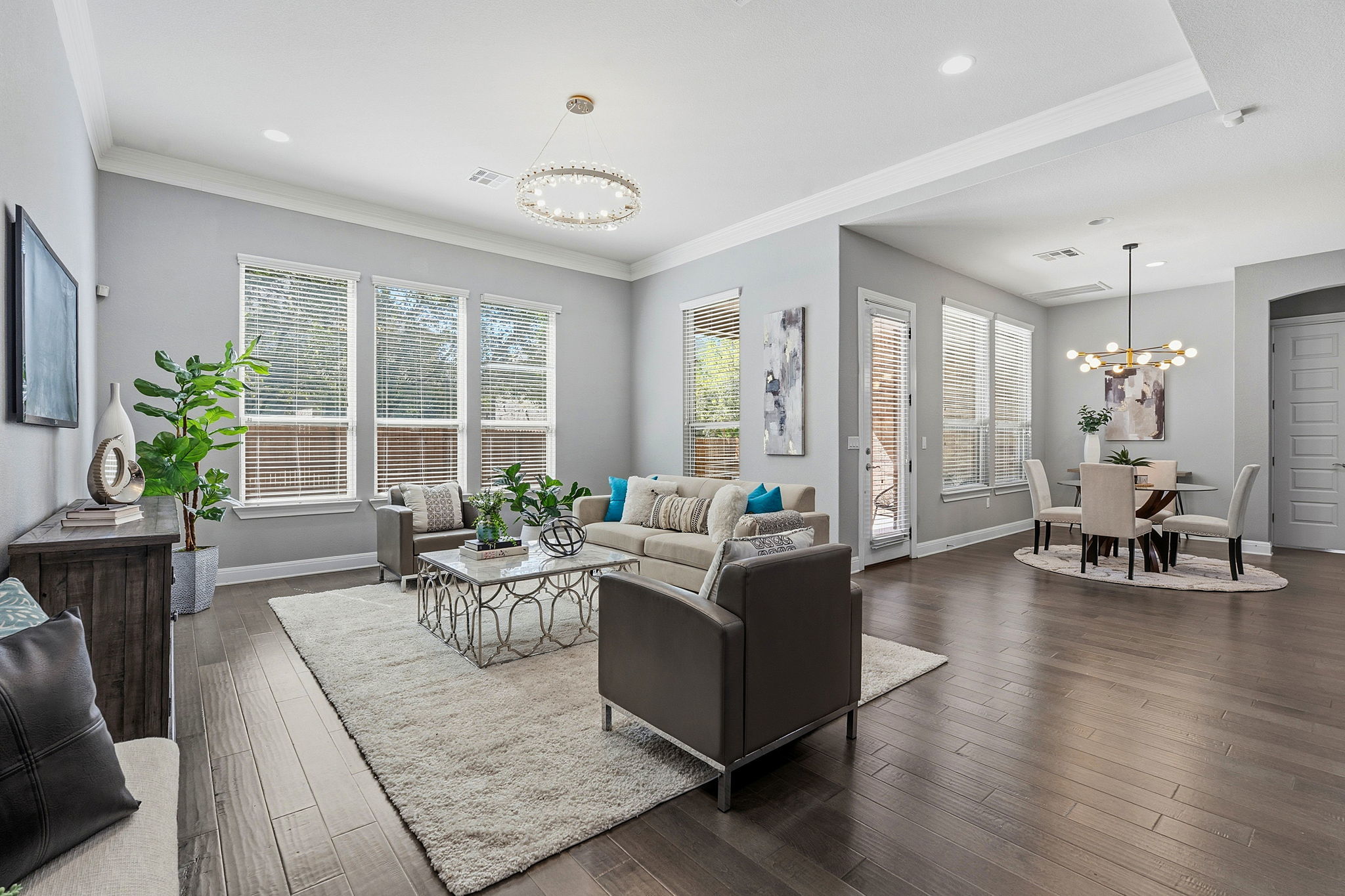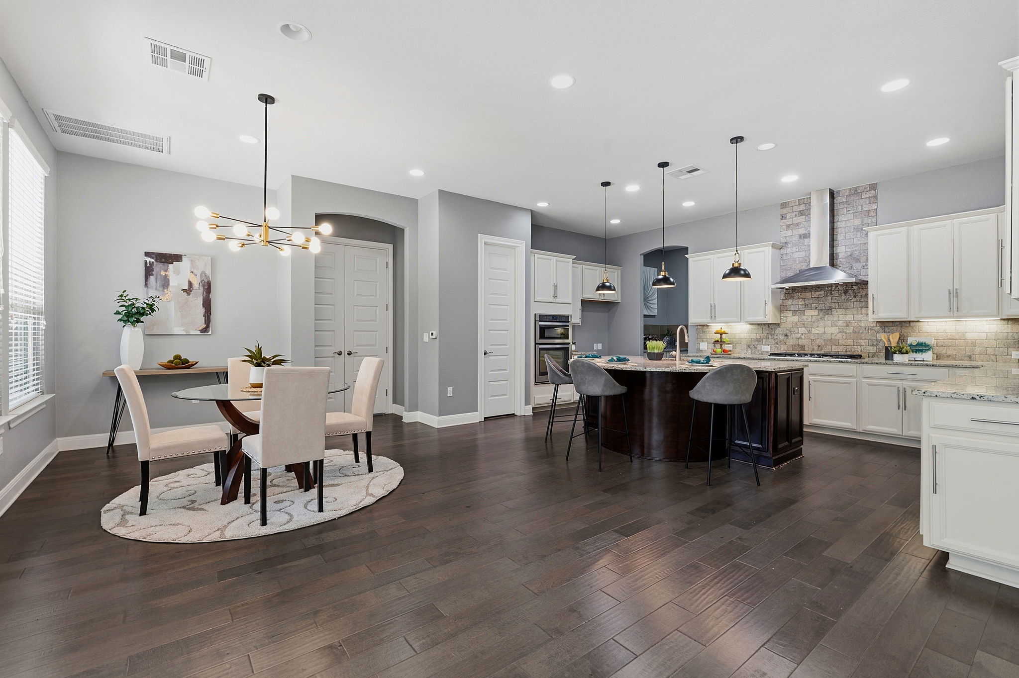 Welcome to this beautifully appointed north-facing residence, where timeless design meets modern comfort. Featuring 5 spacious bedrooms, 4 full baths, and a desirable 3-car garage, this home is thoughtfully designed for everyday living and entertaining. Step inside to a grand foyer with soaring double-height ceilings that set the tone for the elegant interior. Rich wood flooring flows throughout the main living areas, complemented by a striking contemporary chandelier. A dedicated office with French doors offers the perfect work-from-home space. The oversized living room is filled with natural light and offers backyard views, seamlessly connecting to the breakfast area and kitchen in an open-concept layout. The chef-inspired kitchen features granite countertops, a large center island, gas cooktop with vent hood, white cabinetry, under-cabinet lighting, recessed lights, and a spacious walk-in pantry. A butler’s pantry connects the kitchen and formal dining room, making entertaining effortless. The main level includes two bedrooms and two full baths—ideal for guests or multi-generational living. The primary suite is a true retreat with a versatile flex space perfect for a sitting area, home gym, office, or nursery. The spa-like bath showcases dual vanities, a walk-in shower, garden tub, and a custom-designed walk-in closet. Upstairs, enjoy a game room, media room—perfect for movie nights—and three secondary bedrooms with two full baths. Step outside to a beautifully designed outdoor living space with a covered patio, elegant tile flooring, extended patio, and string lights for ambiance. The backyard features low-maintenance turf and a dedicated sport court—ideal for recreation and relaxation. Located within highly regarded Round Rock ISD, including England Elementary, with convenient access to major highways, shopping, dining, and employers—offering comfort, style, and an exceptional location.