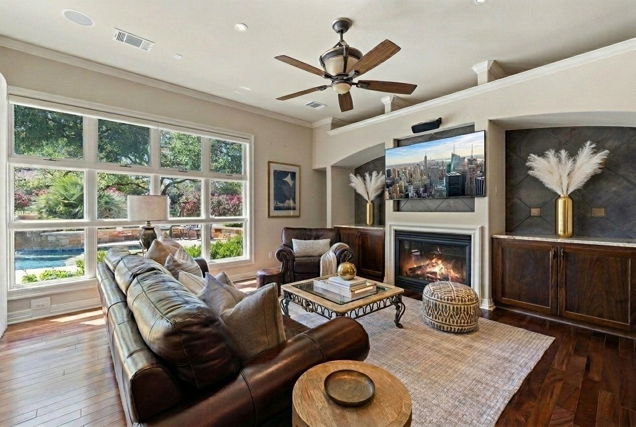 Serenity, peace, and elevated Hill Country living defines this stunning single-story home located within the prestigious gated Barton Creek Lakeside country club and waterfront community along Lake Travis. This elegant residence sits on a 0.66-acre corner lot with a circular driveway and three-car garage, shaded by mature oaks. The backyard oasis is a true highlight, featuring a beautiful pool with baja shelf, spa, water features, outdoor kitchen with grill, shaded lounge areas, and lush landscaping designed for both relaxation and entertaining. Inside, high ceilings and marble-inlaid hardwood floors create a bright, refined atmosphere, complemented by crown molding and custom cabinetry throughout. The well-designed floor plan offers ideal privacy, with the primary suite on its own wing. The gourmet kitchen includes granite countertops, stainless steel appliances, ample storage, and a layout that flows seamlessly into the main living and dining spaces. Expansive picture-framed windows capture Hill Country views, creating a natural connection between indoor living and the surrounding landscape. Residents may explore optional country club membership with access to an Arnold Palmer–designed golf course, updated clubhouse and fitness center, tennis and pickleball courts, and a private marina on Lake Travis with boat slips available for lease. Barton Creek Lakeside is located within one of the most exciting luxury growth corridors in the Texas Hill Country, with nearby developments including Loraloma/Thomas Ranch, Canyon Club and the highly anticipated Canyon Ranch Wellness Resort, expected to open in 2026, further enhancing the area’s long-term appeal. Please note: select furnishings may convey, subject to contract terms, with a recently purchased golf cart available for separate negotiation. Schedule a private tour today. *Buyer to verify all information*