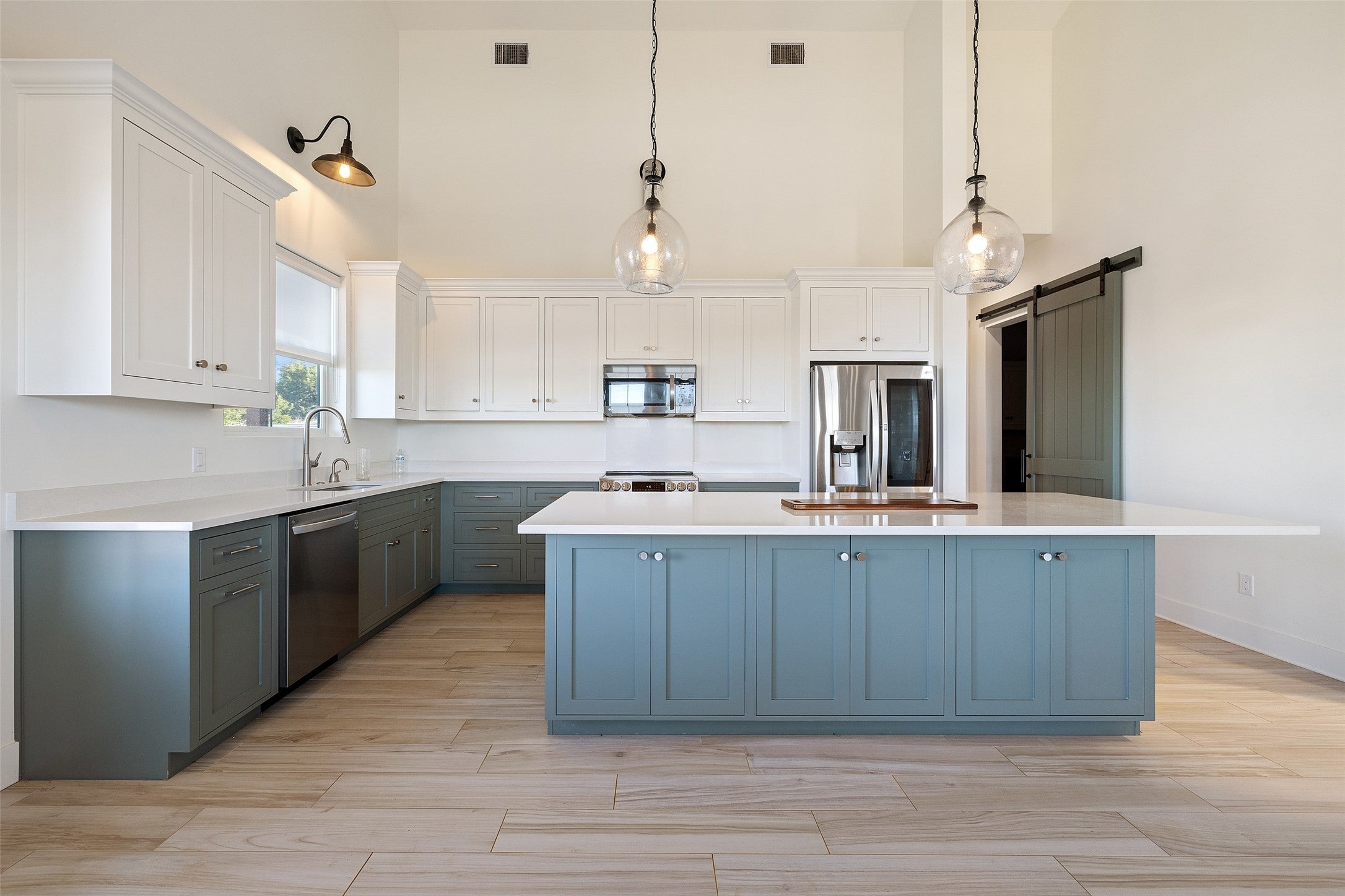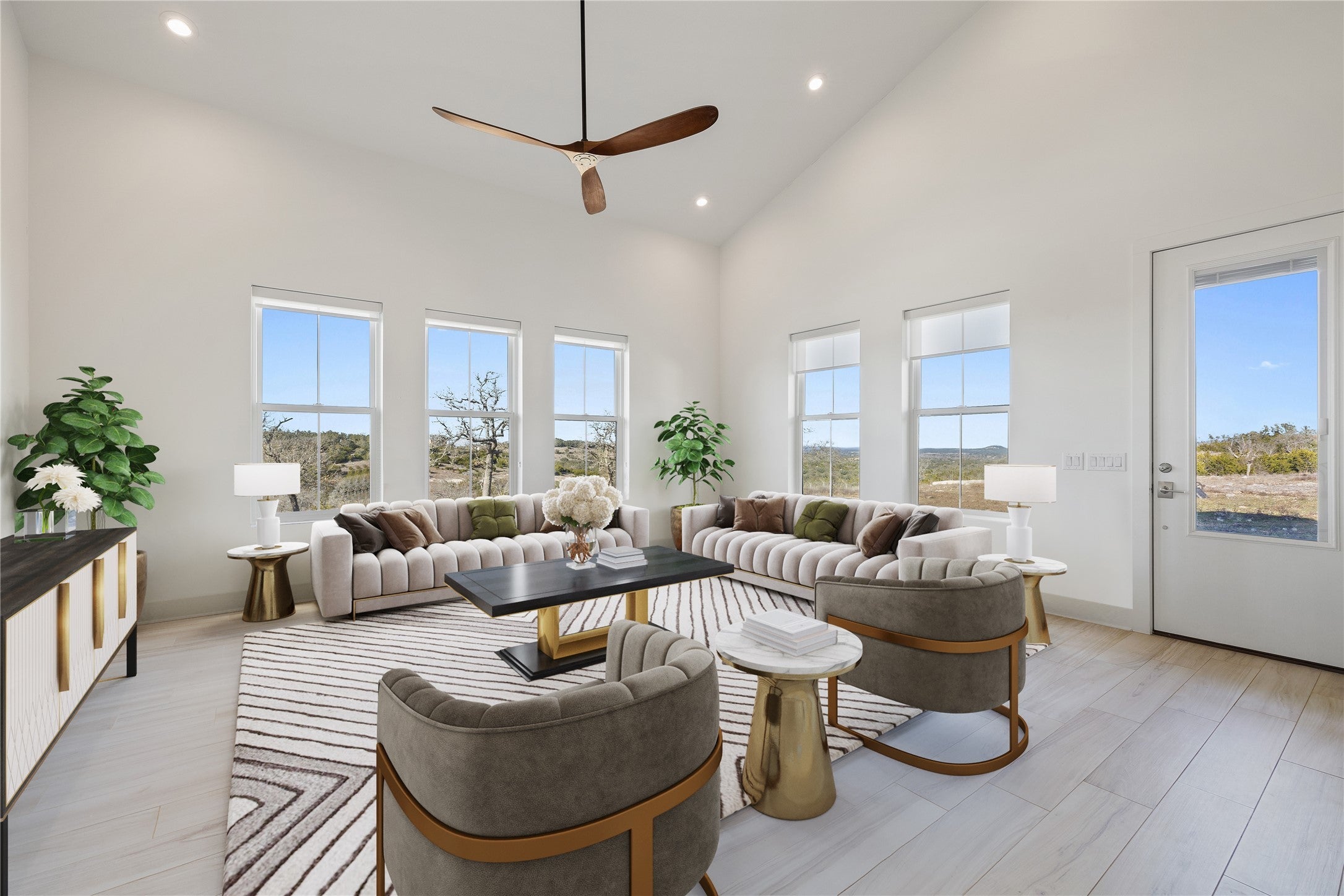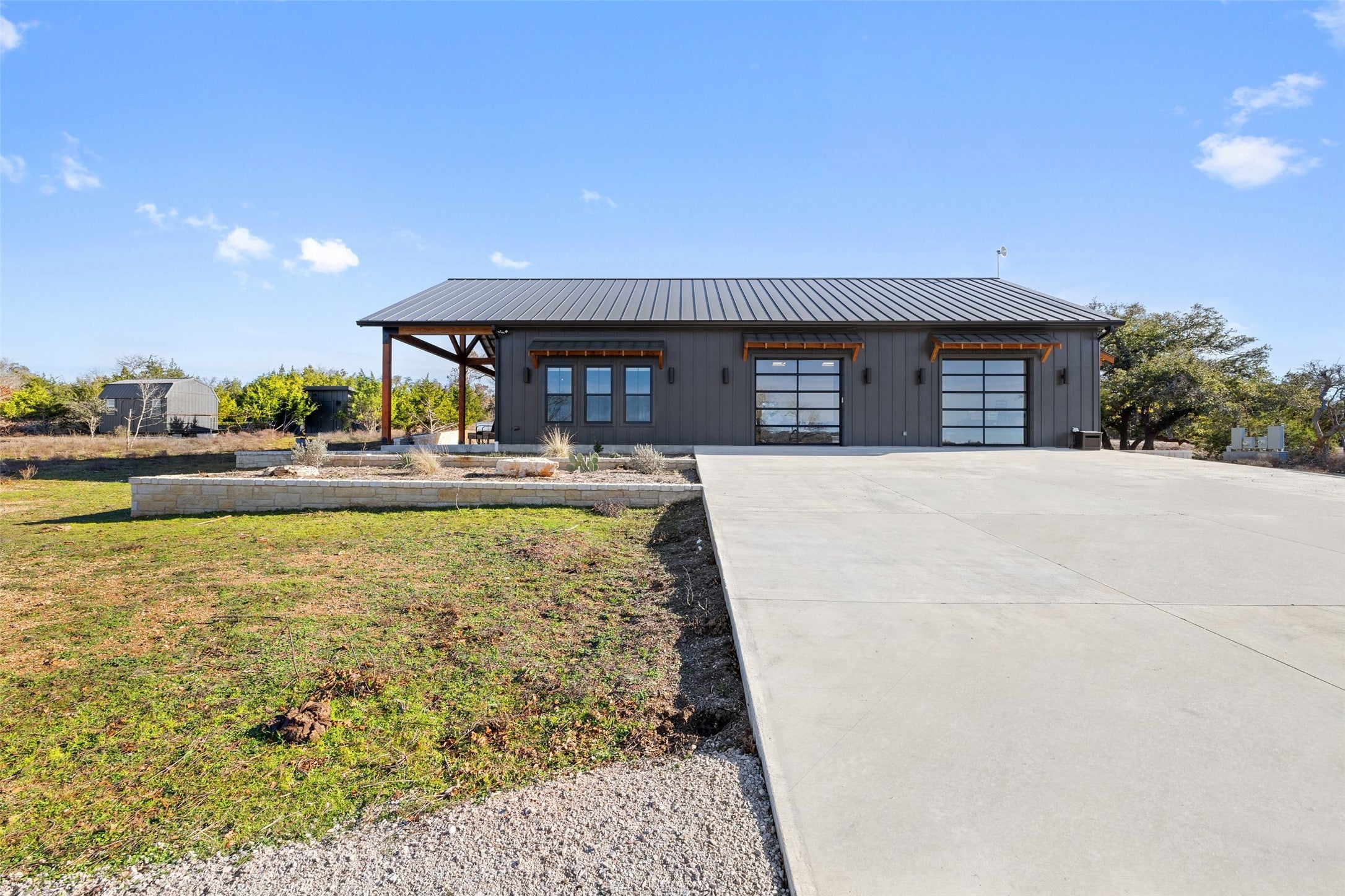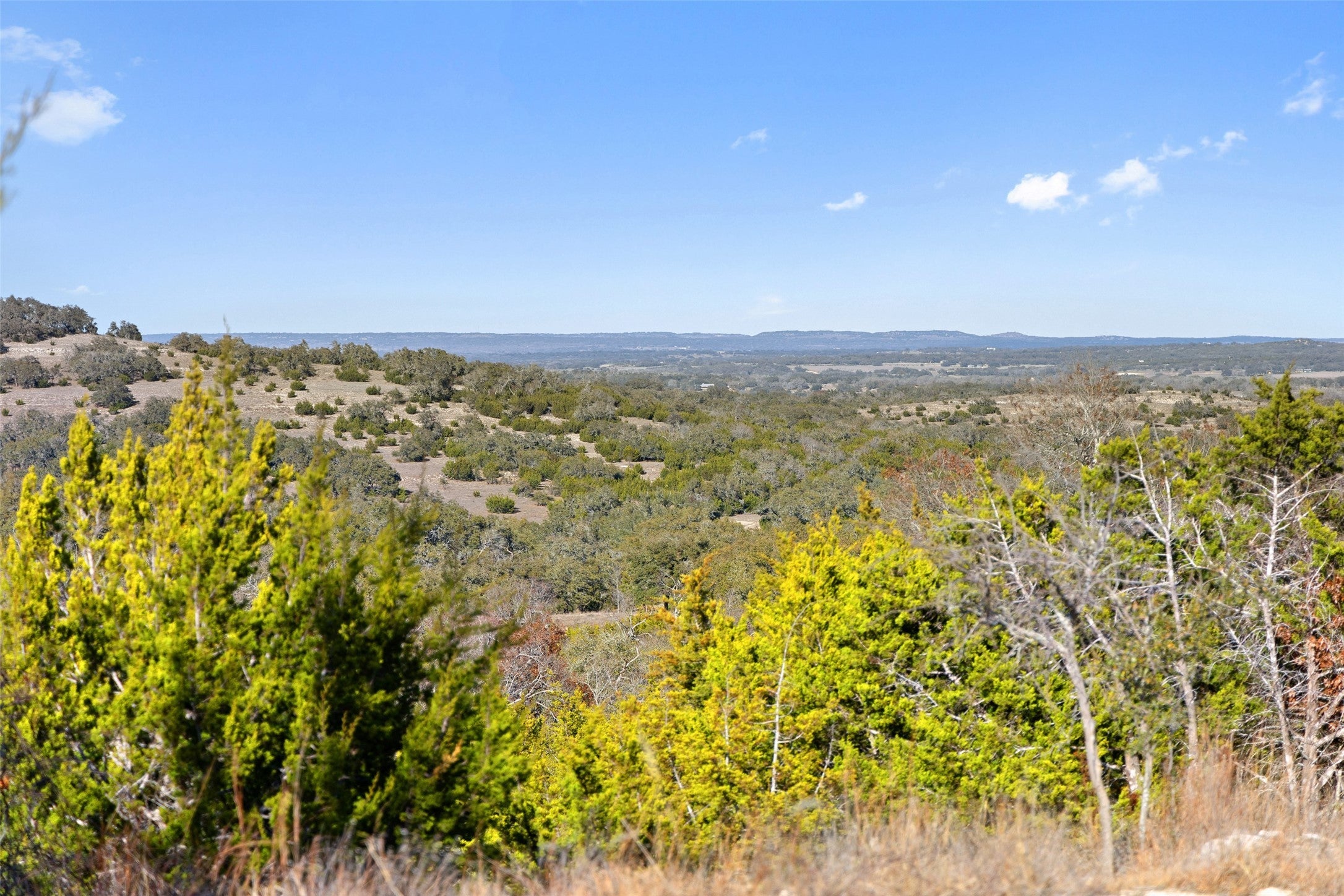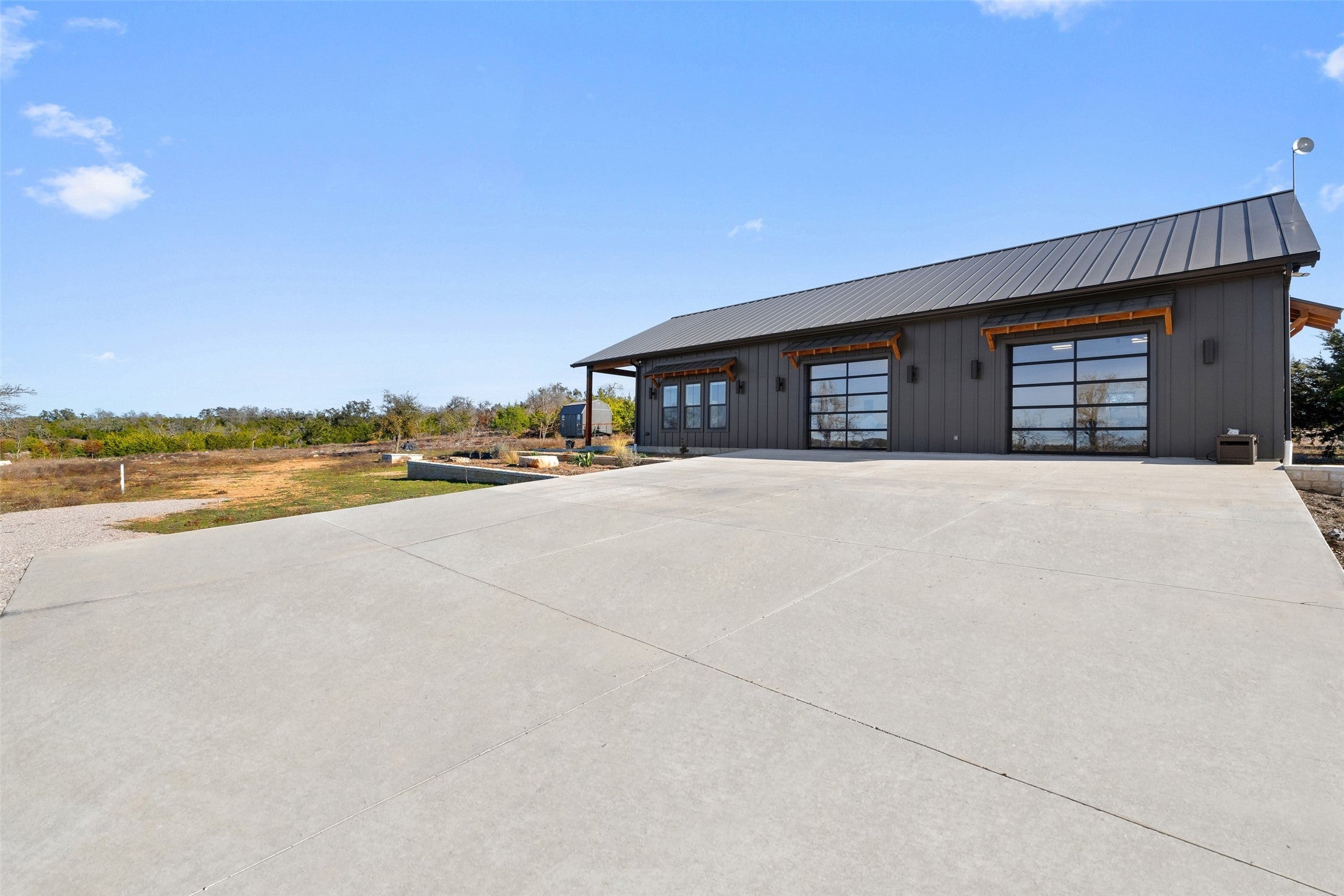 Exceptional barndominium nestled on 13.59 acres in Blanco, Texas! This newly constructed custom home sits atop the property, providing breathtaking views and utmost privacy. Positioned within The Divide, a charming 20-parcel acreage sub-division boasting a gated entrance and paved roads. The residence spans 1,100 SF, featuring 1 bedroom, 1 1/2 baths, and a walk-in pantry/laundry room. The attached 1,460 SF shop is climate-controlled, adaptable for use as a garage, living space, or a vibrant party/game room. Enjoy the spaciousness enhanced by a 23' vaulted ceiling in the shop, living, and patio areas. Revel in the expansive covered and uncovered patio spaces. Inside, discover porcelain plank tile in the living area and epoxy flooring in the shop. The chef's kitchen boasts custom cabinetry, an island, and quartz countertops. The property is adorned with a variety of Oak trees and cedar, offering a serene environment. The large, clear area below invites recreation, hiking, or the potential for additional structures. Water is efficiently supplied by a complete well system with a 2500-gallon storage tank and an engineered reverse osmosis water treatment system. An additional 2500-gallon rainwater collection tank complements the property. Exterior features include stained Douglas fir beams and posts, architectural cedar awnings, a mason stone fire pit, and extensive limestone wall landscaping. Conveniently located just minutes from Johnson City, Blanco, and Fredericksburg, the property benefits from the current Ag exemption. This is a rare chance to own a secluded piece of the Hill Country, less than an hour's drive from both Austin and San Antonio. Seize the opportunity for Hill Country living at its finest!