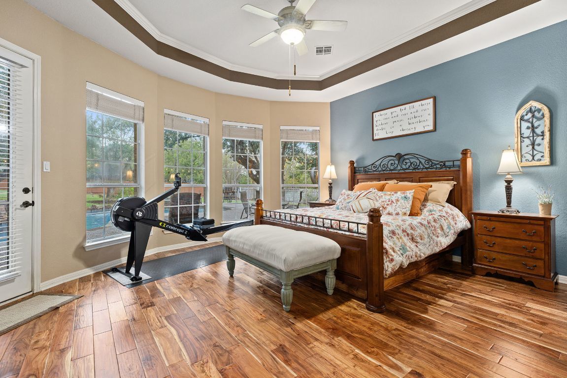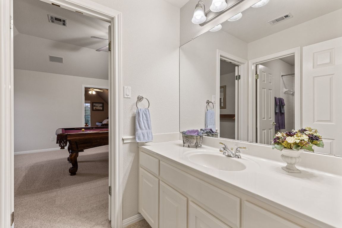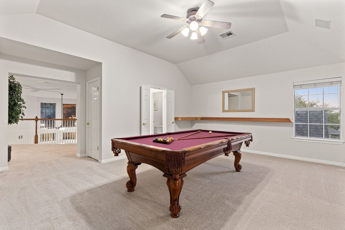 Rare opportunity on one of the largest and best lots in Forest Creek — over half an acre (.534) tucked at the end of a quiet cul-de-sac with a 3-car garage. Backyard retreat features a 24,175-gallon inground pool with sundeck, 7.5’ deep end, hot tub, and outdoor kitchen with granite counters, built-in grill, cooler, and bar seating. Over 20 mature oak trees provide natural shade and privacy. Interior highlights include Acacia hardwood floors in the living and primary, engineered wood in the formal dining and office/formal living. Two bedrooms downstairs including a large primary suite with bay window, crown molding, and updated bath featuring granite double vanity, frameless shower with seat and dual heads, and jetted tub. Family room features soaring 19’ ceilings, gas fireplace, and integrated audio/video wiring. Oversized kitchen with gas cooktop, double ovens, stainless appliances, ice maker, butler’s pantry, bar seating, and desk area. Upstairs offers three large bedrooms with Jack-and-Jill bath, a spacious game room with built-in speakers, and a second flex/game room that can function as a 6th bedroom. Upgrades include roof (2022), full exterior paint (2022), full house seamless gutter with stainless steel gutter guards, water softener with Carbo filtration, solar window film on back windows, and Google Fiber. Oversized 3-car garage expanded by 6’, insulated, with high ceilings and pulley storage systems. Pool table and workout equipment for sale separately. Forest Creek HOA includes community pools, tennis courts, and playgrounds. Minutes to Forest Creek Elementary, Ridgeview MS, and Cedar Ridge HS. Convenient to Kalahari Resort, Dell Diamond, Old Settlers Park, H-E-B, and Forest Creek Golf Club. Easy access to SH-45 and 130 and the airport and close to Apple, Dell, Samsung, Tesla, and Emerson. Buyer to verify all information.