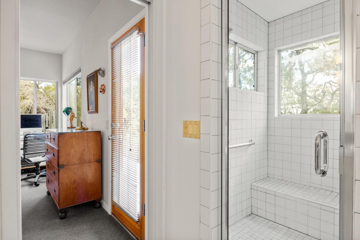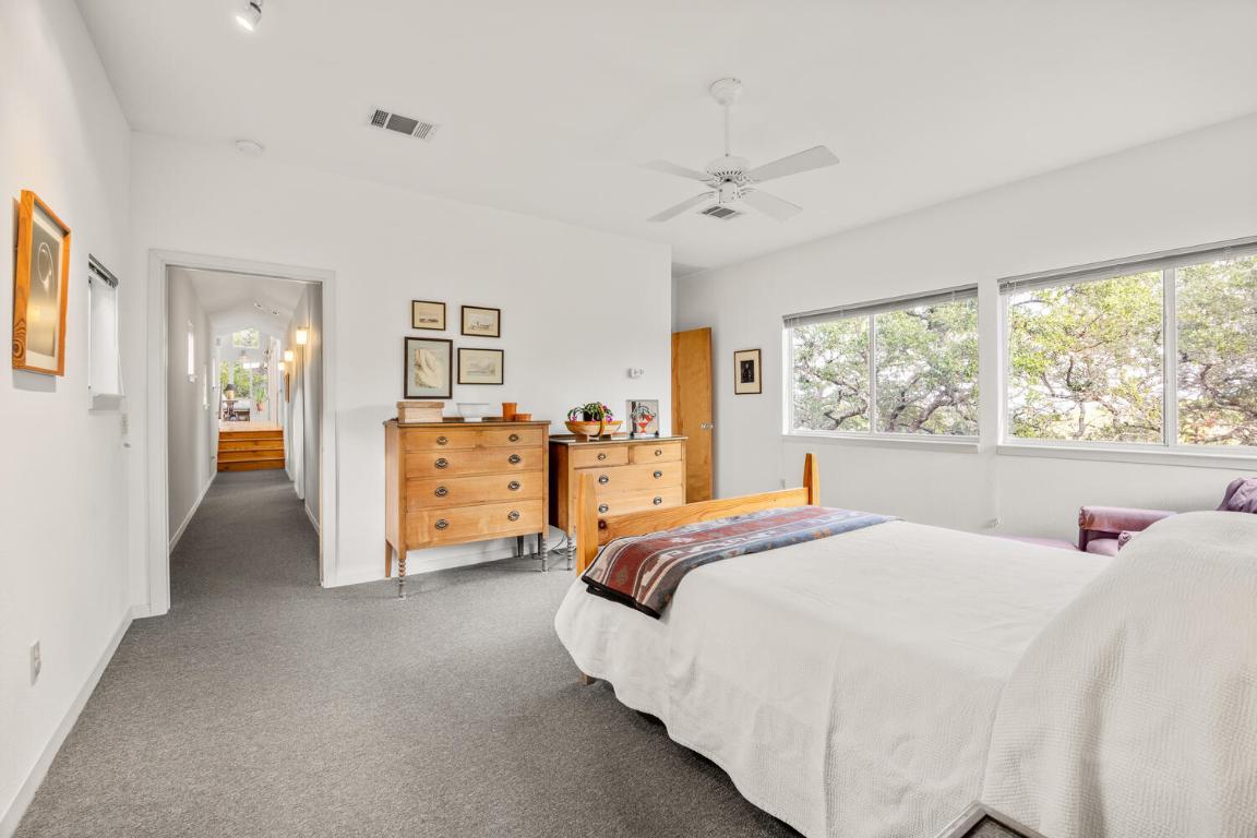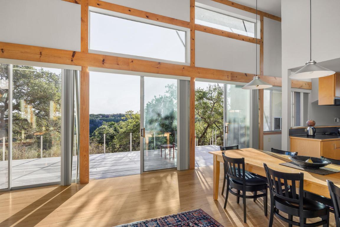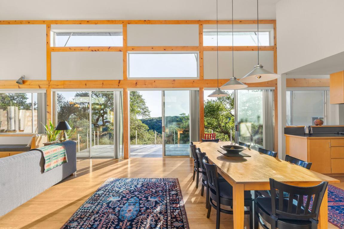 RED HAWK ROAD MID-CENTURY MODERN RETREAT — A prestigious hill country haven, located on a private road, designed by Architect Lou Kimball. Enjoy peaceful, unobstructed views of rolling hills, trees, and the valley beyond. Take in the morning sunrise from the spacious back deck. The desirable split floor plan offers privacy for guests, while the primary suite includes a screened porch for relaxing outdoor living. Tall windows and doors throughout the home fill every room with natural light. Fenced courtyards feature native plantings, wildflowers, and a raised herb garden. The property also includes two 10,000-gallon rainwater collection tanks with a filtration system, and an easy-to-manage wildlife exemption. Majority of furniture negotiable for quick availability. Close to Schools, Restaurants - Medical in Wimberley, Kyle and San Marcos. Approximately 7.5 Miles from Wimberley Square, HEB and the Library. All information is deemed reliable but not guaranteed. Buyers and Agents are encouraged to verify details.
