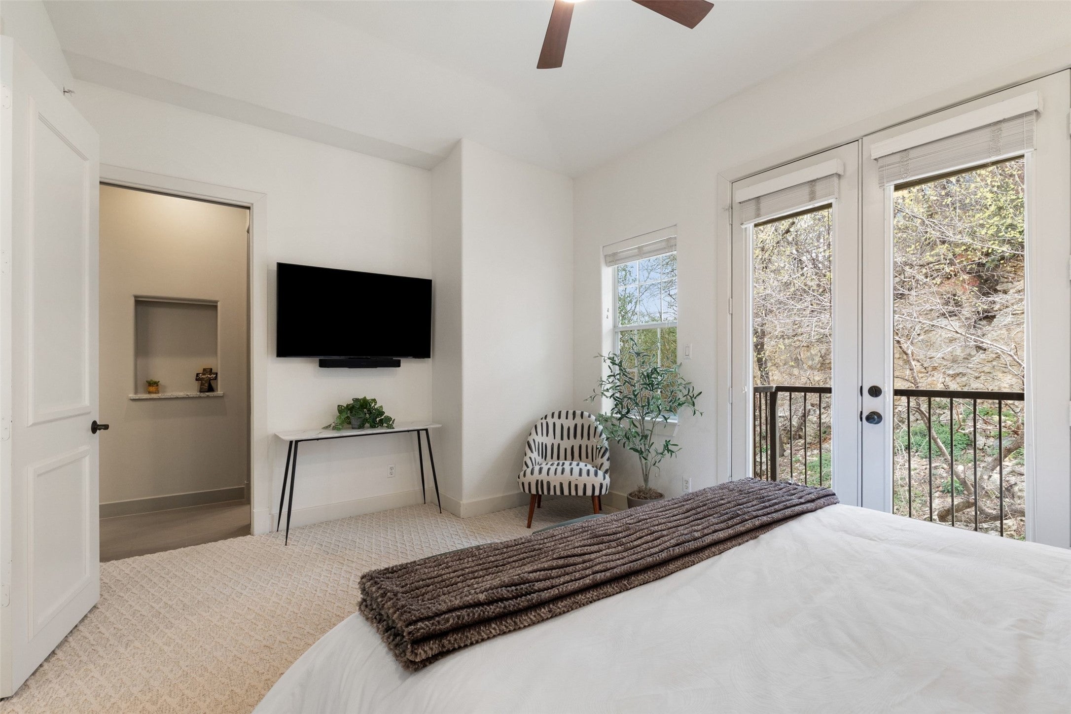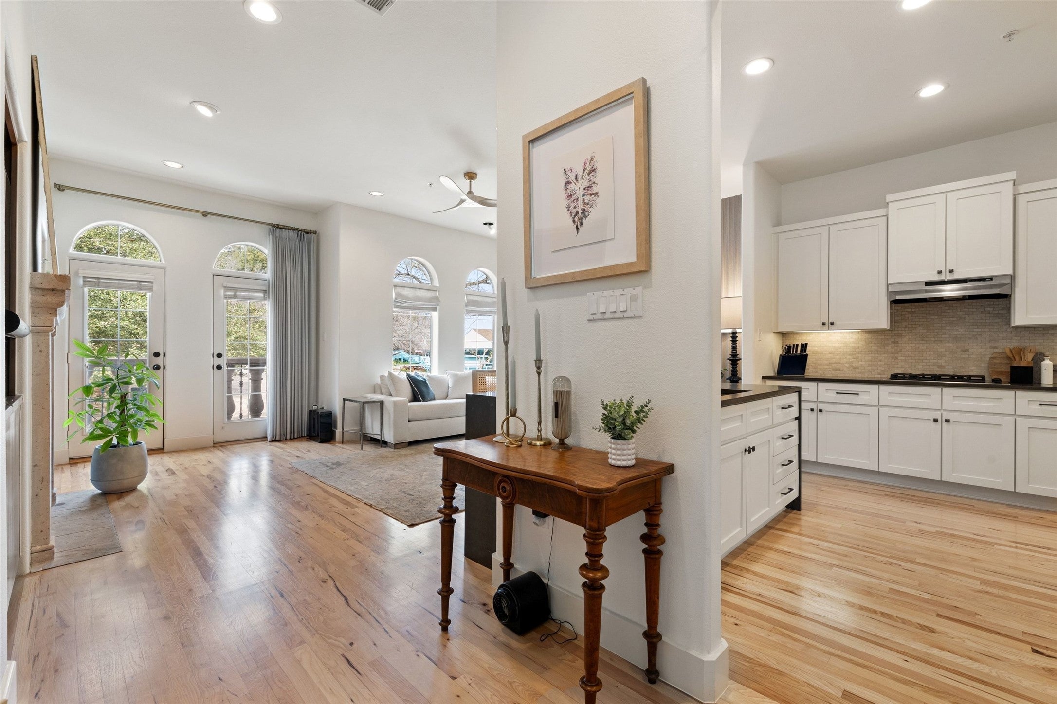 Tucked inside the exclusive, fully-gated Villas of Lost Canyon, this beautifully updated luxury townhome offers a rare opportunity to live just blocks from Zilker Park, Lady Bird Lake, Barton Springs, downtown Austin, and the very best of 78704—while enjoying a level of privacy and security almost unheard of this close to the urban core. Behind the striking solid-wood and iron entry gates, the Villas is an intimate 31-residence community that, in spite of its premium connectedness, feels quietly worlds away. Newly installed tree and landscape lighting create a stunning nighttime ambiance and an added sense of security. Neighbors gather at the dog park, private fitness studio, and community fire pit—fostering a true lock-and-leave lifestyle without sacrificing warmth or connection. Inside, the home is among the most thoughtfully updated in the neighborhood. Wide-plank wood floors, quartz counters, custom cabinetry, high-end appliances, high ceilings, designer lighting, and refined finishes elevate every level. The gourmet kitchen opens seamlessly to the main living area, creating an ideal setting for both everyday comfort and entertaining. A private in-home elevator services all three floors, making groceries, luggage, and guests effortless. The spacious primary suite is a true retreat with a private balcony overlooking the picturesque hillside and cityscape, dual walk-in closets, and a renovated bathroom featuring a soaking tub. The home’s well-appointed secondary bedrooms, including one superbly flexible as an additional living space, are ideal for guests, remote work, or entertainment. A private 2-car garage provides secure, direct access to the home. For those who want access to the very best that Austin urban living has to offer—yet return home to peace, security, and superb community—this is a rare and compelling offering.