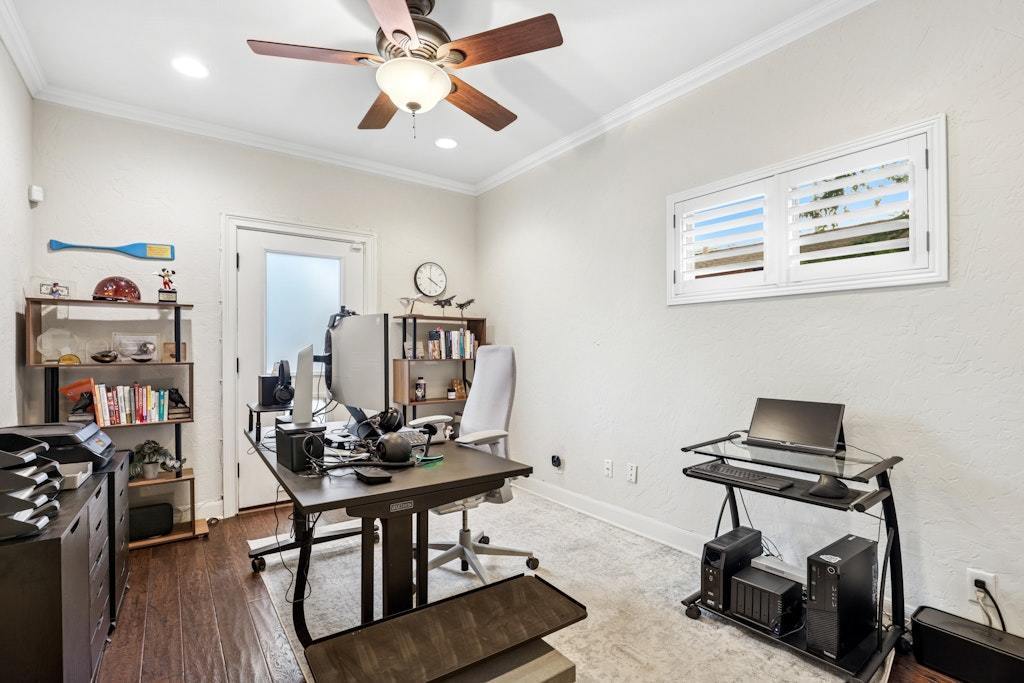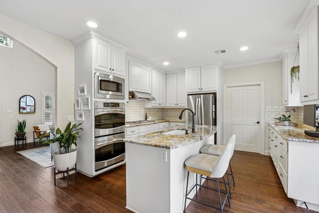 Tucked beneath mature heritage trees on a quiet street in Travis Heights, this modern Mediterranean residence blends warmth, privacy, and timeless sophistication. Set back behind low-maintenance xeriscaping and steel-edged planters, the home makes a striking first impression and continues with soaring ceilings, arched passageways, rich hardwood floors, and expansive windows that bring in abundant natural light. A dramatic two-story living room flows seamlessly into the open kitchen and dining area, ideal for gathering and entertaining. Double ovens, a generous center island, and custom cabinetry offer both function and style. With four bedrooms, four full baths, and two spacious living areas, the layout provides flexibility for guests, work-from-home needs, or everyday living. The primary suite offers a private retreat with its own balcony and dual walk-in closets, creating a quiet escape within the home. Enjoy life in Travis Heights just moments from Big and Little Stacy Parks, neighborhood trails, South Congress, and downtown. Property currently leased through May 15, 2026.