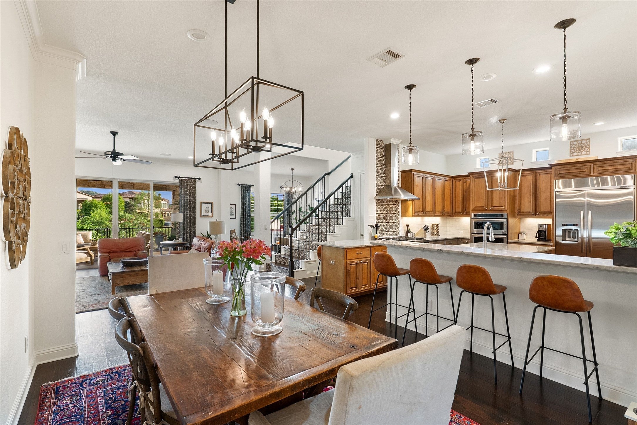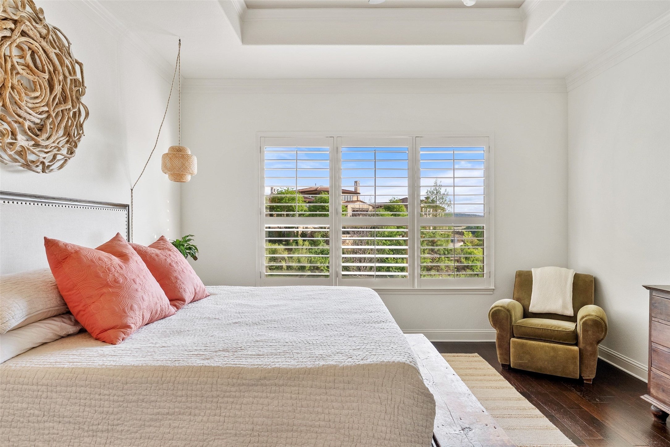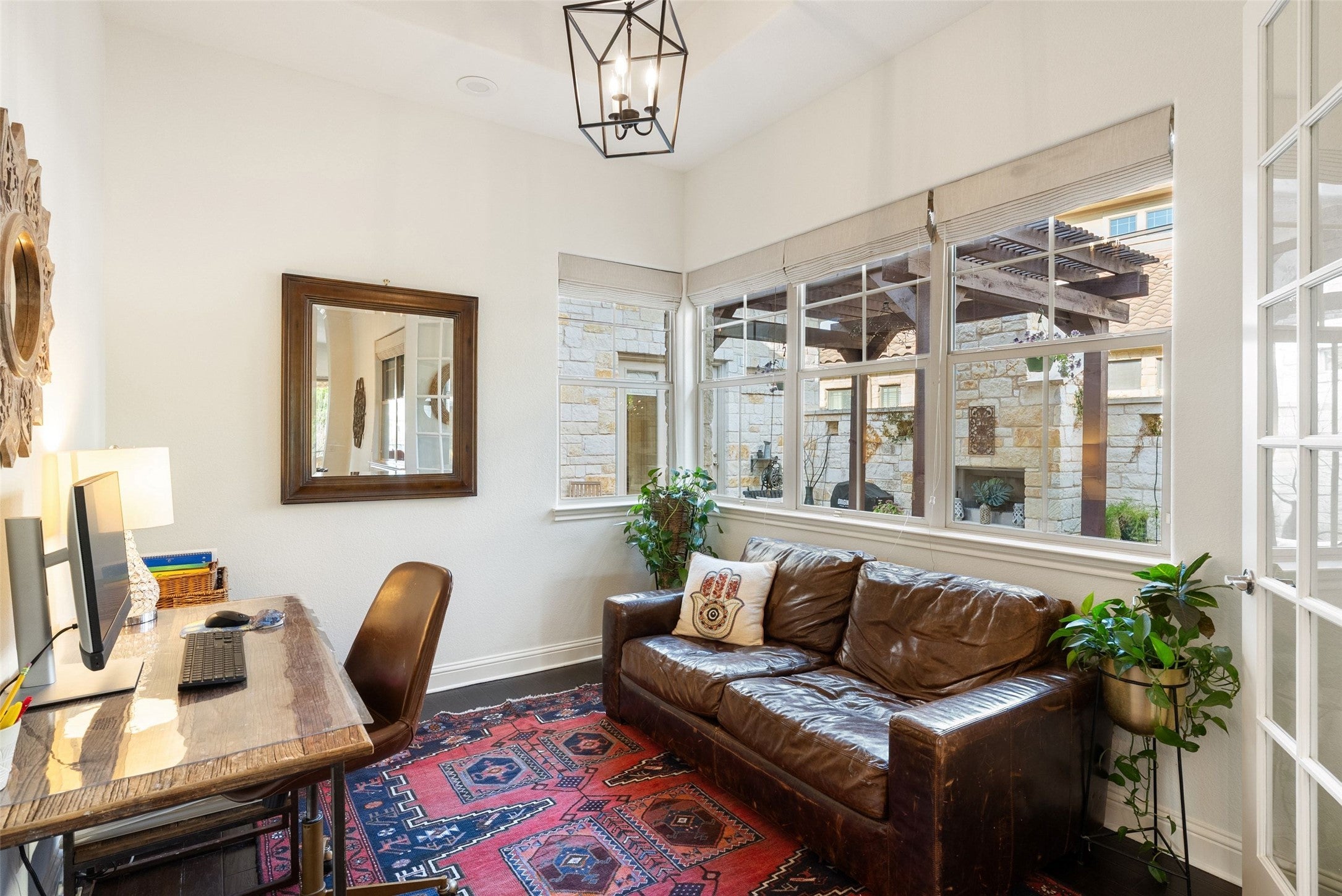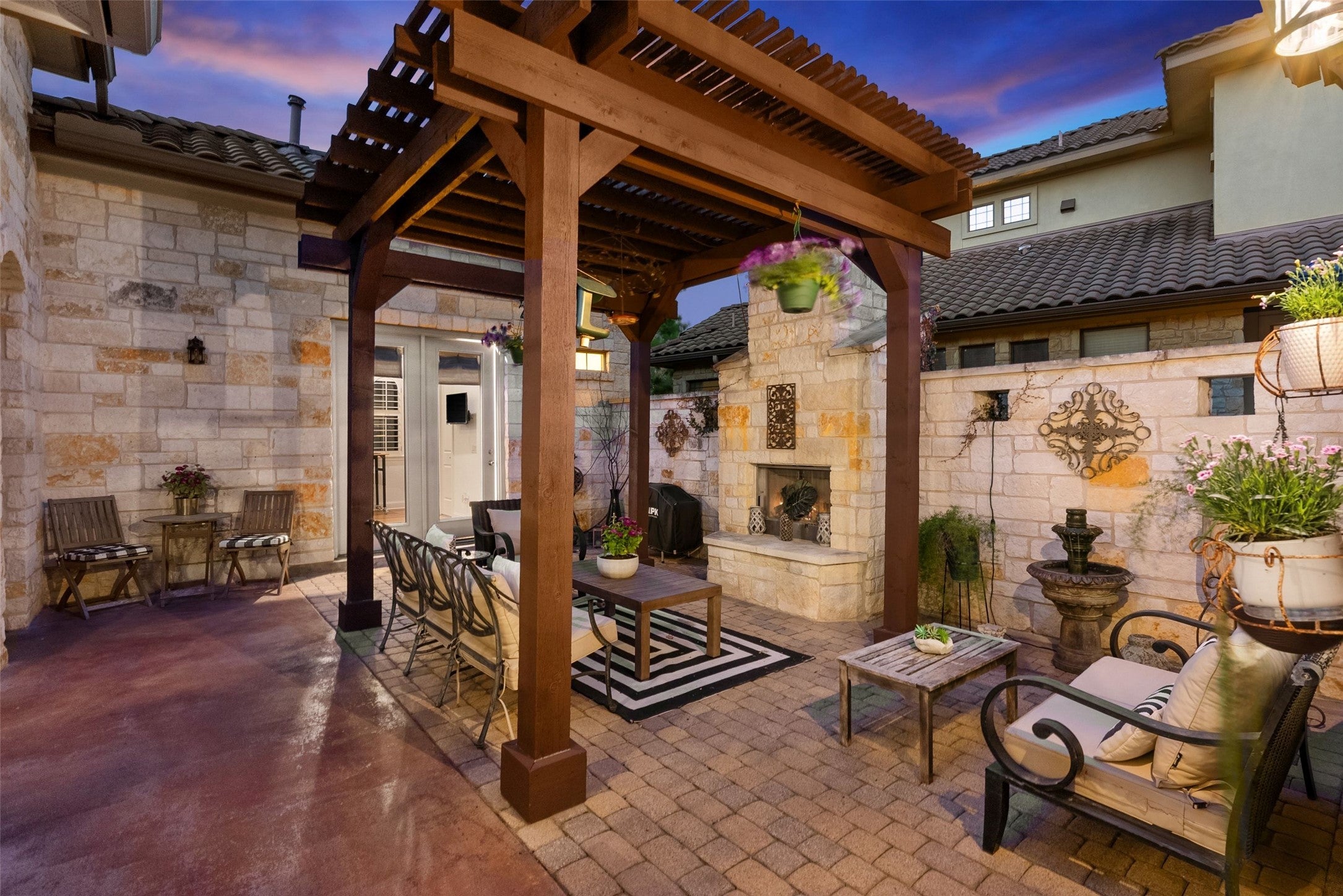As twilight settles over the hills of Rough Hollow, you approach 209 Rocky Coast Drive through a commanding stone entry tower, an architectural statement that immediately evokes the romance of a European estate, thoughtfully envisioned by Design Visions Architecture and masterfully brought to life by award-winning builder Scott Felder. Beyond the gated entry, an enchanting courtyard unfolds—anchored by a wood-burning fireplace, framed by classic pavers, and softened by a pergola overhead—creating a private, old-world sanctuary perfect for intimate gatherings or quiet reflection. Inside, more than 4,000 square feet of refined living space reveals a home that resists conventional labels, offering a versatile floor plan designed to evolve with multigenerational needs or dynamic lifestyles. The kitchen serves as a true centerpiece, where luminous quartzite countertops, rich maple cabinetry, and professional-grade appliances are complemented by custom lighting that elevates both form and function, all seamlessly connecting to expansive living and dining areas ideal for entertaining. With no carpet throughout, the home maintains a clean, cohesive aesthetic while enhancing everyday ease. The main level hosts a tranquil primary suite alongside a secondary bedroom with its own private bath, offering comfort and accessibility without compromise. A detached guest house casita with a full bath adds an exceptional layer of flexibility, equally suited as a private office, creative studio, or independent living quarters. Outdoors, an oversized covered living space invites you to unwind year-round, overlooking a beautifully designed pool and spa with no rear neighbors, ensuring a rare sense of privacy. Residents enjoy marina access, scenic trails, fitness amenities, and vibrant community events that enrich daily life. Here, architecture, craftsmanship, and lifestyle converge in one of Lakeway’s most distinctive offerings—an experience waiting to be lived.
