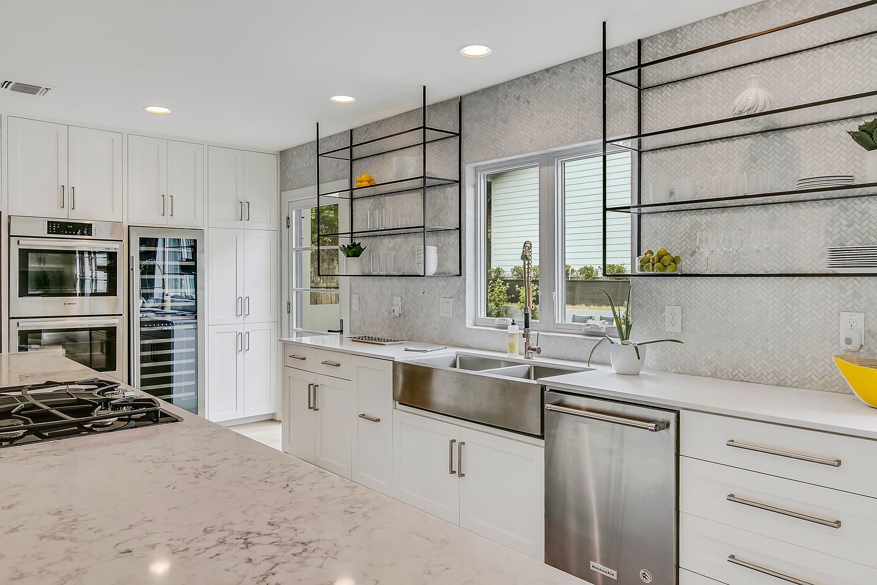 - Built-In Gas Range, Built-In Oven, Built-In Refrigerator, Dishwasher, Disposal, Microwave, Plumbed For Ice Maker, Wine Refrigerator