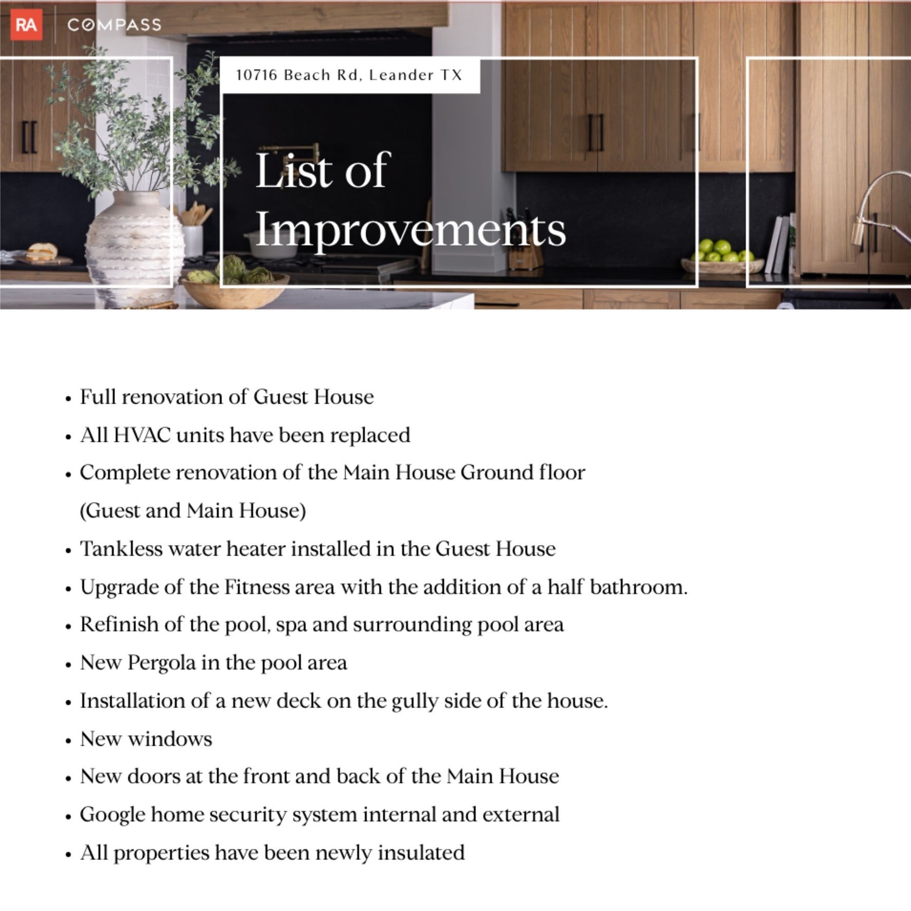 A Luxury Waterfront Estate on Lake Travis with two homes, three sunset decks, private boat dock and over $1M in custom renovations. Enjoy a daily swim in the pool surrounded by luscious gardens, a nearby shaded pergola for meals and a cozy firepit perfect for creating those special memories with your family and friends! The main balcony has a wood burning fireplace & grill. It is a perfect spot to relax in the evening as the breeze comes through and the boats quietly pass by! The main home includes a personal gym with an added half bath, secondary primary suite upstairs, two offices and a guest bedroom. This luxury waterfront estate was built for entertaining and relaxing in style! Guest house is an income producing AirBnB with over 100 5 STAR Reviews. The loft is currently used as second bedroom. Income docs, renovations, virtual tour & floorplans available! Property is in the Leander ETJ & doesn't require permitting for STR!