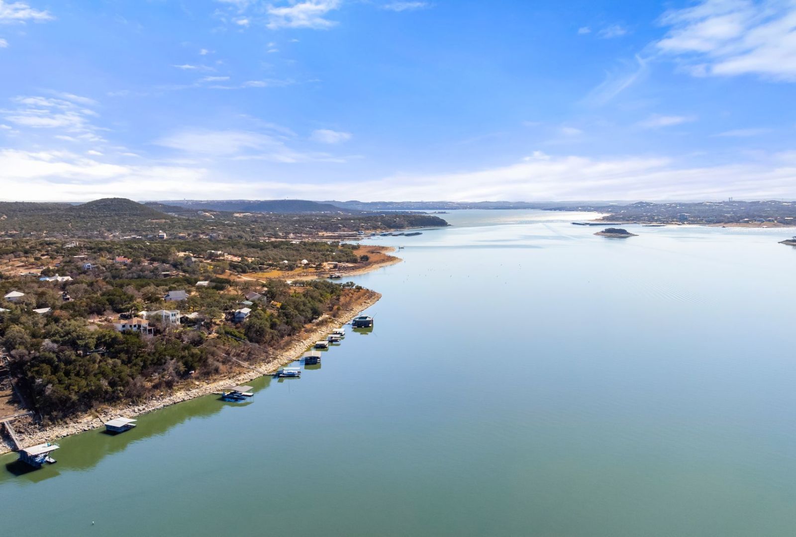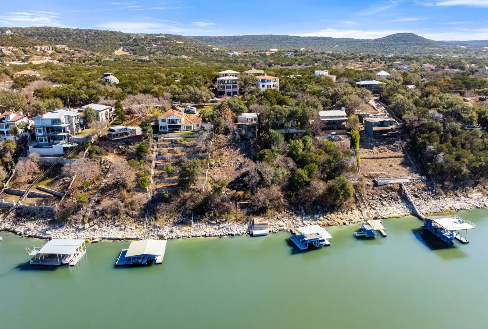 Motivated Sellers! This deep-water Lake Travis property in Volente offers main-body waterfront, incredible lake views, and one of the best values currently available at its price point. With deep-water frontage, the property is well positioned for a future dock while already providing shoreline access. Elevated above the lake, the home captures sweeping lake views and year-round usability. The home will convey with newly purchased furnishings, allowing buyers to enjoy the property immediately or update at their own pace. Well suited for use as a private lake house or a potential short-term rental with approval from Village of Volente. The floor plan includes two bedrooms plus a study and three full bathrooms, with an open main level featuring a spacious kitchen, dining area, multiple living spaces and access to two expansive decks that extend the living space outdoors. The upper-level bedroom enjoys stunning lake views, private deck access, and a dedicated bath and study. Located in a quiet waterfront neighborhood with a single point of entry, the setting feels private while remaining highly convenient—just 10 minutes to Four Points (620 & 2222) for shopping, dining, and entertainment, and approximately 30 minutes to downtown Austin. The property is zoned to highly rated schools, including Grandview Hills, Four Points Middle, and Vandegrift High School, and is close to local favorites such as Volente Beach Club, Beachside Billy’s, Shack 512, Stiechen Park, and a nearby fire station. Offering deep water, main-lake access, panoramic views, and immediate usability, this property stands out as a rare opportunity on Lake Travis—priced at lot value and ready to enjoy from day one.