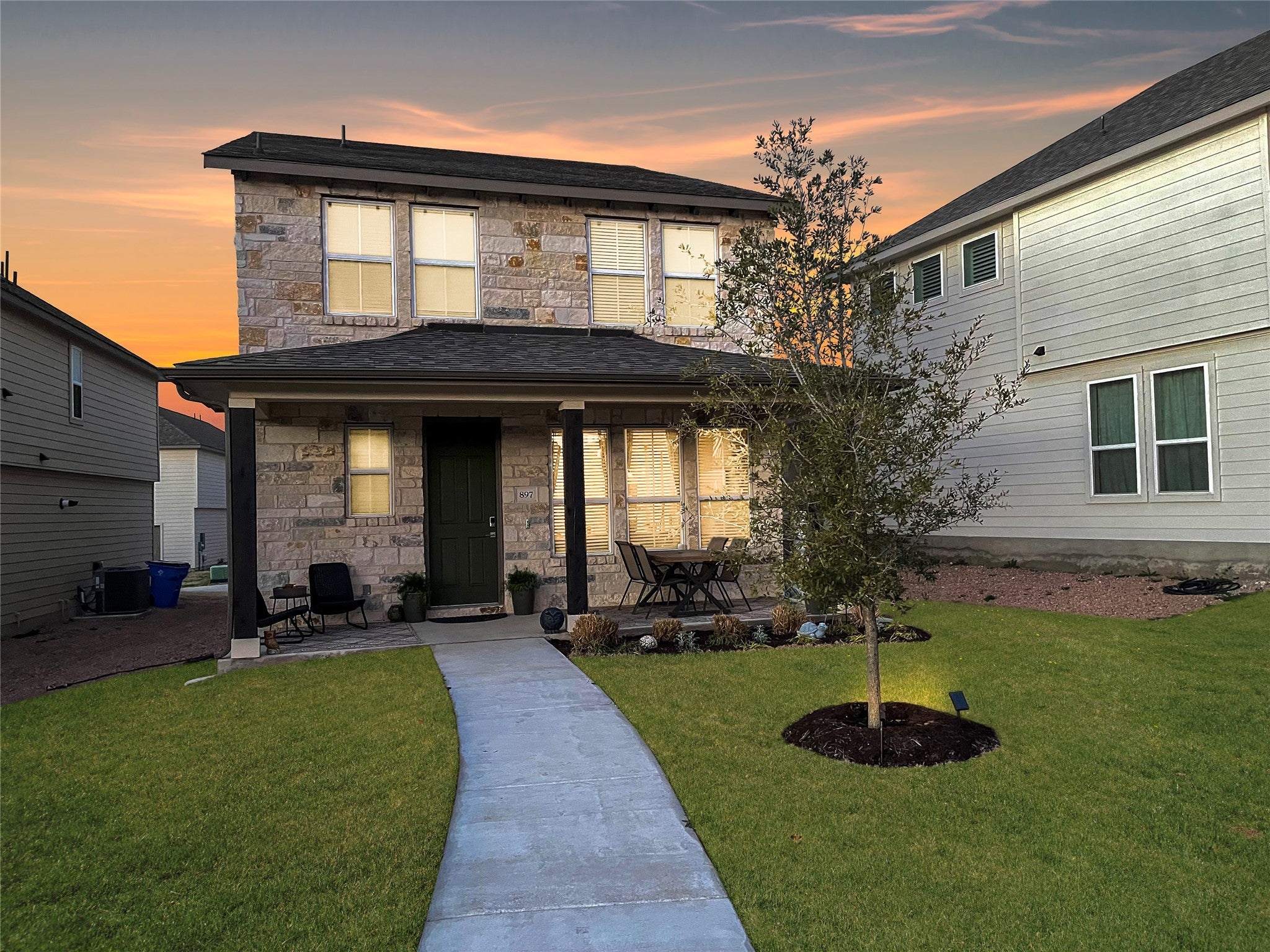 FULLY FURNISHED - Charming 3 bed/2.5 bath home in walking distance to Founders Park and downtown Mercer Street in the heart of Dripping Springs! Enjoy an open floor plan with kitchen, living, and dining along with half bath downstairs. Kitchen has stainless steel appliances, white cabinets and subway tile, and plenty of storage space! Kitchen also includes a large center island with quartz countertops, a spacious corner pantry, and a pocket desk and/or coffee bar for your convenience! All bedrooms located upstairs which includes primary suite with large walk-in closet and two bedrooms on other side of game room/flex space. Full bath with tub upstairs as well! Enjoy dinner outside under the beautiful "Big Sky" with a covered patio out front! Neighborhood amenities include private gated pool and playground, large sidewalks, community mailboxes, and easy access to trails, fields, and playground at Founders. Walk or bike to local coffee shop, brewery, boutiques, H-E-B for groceries, Farmers Market on Wednesdays and more! Majority of furniture seen in the photos included in this rental. Bedrooms include: California king bed in primary suite, queen bed in second room, and desk with rocking chair in third room. Third room can also fit a pack and play or crib if needed. Futon in game room. Home includes wifi, keyless entry, and full size high efficiency washer and dryer. Parking included with 2 car garage in back as well as plenty of street parking in front.