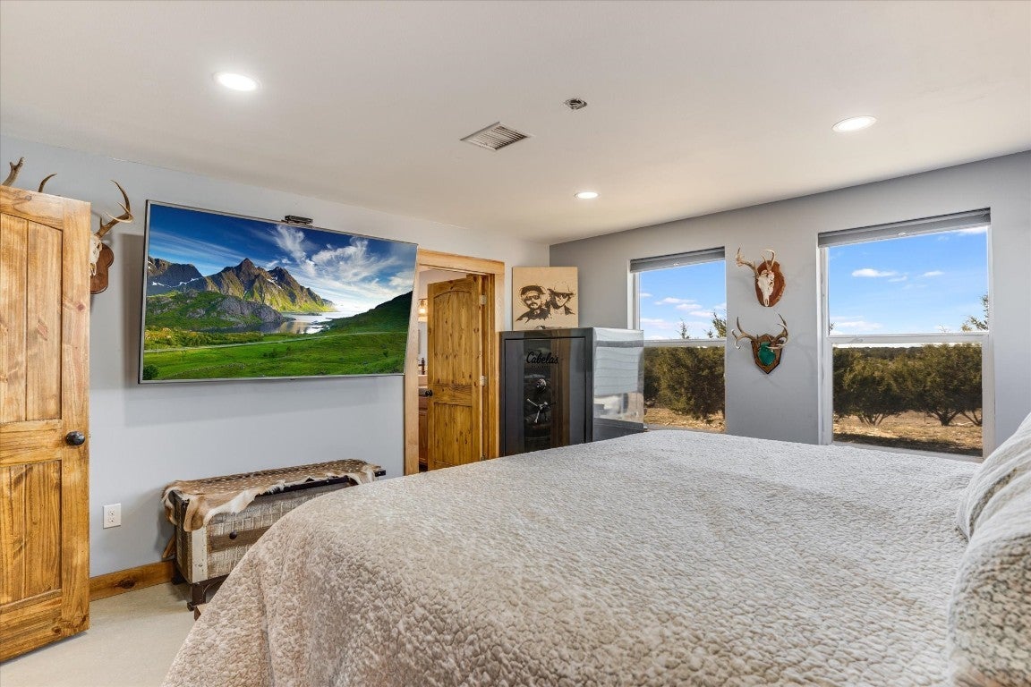 Stunning Barndominium style home on 22+ UNRESTRICTED acres, less than 15 minutes north of downtown Burnet! This custom home was built in 2022 with incredible attention to detail. Privately tucked away from the road, the entire property offers panoramic views of the rolling Texas hill country! Fully fenced with a large metal barn, your animals will have plenty of space to roam and keep warm! With the agriculture exemption already in place, this one of a kind opportunity comes with great tax savings! The split floor plan - double primary - layout utilizes every inch so there is zero wasted space. The main living area boasts high ceilings, great natural lighting and a beautiful wood burning fireplace. The biggest selling feature of this home is the KITCHEN! The gorgeous eat-in kitchen offers Z-Line appliances, solid wood cabinets, a concrete island the size of Texas - and let's not forget the walk-in pantry! The main primary suite offers great views & a private oasis to escape! The walk-in shower is one to see - custom stonework with timeless style! All three bathrooms offer solid wood cabinets, concrete countertops, and custom stonework as well. All four bedrooms are spacious with large closets, and the laundry room doubles as a butler's pantry. The front and back porches are both covered with private fencing from the rest of the property. Driving around you will also find a stock tank at the bottom of one pasture, shooting berm, a wet weather creek that runs through the middle of the property, and a FULL 50 AMP RV hookup and storage. Abundant wildlife throughout and sunsets here are unmatched - this is a special piece of land. You can go from hunting in your deer blind to downtown Austin in just an hour - it's out in the country, but close to everything! Zoned to Burnet schools & ready for move-in! Find yourself at home here!