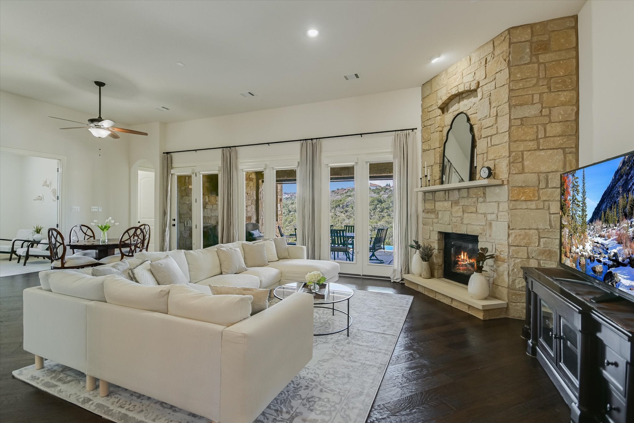 Enjoy peaceful privacy with panoramic, protected greenbelt views in a remarkably convenient location within Rough Hollow — close to both the Amenity Center and Yacht Club. Enjoy the refreshing negative edge pool and hot tub, with shallow tanning ledge and in-pool seating, spacious pool deck and luxurious outdoor living with no intrusions, surrounded by nature. The warmth of this meticulously cared for house is immediately felt as you step into the welcoming grand entryway, highlighted by an elegant winding staircase. The house flows beautifully for daily life and entertaining. Lots of flexible and usable space on both floors. Situated on the main level are the primary bedroom and bath, guest suite, and a convenient flex room that can serve as an office, play room, exercise room, or additional guest room. The spacious kitchen offers ample counter space, a useful island, plus counter seating. The 2nd floor has flex space for play, exercise, and entertaining along with another room with full bath that can be converted into a 5th bedroom. The 2nd floor covered balcony delights with lush scenery, including a view of Lake Travis. Upgraded features include diagonal hardwood floors, soaring ceilings and 8’ doors. The house is situated on a fully fenced large lot with usable side yards. (Option to purchase fully furnished).
