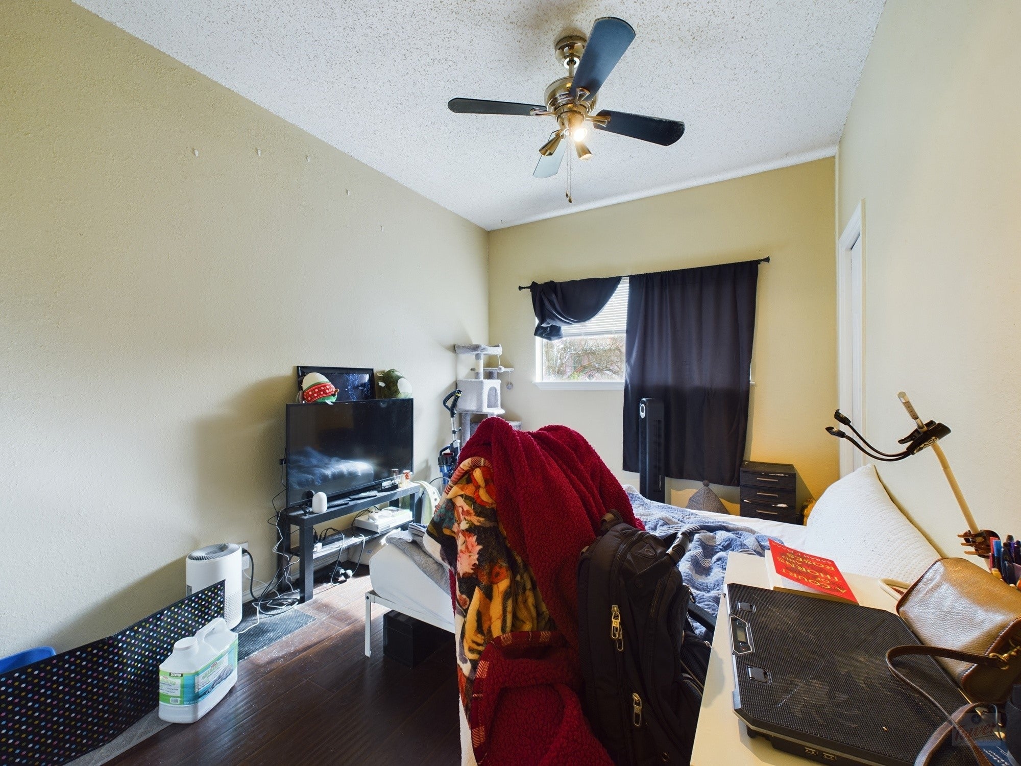PRE-LEASING FOR AUGUST 2026! 400 sq. ft. and feels roomy (not a studio). Large bedroom with two closets, open kitchen with a garden window, spacious living area with modern energy efficient ceiling fans, and high ceilings! Plenty of natural light. Designer upgrades and color scheme-upgrades. Wood floors, Granite countertops, Tin backsplash, stainless appliances, new HVAC system, corner unit, shows very well, non-smoking unit. Small, well-managed, 16-unit, one-bedroom. Reserved parking space included. Water Wastewater Trash included. Community W/D