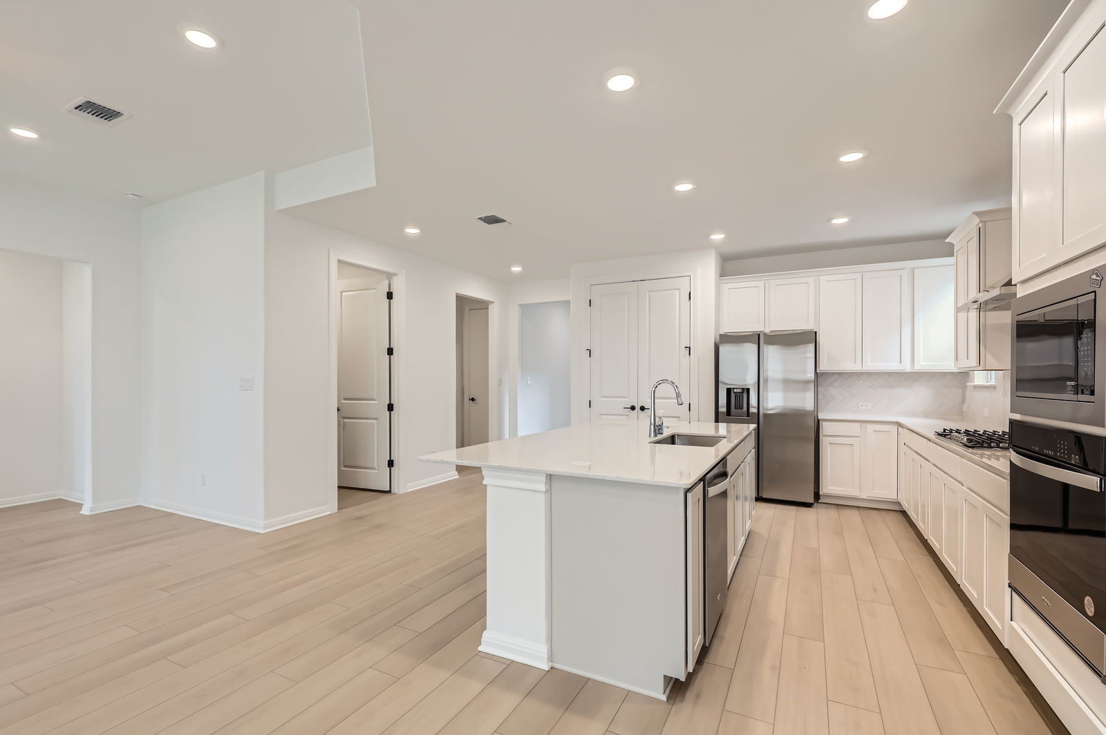 Welcome to this stunning, recently constructed home in the highly desirable Wolf Ranch community of Georgetown. This thoughtfully designed floor plan features light luxury vinyl plank flooring throughout the main level and an open-concept layout that makes entertaining a breeze. The gourmet kitchen serves as the heart of the home with a large island, premium stainless appliances, a gas range, and two pantries for all your storage needs. Convenience is key with a dedicated mudroom leading to the garage and a laundry room equipped with a washer and dryer. The primary suite is a true retreat on the first floor, offering an oversized walk-in closet, dual vanities, a soaking tub, and a large shower with a bench seat. A second bedroom on the main level includes a full bath with an extended shower, making it an ideal setup for guests. Upstairs provides even more space with two additional bedrooms, a versatile game room, and a massive media room for movie nights. Outside, the extended patio includes a gas line for grilling and overlooks a low-maintenance backyard shaded by mature neighboring trees. Living here means you are just minutes away from the charm of the historic Georgetown Square and the high-end shopping at Wolf Ranch Town Center. The community is perfectly positioned for an easy commute to major employers like St. David’s Georgetown Hospital and Southwestern University. Families will appreciate being within the boundaries of top-rated Georgetown ISD schools, including Wolf Ranch Elementary located right in the neighborhood. For outdoor enthusiasts, the nearby San Gabriel Park offers beautiful trails and river access. This home is truly in a "prime" location for anyone looking to plant some roots in a vibrant area.