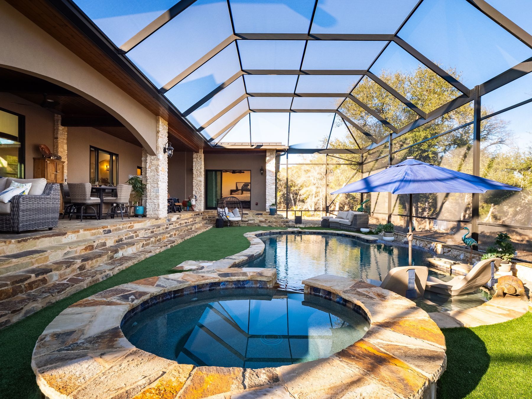Behind the gates of Escondida Ranch, on over 12 private acres just seven minutes from downtown Wimberley, Rancho Solara introduces a rare interpretation of Hill Country living—where architecture, privacy, and nature exist in perfect balance. Completed in 2022, the residence was thoughtfully designed with both scale and livability in mind. A private courtyard entry sets the tone, leading into a dramatic stone welcome hall and expansive great room defined by 19-foot ceilings and exposed douglas fir trusses. Natural materials, intentional sightlines, and a split-wing layout create a home that feels both grand and grounded. Each wing is anchored by its own primary suite, offering flexibility for guests or multigenerational living. A detached guest apartment provides additional accommodations, while five garage bays ensure ample space for vehicles, equipment, or future lifestyle needs. With over twelve acres, the property offers the freedom to continue expanding—whether for equestrian use, additional structures, or simply preserving open land. What truly distinguishes Rancho Solara is the fully enclosed outdoor atrium—an architectural feature rarely seen in Texas. Spanning the entire rear of the home and rising approximately 30 feet, this screened structure protects the pool, outdoor kitchen, and living areas while preserving the openness and serenity of the surrounding landscape. It allows for true indoor-outdoor living, free from the limitations of weather or insects. Beyond the atrium, rolling pastureland stretches toward the horizon, where blackbuck antelope move through the property each evening. Their presence not only enhances the experience of living here but also supports the agricultural exemption that benefits the entire community. Rancho Solara is a property defined by intention—designed for privacy, longevity, and a lifestyle that is increasingly difficult to find in the Texas Hill Country.