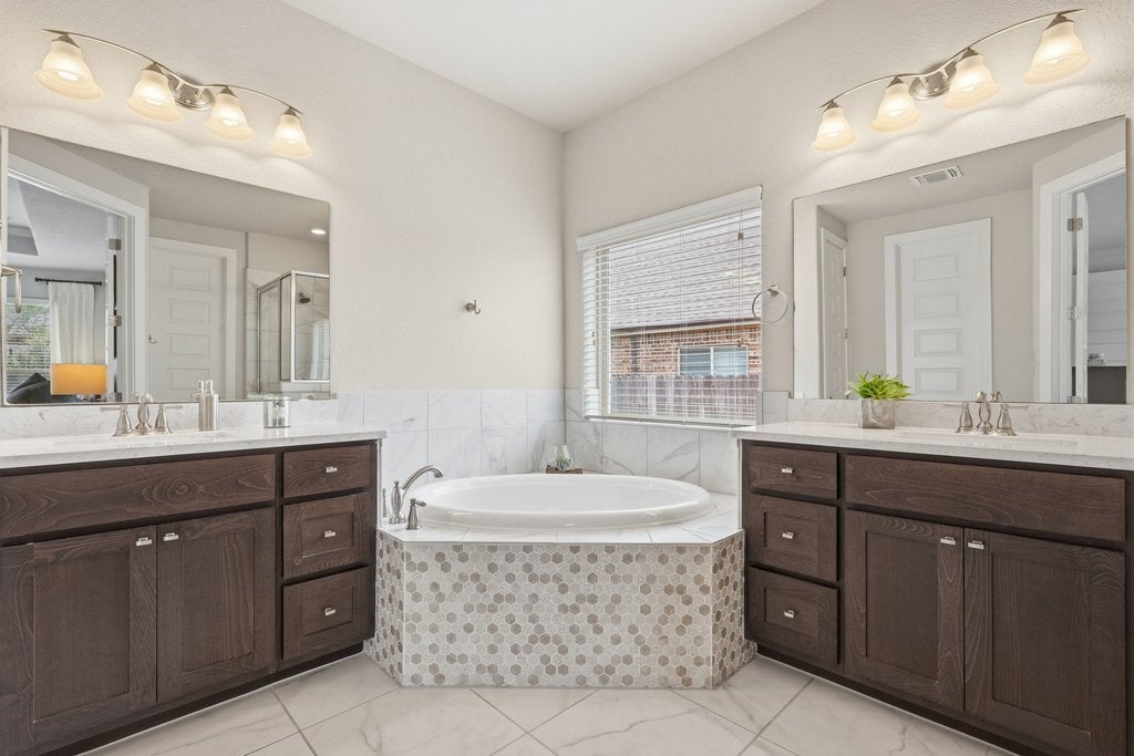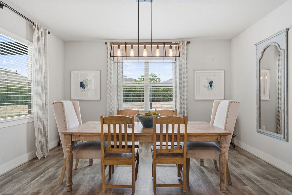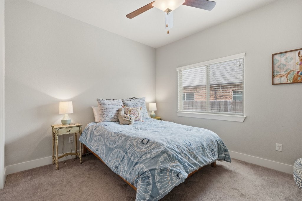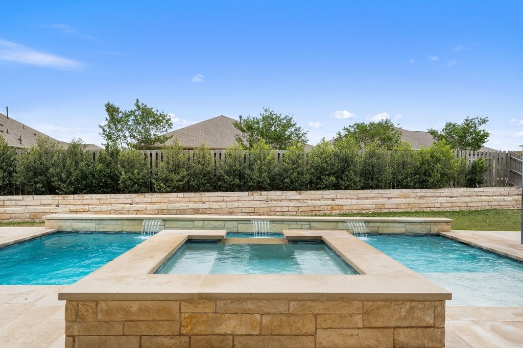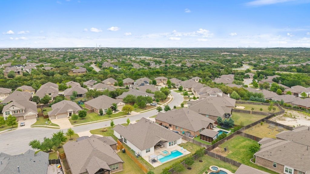 Welcome to 191 Tabago Court, a stunning single-story home tucked away on a quiet cul-de-sac in the highly sought-after Belterra community. Built in 2018 by Scott Felder Homes and thoughtfully upgraded throughout, this expansive residence offers over 3,500 square feet of flexible, light-filled living space designed for both everyday comfort and elevated entertaining. Step inside to an open-concept floorplan featuring upgraded wood-look tile flooring, soaring ceilings, and designer touches at every turn including a striking herringbone subway tile backsplash that anchors the beautifully appointed kitchen. With 4 bedrooms plus two dedicated offices (or option for 5 bedrooms and one office), this home effortlessly adapts to your lifestyle, whether you're working from home, hosting guests, or growing into your next chapter. Enjoy not one, but two dining areas, perfect for everything from casual breakfasts to holiday gatherings. The seamless indoor-outdoor flow leads you to a covered outdoor entertaining space overlooking a private backyard oasis complete with a sparkling pool and relaxing hot tub, ideal for soaking up those warm Central Texas evenings. Situated on a premium cul-de-sac lot, this home offers both privacy and community, all within minutes of top-rated schools, scenic trails, and the best of Belterra living.