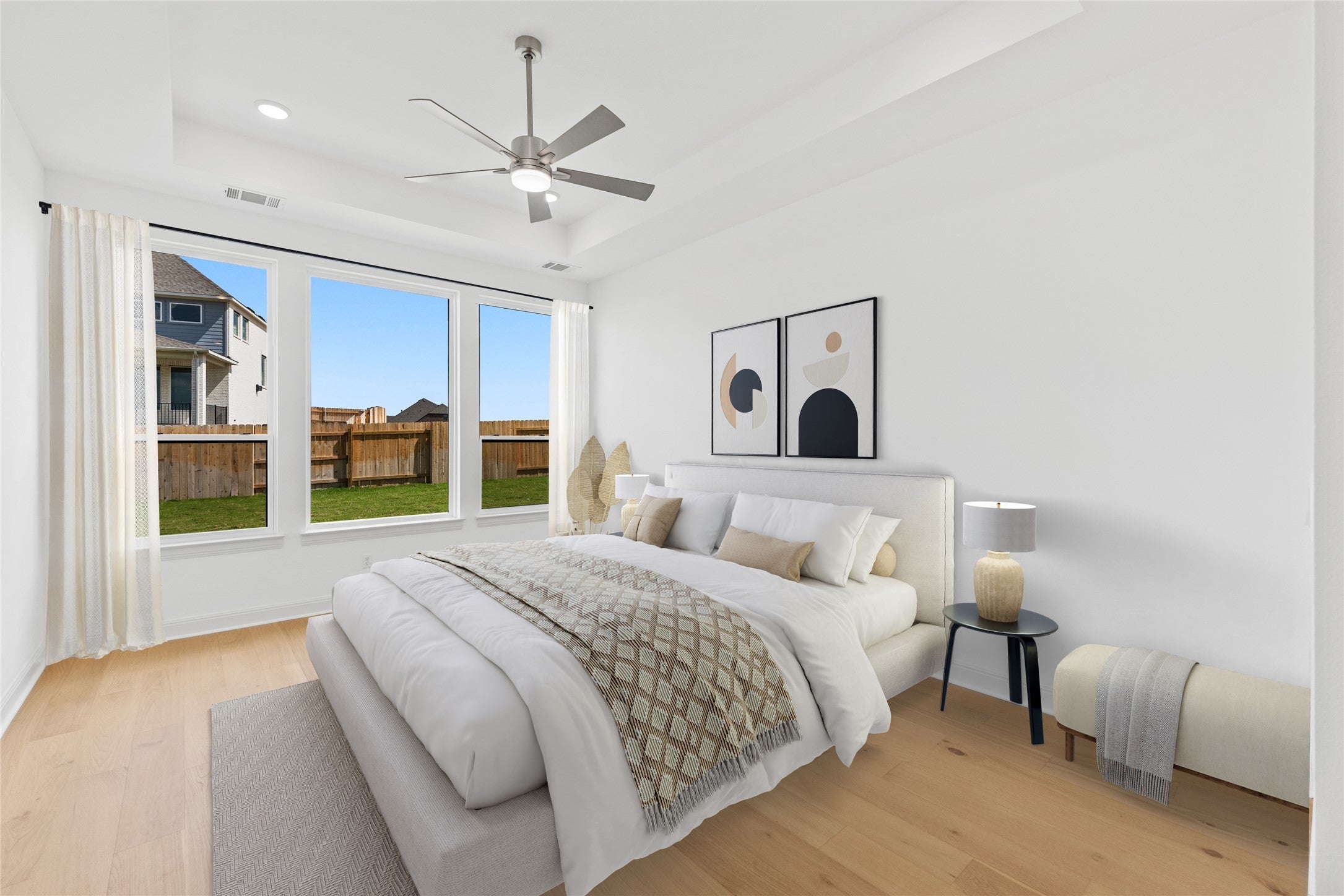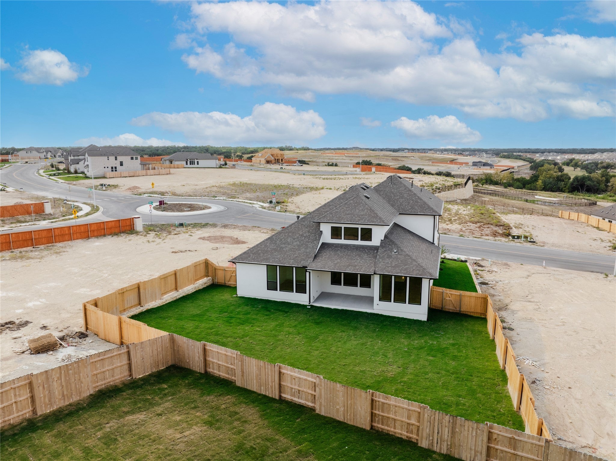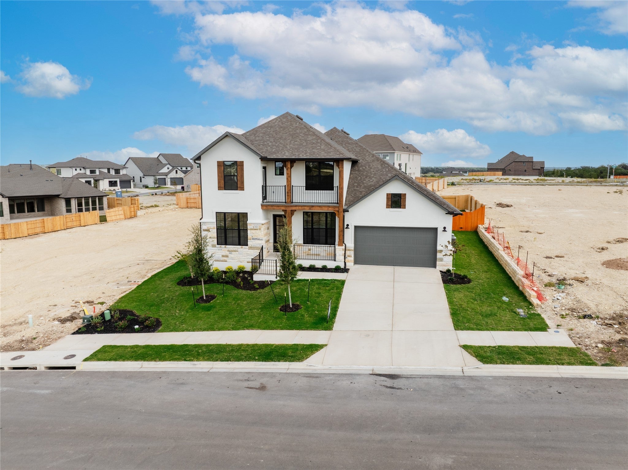 Step into elevated new construction living with this stunning 3,463 sf Deerfield II floor plan offering 4 bedrooms and 4 baths in Liberty Hill’s desirable Lariat community. This Drees Custom Home is designed with both functionality and style in mind, the home showcases soaring ceilings, expansive windows, beautiful street appeal, and a bright open layout ideal for everyday living and entertaining. Upon entry, a private home office sits to the left while a secondary en suite bedroom is positioned to the right, providing flexibility for guests or multigenerational living. Continuing down the hall, a powder bath and dedicated media room are located on the left, with staircase access on the right leading to the upper level. The spacious family room anchors the home with dramatic ceiling height and a fireplace focal point seamlessly connecting to the designer kitchen and breakfast area to create an ideal gathering space. Tucked privately off the family room, the primary suite offers a relaxing retreat featuring a spa like bath with soaking tub, glass shower, dual vanities, and generous walk in closet. A well appointed laundry room includes a utility sink, counter workspace, and both upper & lower cabinetry, while the mudroom enhances daily functionality and organization. Upstairs, one bedroom is en suite while the additional bedroom is served by a full bath and is provided private access to a front facing outdoor balcony. A versatile game room and loft complete the upper level, creating space for relaxation, work, or play. Outdoor living includes a covered patio overlooking the fenced backyard, while the 2½ car tandem garage provides extra storage, workshop space, or room for recreational vehicles. Located within the Lariat master planned community, residents enjoy resort style amenities including pool, fitness center, fishing areas, dog park, playground, picnic spaces, sidewalks, street lights, planned social events, and scenic walk, bike, and hike trails.