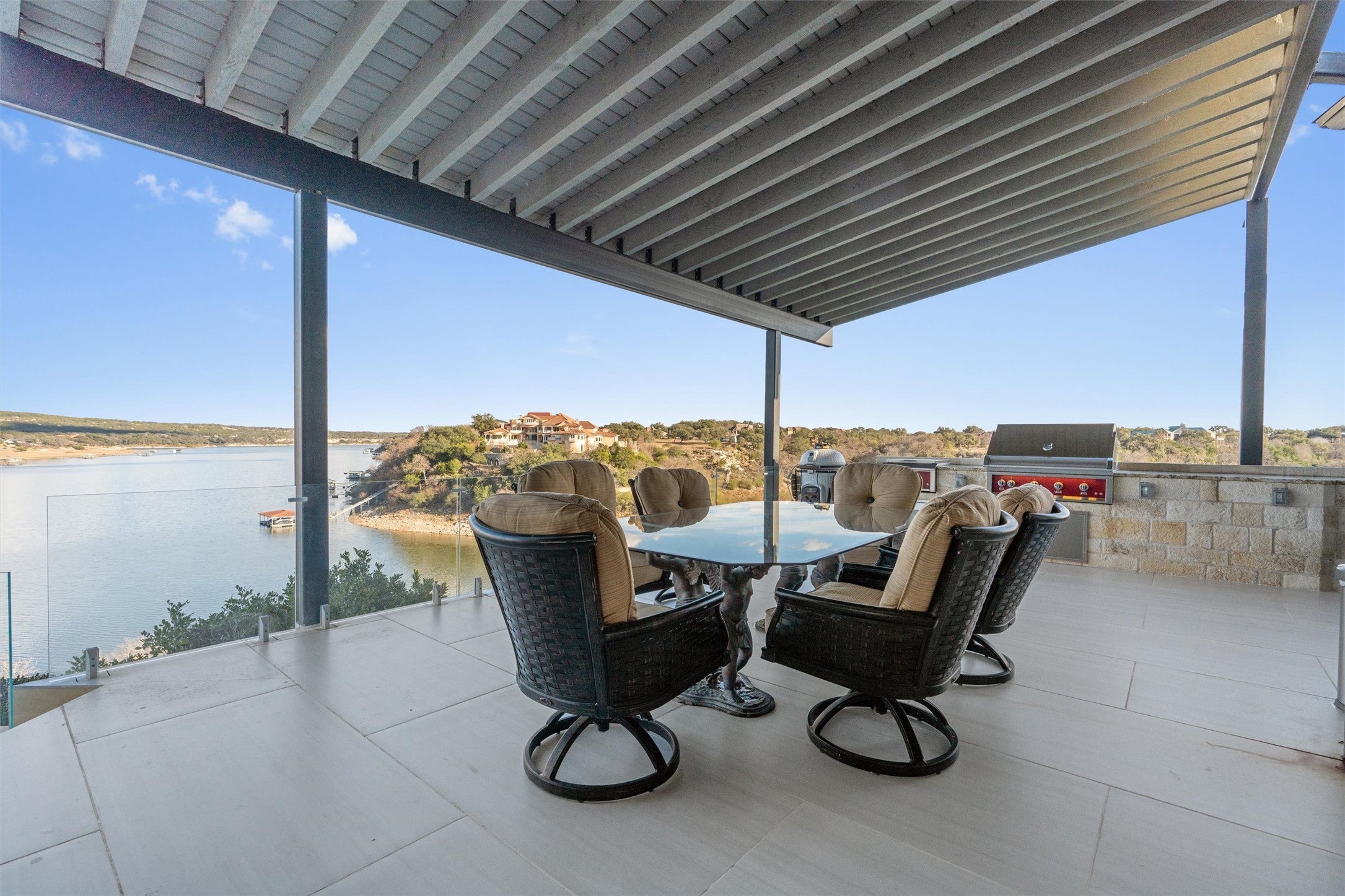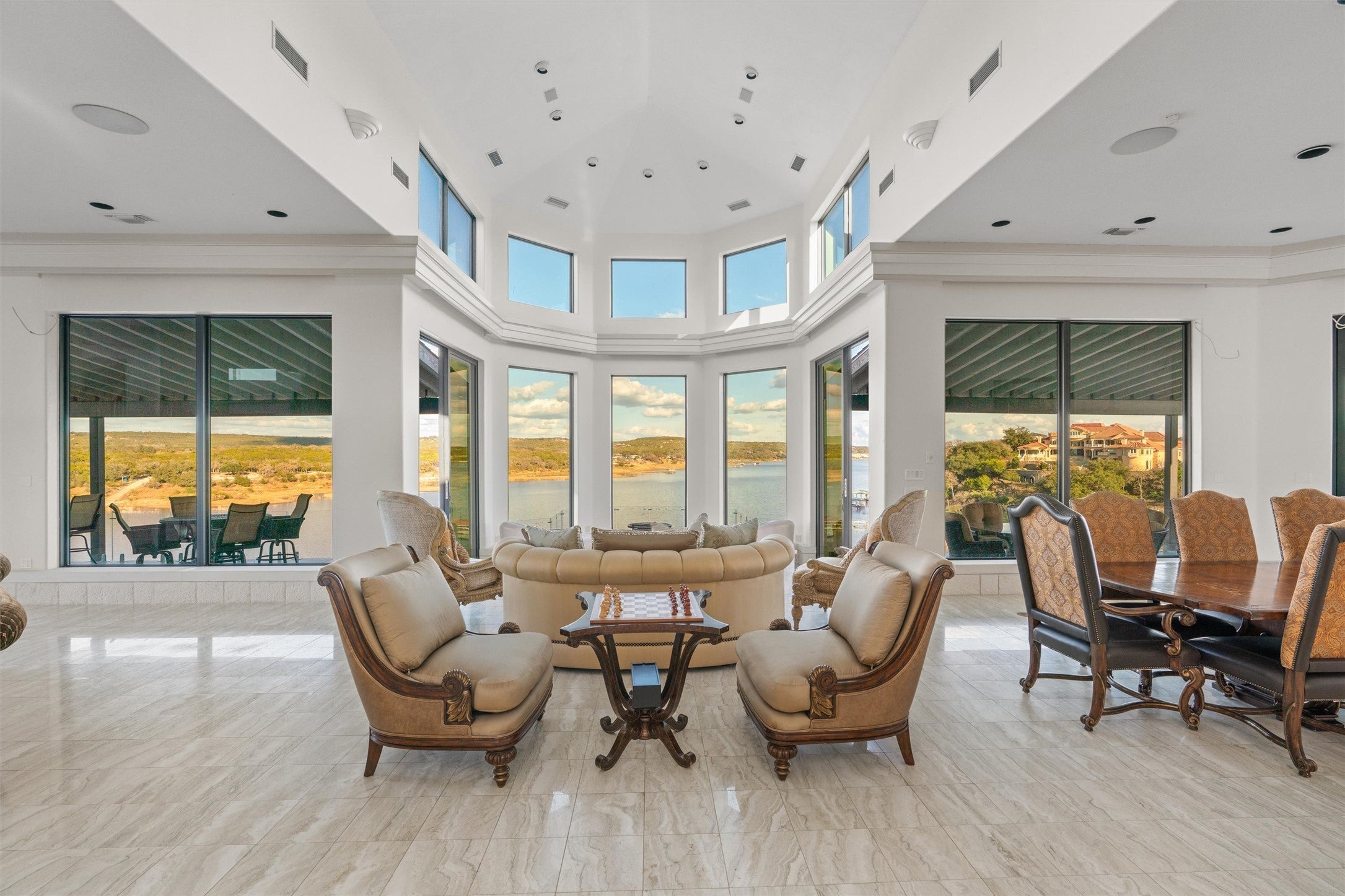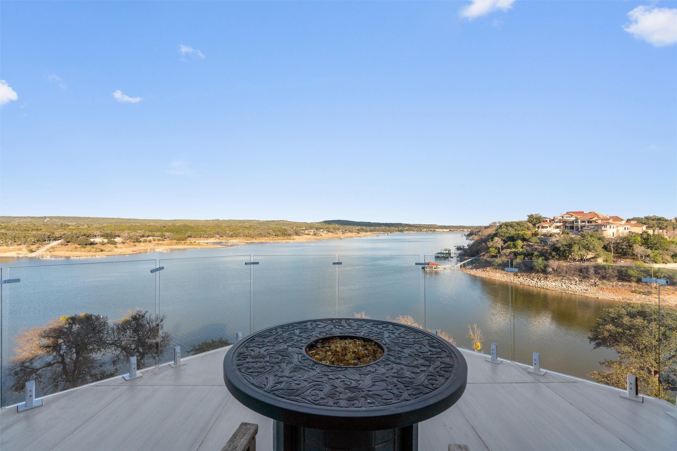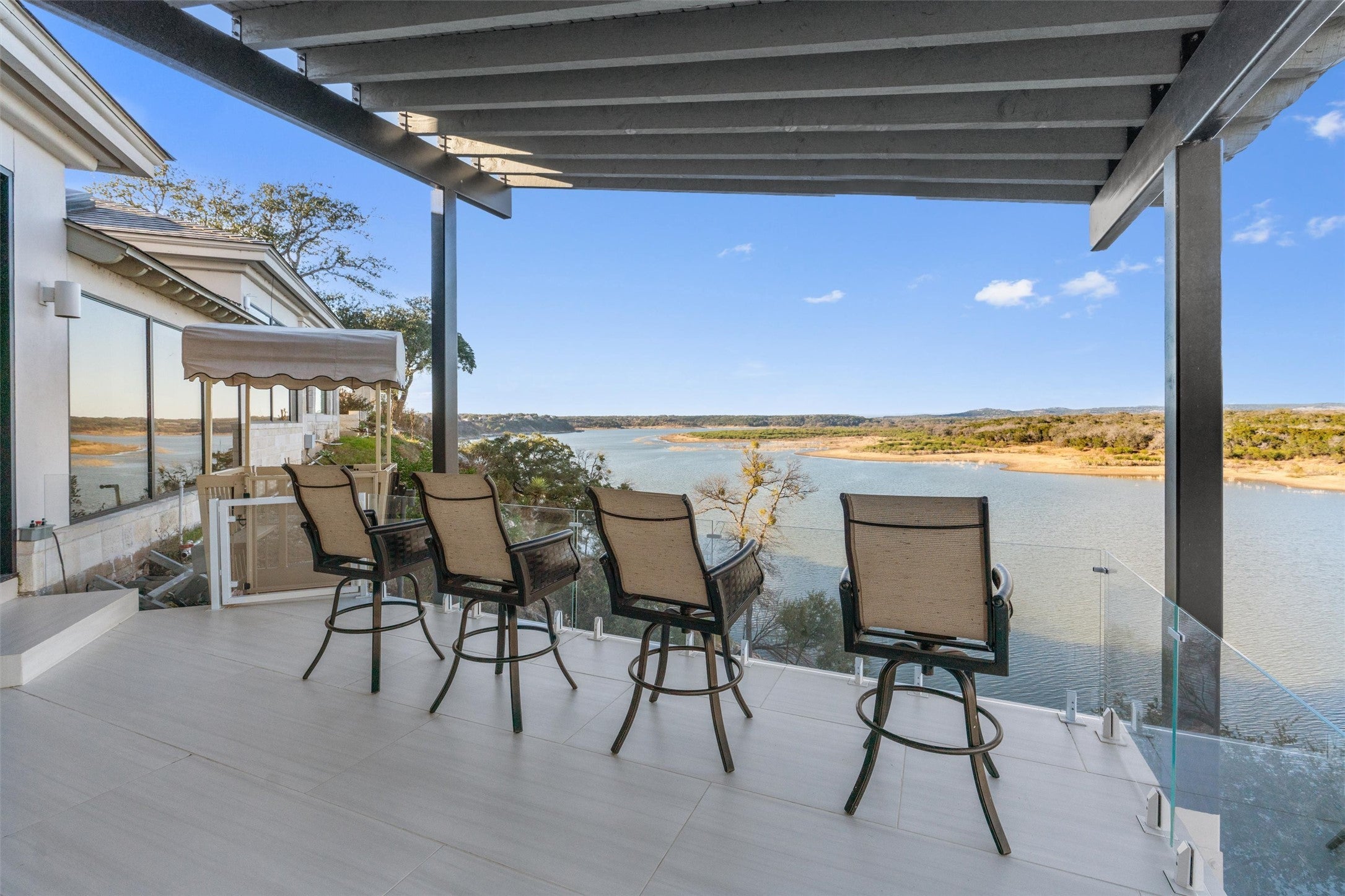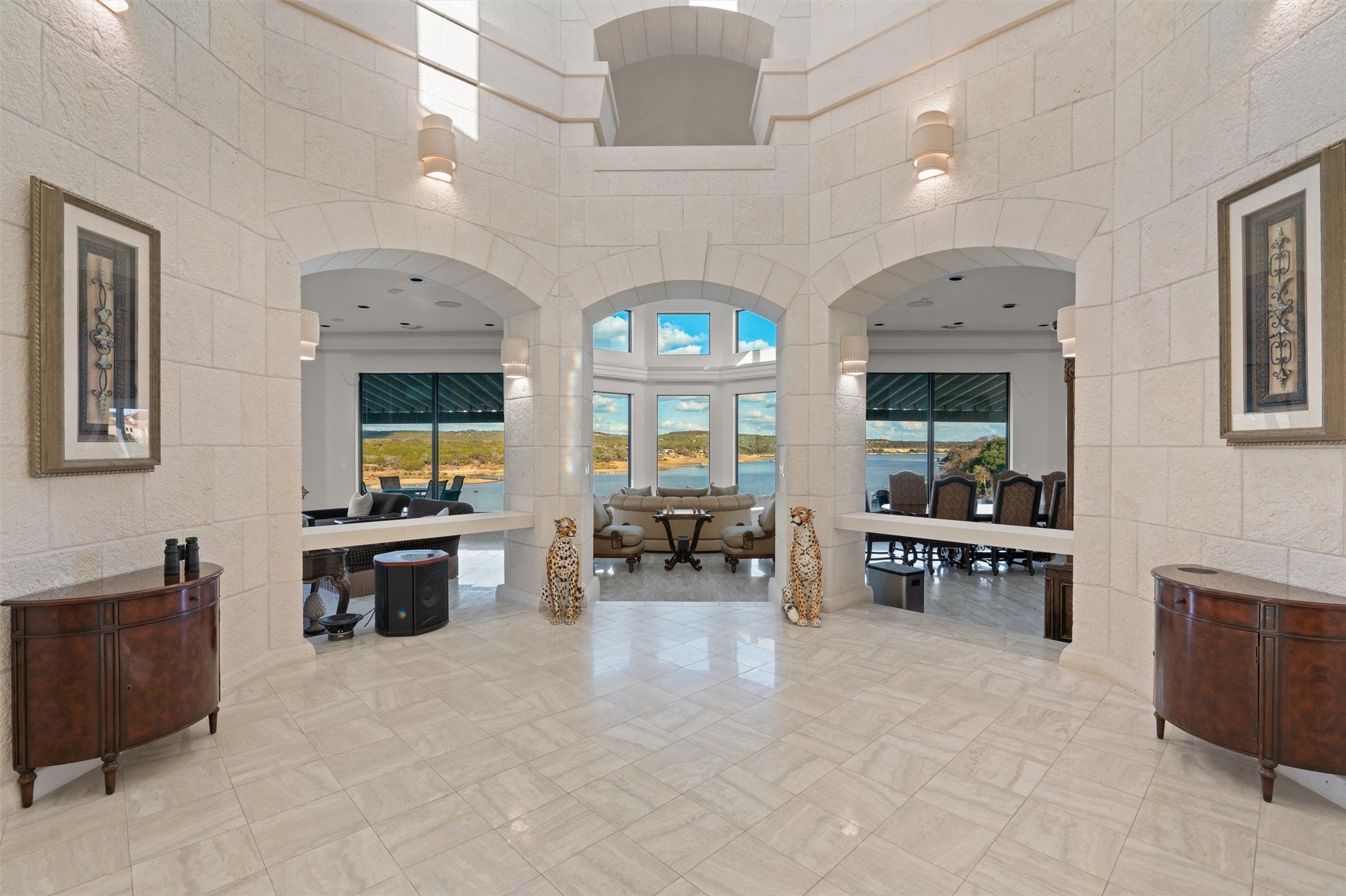 Nestled in the prestigious gated community of Barton Creek lakeside, this residence offers unparalleled lakefront living w/1200+/- feet of Lake Travis shoreline, park land across the lake and resort-style amenities on an expansive 4.7 acre peninsula lot. The main house is 10,202 +/- sq ft. Enter through a grand foyer of hand carved limestone with soaring windows framing the 270 degrees of lake views. Entertain with ease as the formal living and dining areas transition effortlessly into the kitchen, highlighted by extensive bar seating. The gourmet kitchen boasts top-of-the-line appliances, both gas and electric and a massive 8-foot by 14-foot center island. An open-concept living space separates the formal living room and dining room with enough space for a 32-foot-long table and seating for 30+ people. Additional first-floor highlights include; large master bedroom with 600 square feet of closets, a dedicated office off the master bedroom with stunning lake views, Home Theater room with top of the line equipment, and 3 ensuite bedrooms with serene views of the lake. Adjacent to the kitchen is large private 2nd floor guest suite with stunning lake views, equipped with elevator and wheelchair-accessible bedroom and bath. Two covered decks with panoramic lake views provides ample space to entertain friends and family. Take the tram down to the lakeside fire-pit area, or continue to your private 2-story dock featuring 2 slips on the lower level, and an upper covered deck w/bar, and full-size refrigerator. Plenty of parking for guests behind the private gate. Five cars of garage space includes an EV charger. Your own private road provides you access to a secondary cove dock location and private ramp. Enjoy an optional membership to the Barton Creek Golf and Tennis club.