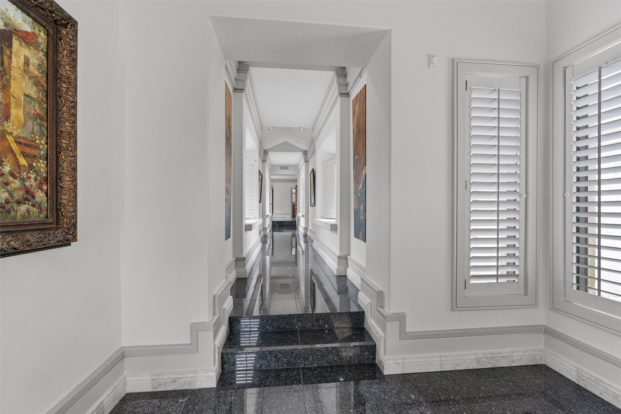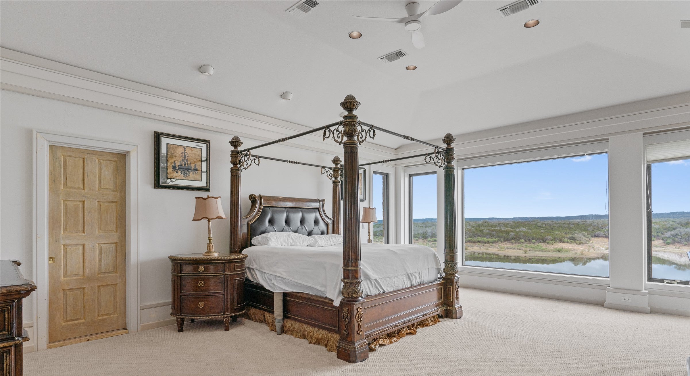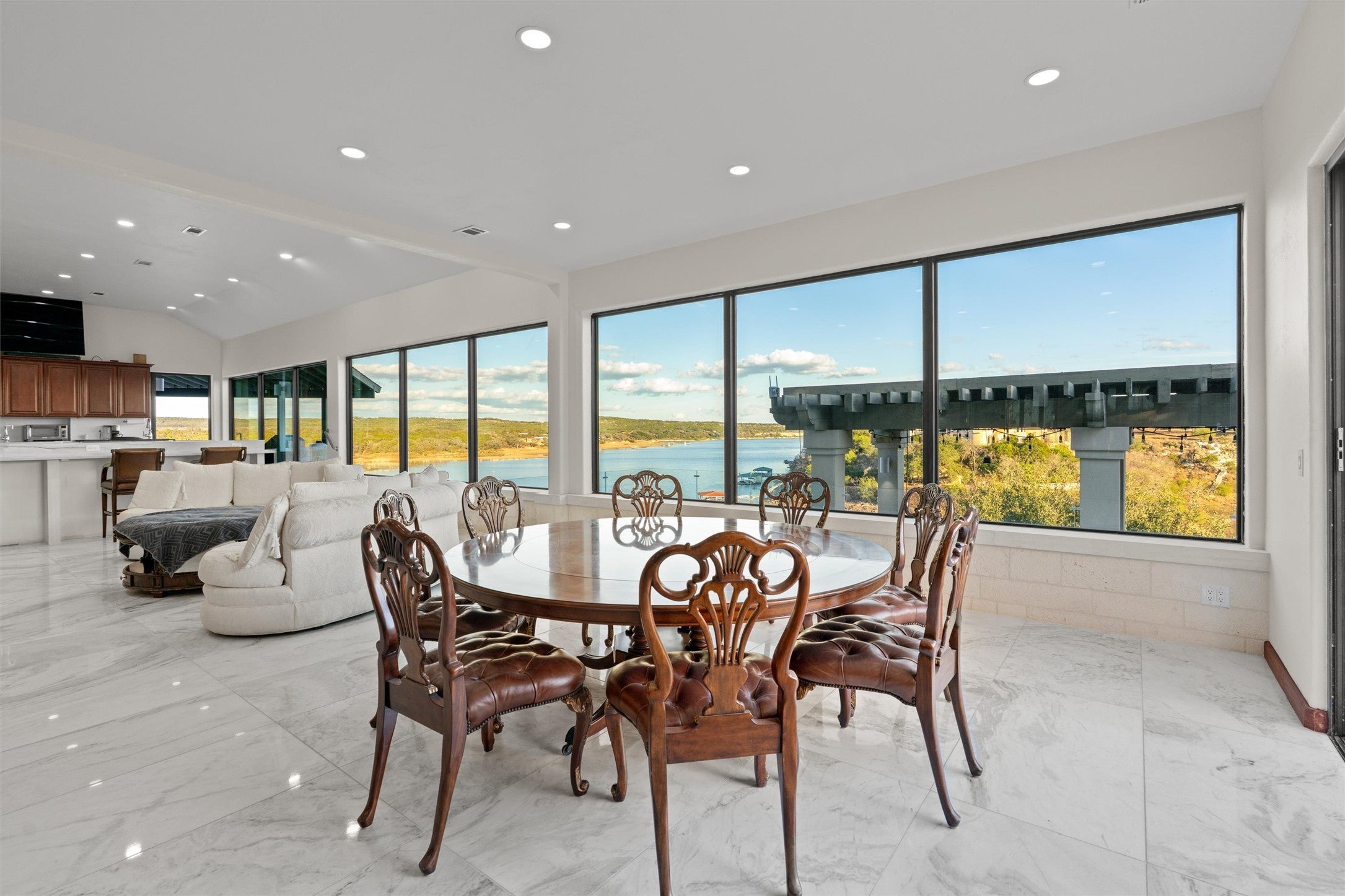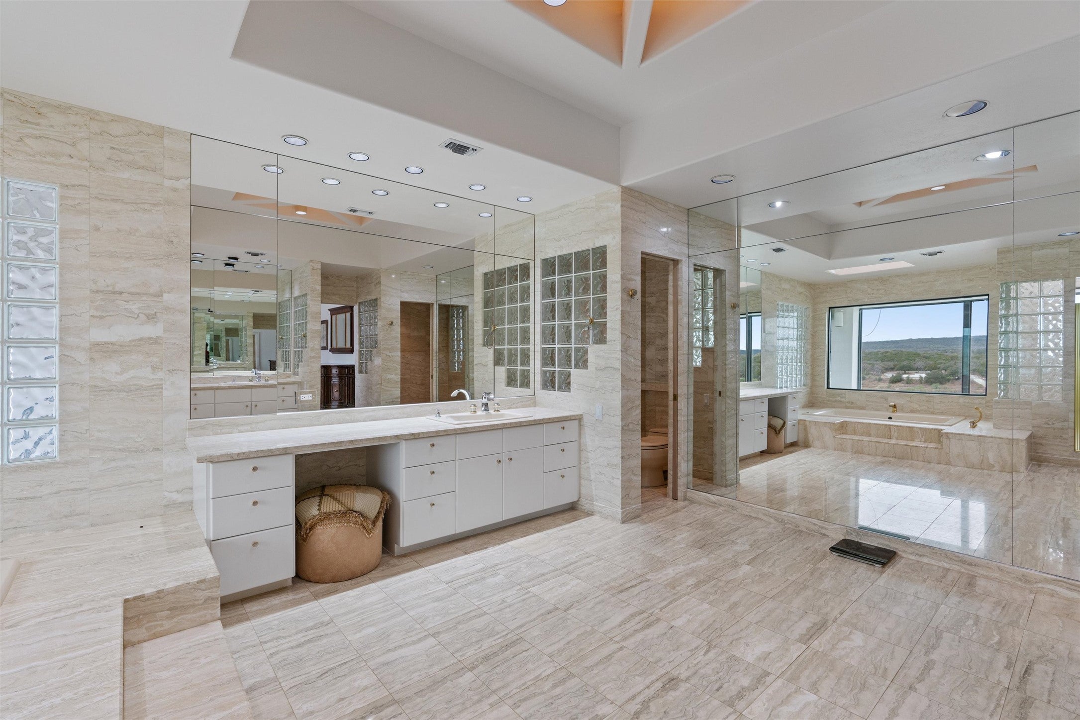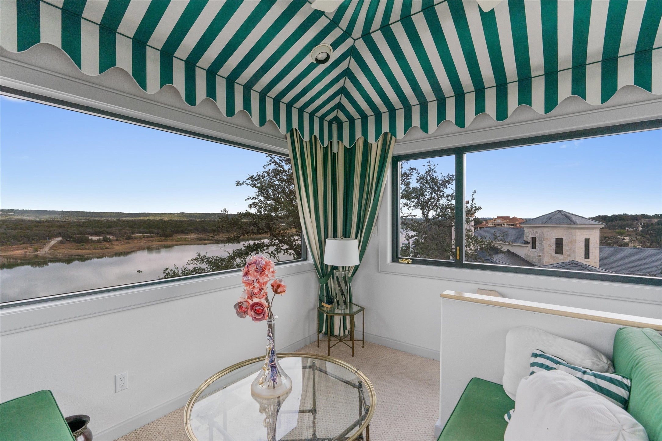 Nestled in the prestigious gated community of Barton Creek lakeside, this residence offers unparalleled lakefront living w/1200+/- feet of Lake Travis shoreline, park land across the lake and resort-style amenities on an expansive 4.7 acre peninsula lot. The main house is 10,202 +/- sq ft. Enter through a grand foyer of hand carved limestone with soaring windows framing the 270 degrees of lake views. Entertain with ease as the formal living and dining areas transition effortlessly into the kitchen, highlighted by extensive bar seating. The gourmet kitchen boasts top-of-the-line appliances, both gas and electric and a massive 8-foot by 14-foot center island. An open-concept living space separates the formal living room and dining room with enough space for a 32-foot-long table and seating for 30+ people. Additional first-floor highlights include; large master bedroom with 600 square feet of closets, a dedicated office off the master bedroom with stunning lake views, Home Theater room with top of the line equipment, and 3 ensuite bedrooms with serene views of the lake. Adjacent to the kitchen is large private 2nd floor guest suite with stunning lake views, equipped with elevator and wheelchair-accessible bedroom and bath. Two covered decks with panoramic lake views provides ample space to entertain friends and family. Take the tram down to the lakeside fire-pit area, or continue to your private 2-story dock featuring 2 slips on the lower level, and an upper covered deck w/bar, and full-size refrigerator. Plenty of parking for guests behind the private gate. Five cars of garage space includes an EV charger. Your own private road provides you access to a secondary cove dock location and private ramp. Enjoy an optional membership to the Barton Creek Golf and Tennis club.