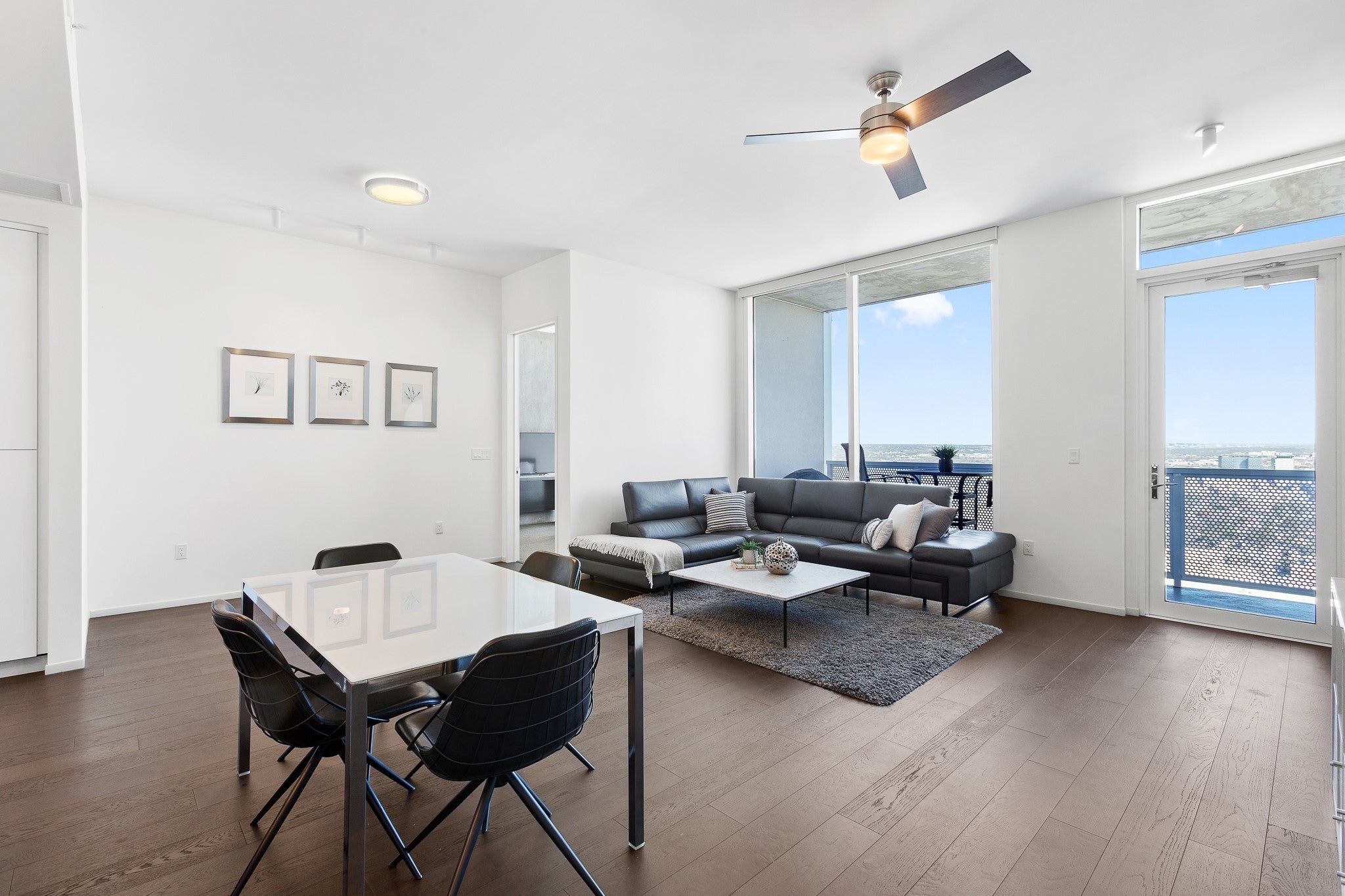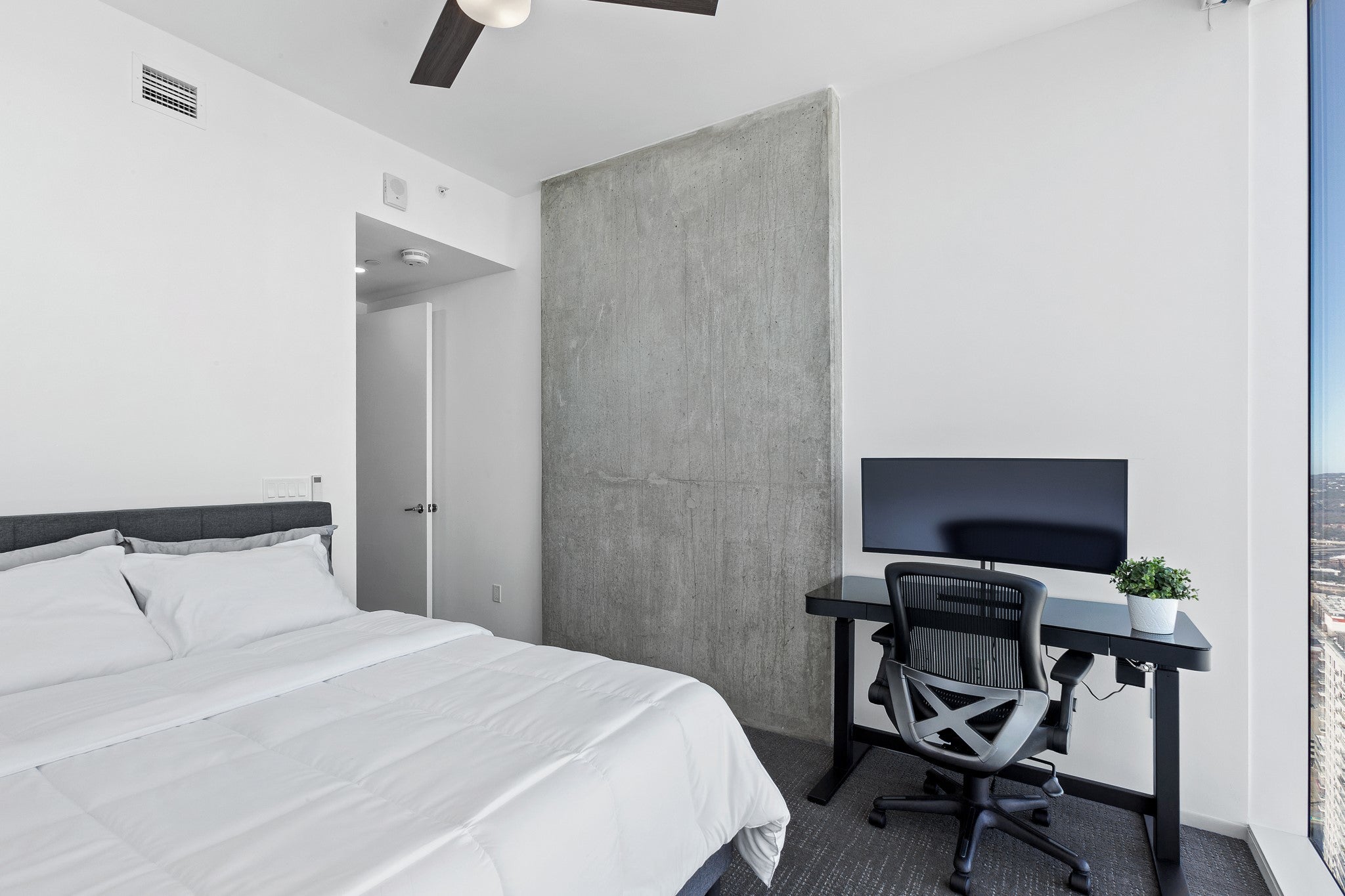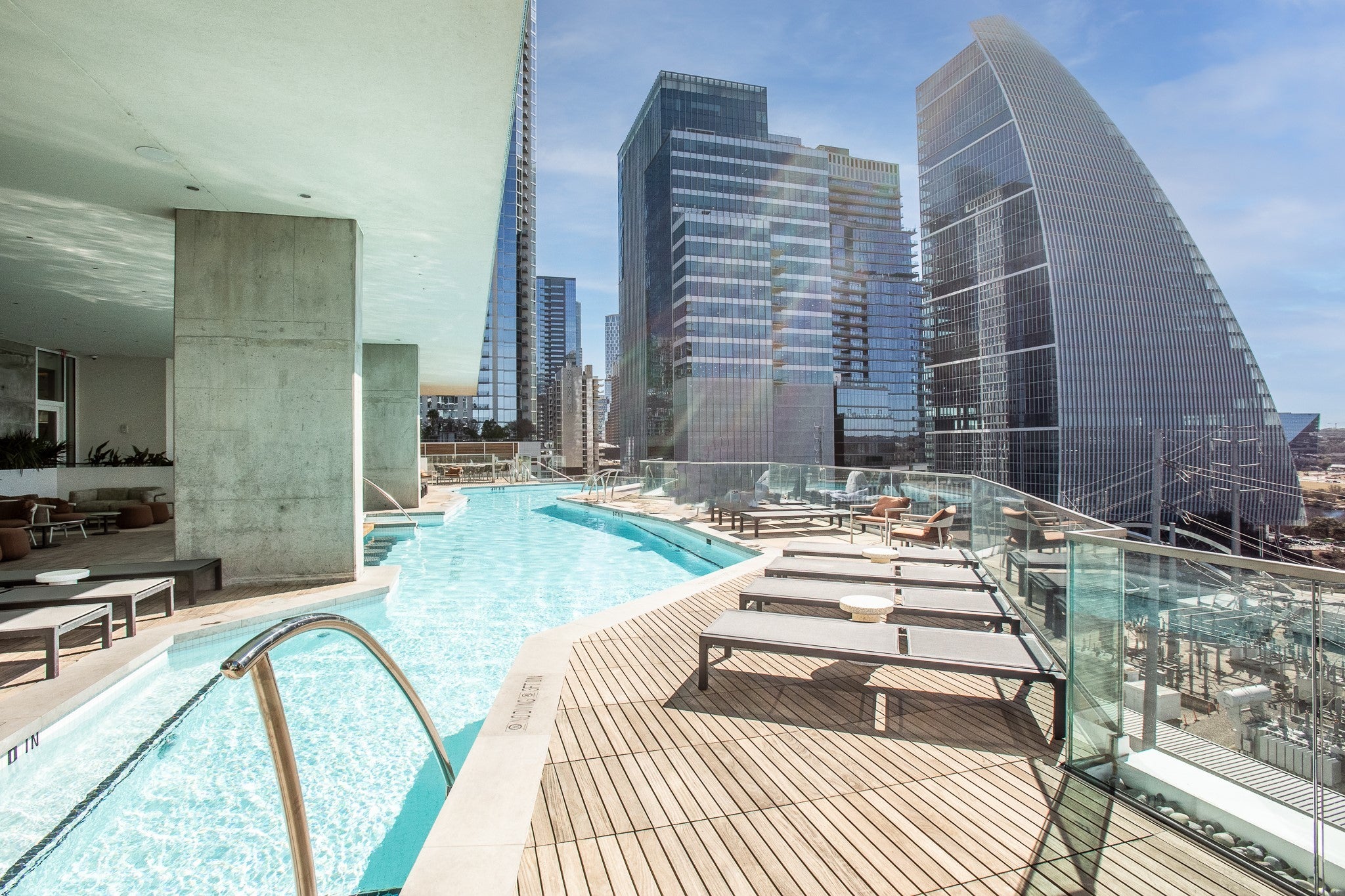 Welcome to The Independent, Unit 5002. This B4 floor plan offers 1,351 square feet with two bedrooms and two baths, elevated above downtown Austin with panoramic city views and an open layout designed with intention. The Independent is like no other high-rise. Residents enjoy 24-hour concierge service and over 20,000 square feet of resort-style amenities. 9th floor amenities: dog park + grooming station and lounge, heated infinity pool over looking lady bird lake, multiple grills and dining spaces, children’s indoor and outdoor activity room and playground, guest suites, and clubroom with pool and ping pong. 34th floor amenities: Sky fitness gym, business center, 16 person board room + conference room, owner’s lounge +chef’s catering kitchen and private dining, outdoor lounges spaces, yoga + barre studio, and 25 person theater. Located in the heart of downtown, this residence offers immediate access to dining, culture, and trails. Elevated living in the heart of downtown Austin, defined by design and luxury.