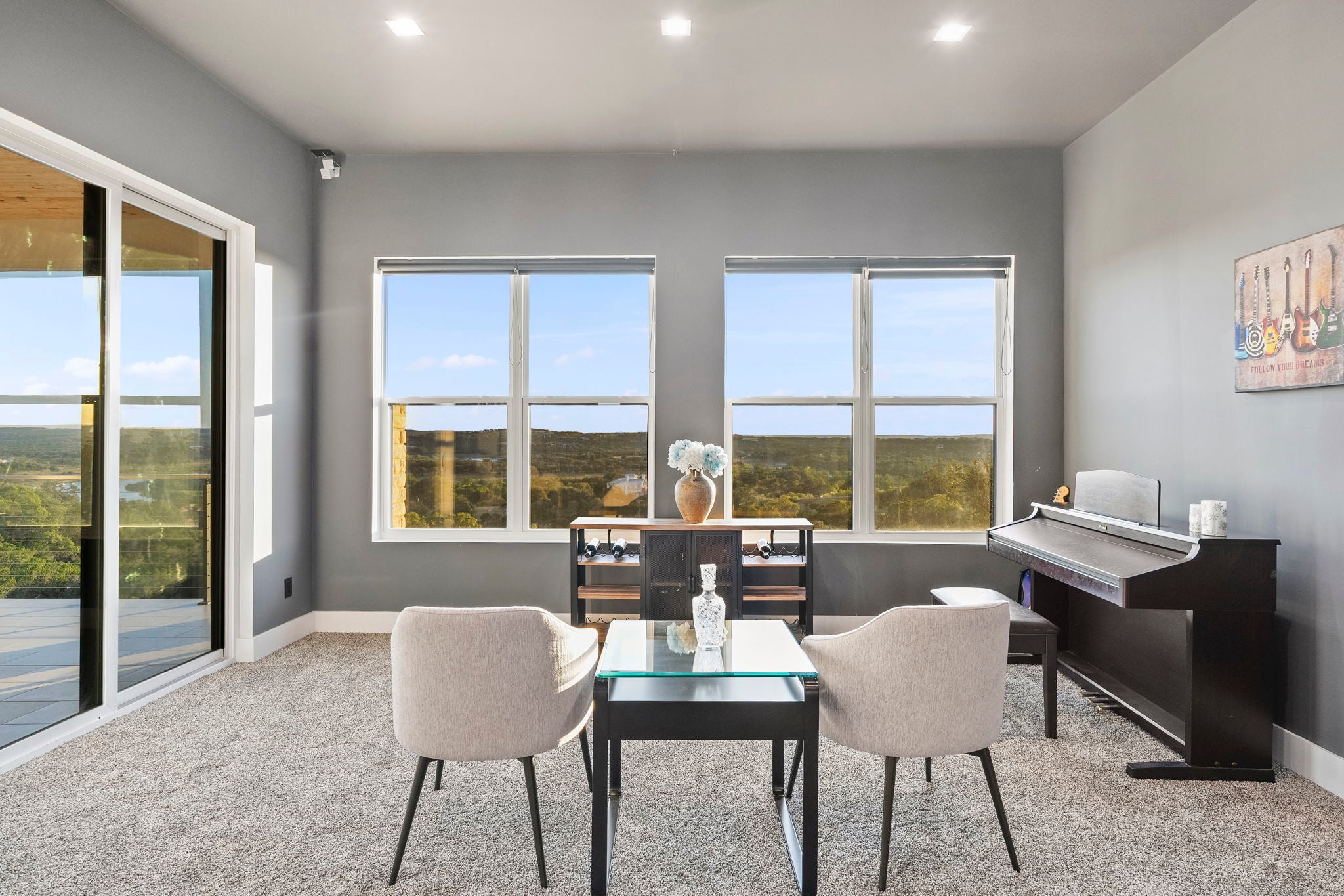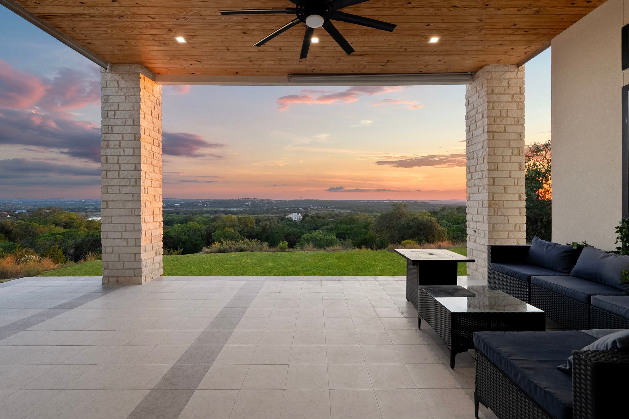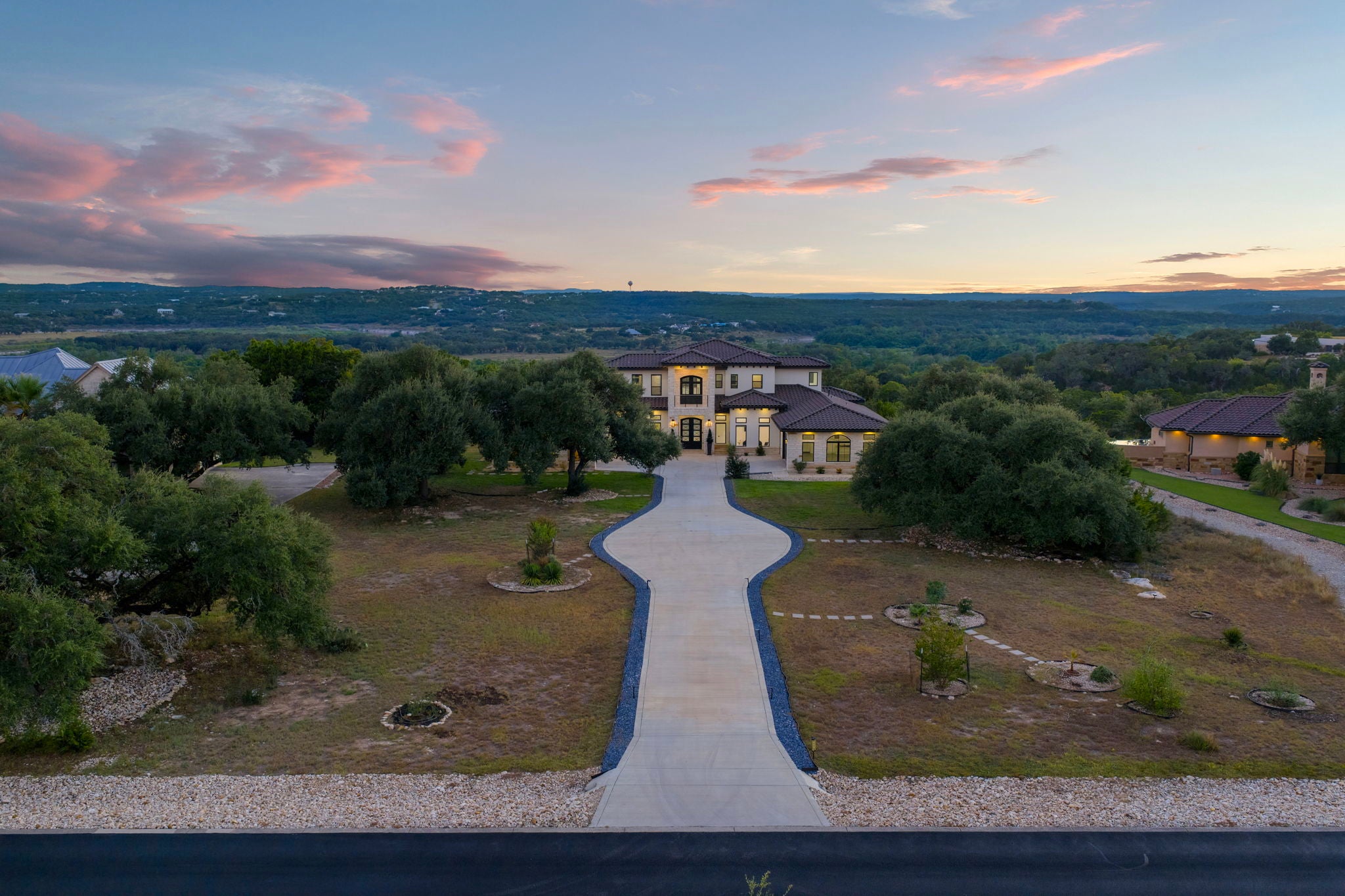 Perched atop a private 3.62-acre hilltop in the Texas Hill Country near Canyon Lake, this exceptional custom estate captures breathtaking panoramic Hill Country and Guadalupe River views along with unforgettable sunsets. Located in the prestigious gated community of The Peninsula at Mystic Shores, the home offers privacy, elevation, and luxury living within convenient reach of Austin, San Antonio, New Braunfels, and Wimberley. A grand 9-foot double iron door opens to an impressive open-concept living space featuring soaring 22-foot ceilings, expansive windows, and a massive sliding glass wall that frames the surrounding Texas Hill Country landscape. The living room features a dramatic 22-foot floor-to-ceiling fireplace, creating a striking centerpiece for everyday living and entertaining. The gourmet kitchen includes a massive center island, custom cabinetry, and high-end Thermador stainless steel appliances. The open layout connects the kitchen, dining, and living areas while maximizing the spectacular views. Privately located on the first floor and separated from all other bedrooms, the luxurious primary suite offers oversized picture windows showcasing panoramic Hill Country and Guadalupe River views. The spa-inspired bathroom includes a spacious walk-in shower with dual rain showerheads and 12 body jets, along with a stand-alone soaking tub. Four additional bedrooms include walk-in closets and private en-suite bathrooms. A dedicated office opens to the patio, while the upstairs loft and media room provide additional space for relaxation and entertainment. Outdoor living is exceptional with a covered patio, covered front balcony, and covered upper balcony positioned to capture sweeping Hill Country scenery and sunsets. A fully equipped outdoor kitchen makes entertaining effortless. Additional features include smart home technology, a three-car garage, water softener system, tankless water heater with unlimited hot water, and WiFi-controlled irrigation.