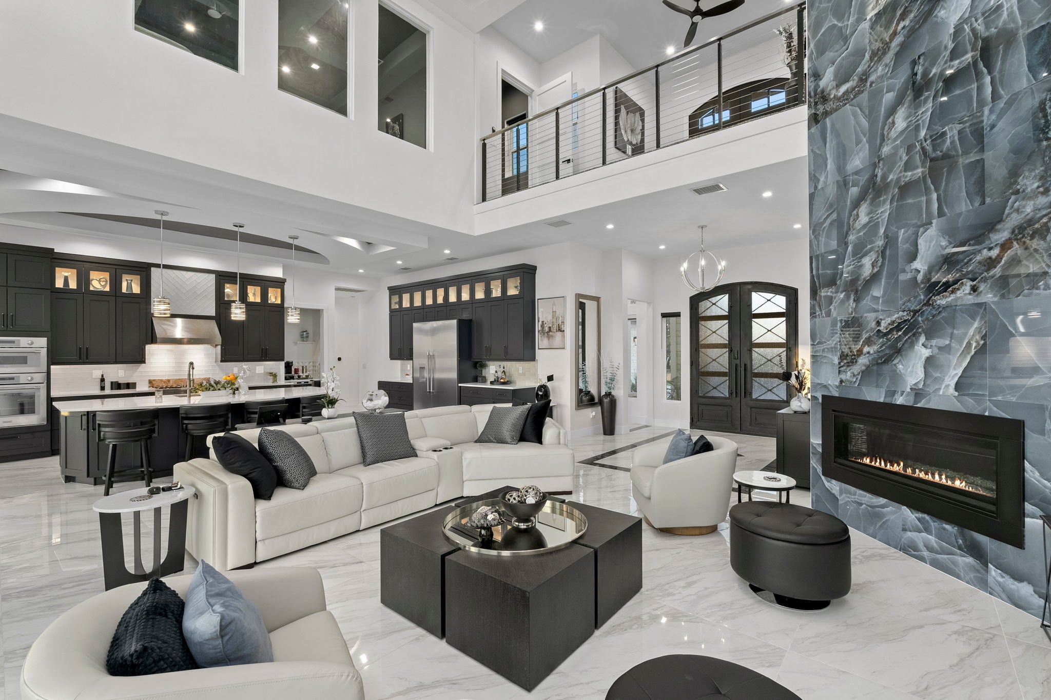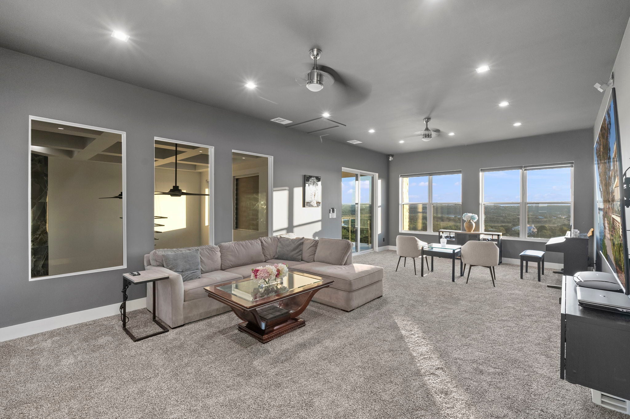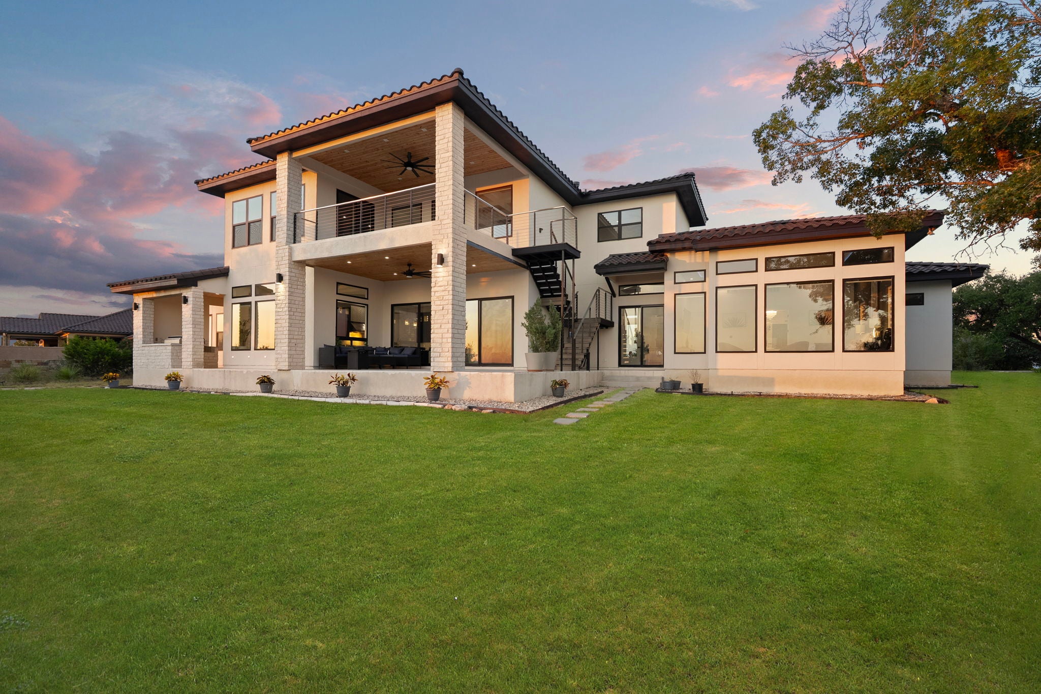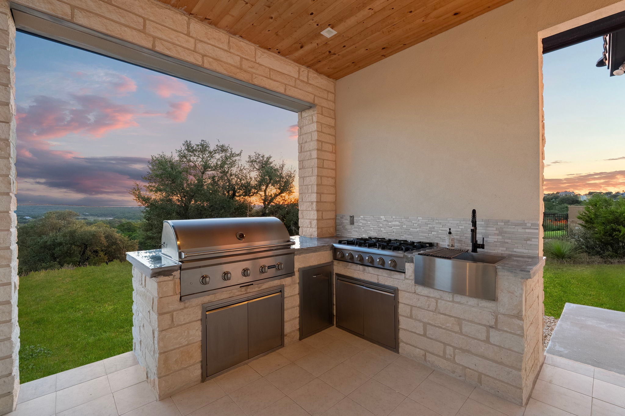 Perched atop a private 3.62-acre hilltop in the Texas Hill Country near Canyon Lake, this exceptional custom estate captures breathtaking panoramic Hill Country and Guadalupe River views along with unforgettable sunsets. Located in the prestigious gated community of The Peninsula at Mystic Shores, the home offers privacy, elevation, and luxury living within convenient reach of Austin, San Antonio, New Braunfels, and Wimberley. A grand 9-foot double iron door opens to an impressive open-concept living space featuring soaring 22-foot ceilings, expansive windows, and a massive sliding glass wall that frames the surrounding Texas Hill Country landscape. The living room features a dramatic 22-foot floor-to-ceiling fireplace, creating a striking centerpiece for everyday living and entertaining. The gourmet kitchen includes a massive center island, custom cabinetry, and high-end Thermador stainless steel appliances. The open layout connects the kitchen, dining, and living areas while maximizing the spectacular views. Privately located on the first floor and separated from all other bedrooms, the luxurious primary suite offers oversized picture windows showcasing panoramic Hill Country and Guadalupe River views. The spa-inspired bathroom includes a spacious walk-in shower with dual rain showerheads and 12 body jets, along with a stand-alone soaking tub. Four additional bedrooms include walk-in closets and private en-suite bathrooms. A dedicated office opens to the patio, while the upstairs loft and media room provide additional space for relaxation and entertainment. Outdoor living is exceptional with a covered patio, covered front balcony, and covered upper balcony positioned to capture sweeping Hill Country scenery and sunsets. A fully equipped outdoor kitchen makes entertaining effortless. Additional features include smart home technology, a three-car garage, water softener system, tankless water heater with unlimited hot water, and WiFi-controlled irrigation.