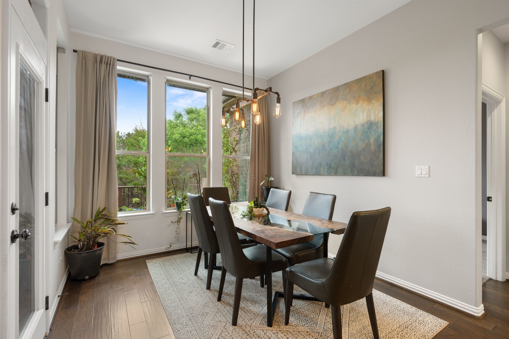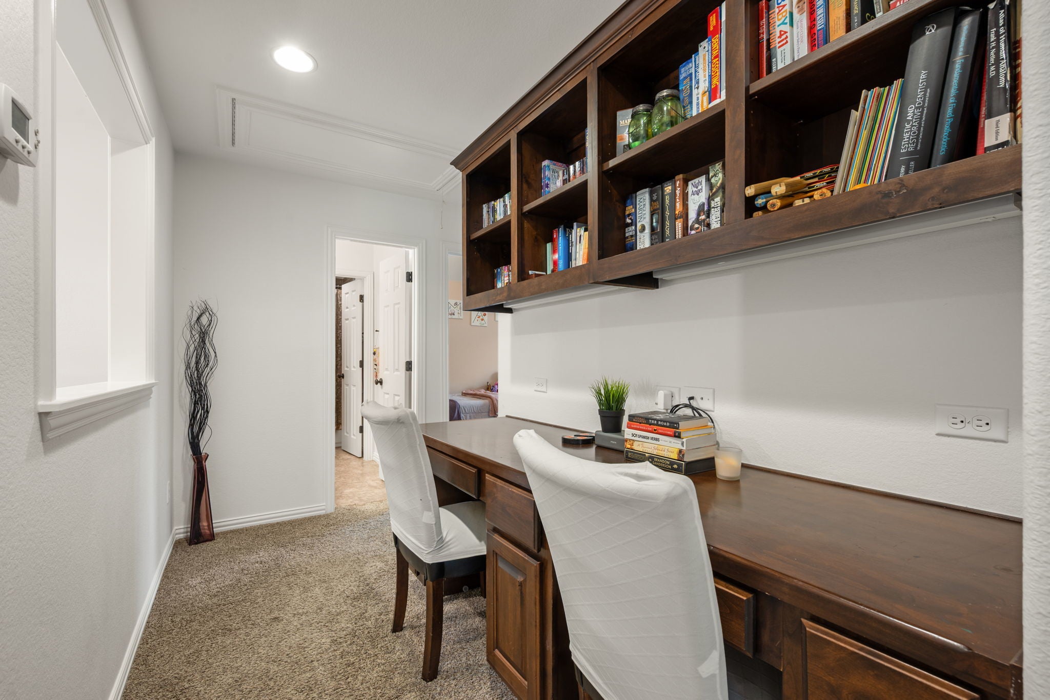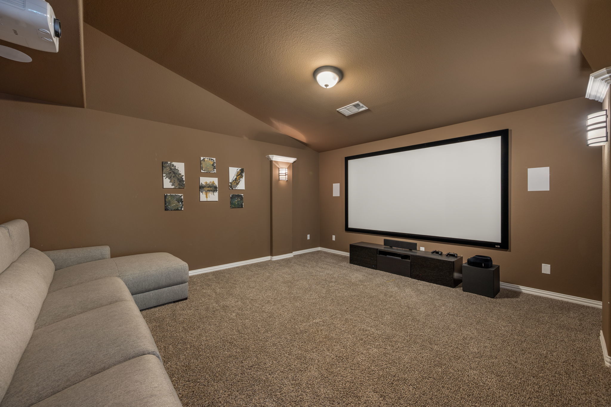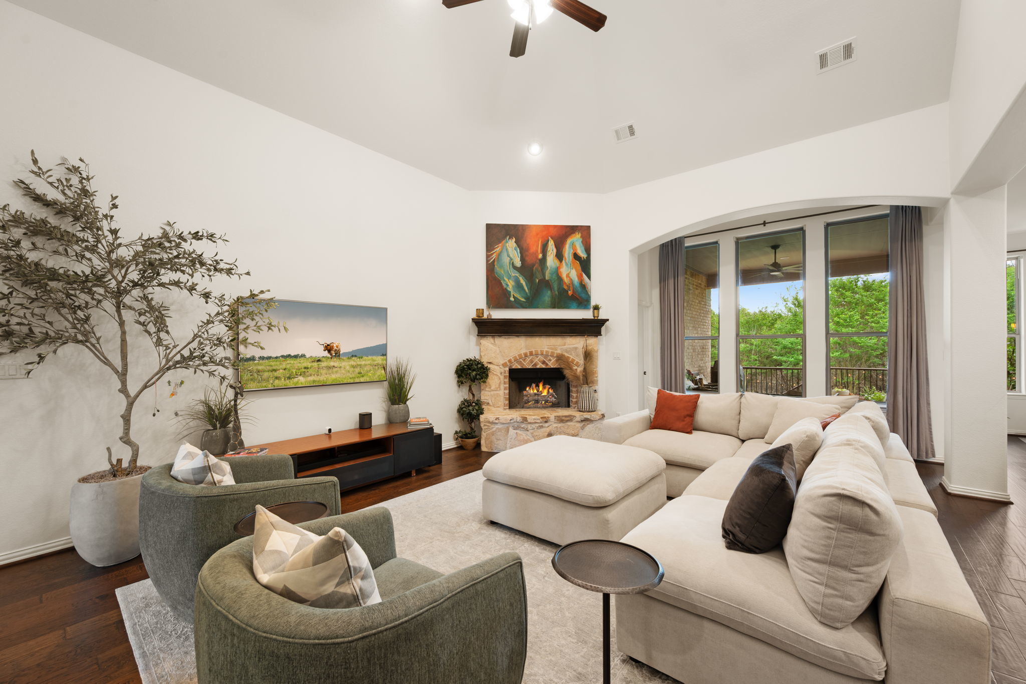Tucked into the heart of Belterra in Dripping Springs, this five-bedroom four-bath home offers a lifestyle that feels both grounded and expansive. Mornings begin quietly—light pouring through vaulted ceilings, the living room anchored by a warm fireplace, and wide views stretching into the private backyard and protected greenspace beyond. With only one neighboring home and a pocket park at your side, there’s a rare sense of space and calm that stands out among the others. The layout is designed for ease. A primary suite and guest wing on the main floor create comfort and flexibility, while upstairs unfolds into three additional bedrooms, a third living area, and a fully updated media lounge. The kitchen has been thoughtfully renovated with 6 cm quartz countertops, a matching full-height backsplash, and reimagined cabinetry transformed into large, functional drawers for seamless storage and accessibility. An appliance garage tucked beneath the stove keeps surfaces clean and streamlined, maximizing usable space while maintaining a polished, modern feel. The 2021-updated media room goes beyond expectations—an oversized retreat designed for gathering. A 120-inch projector screen, built-in wiring for five-speaker surround sound, recessed lighting, and plush wall-to-wall carpeting create an immersive, acoustically balanced environment perfect for movie nights or game days. Upstairs, expansive, lush views reinforce the appeal of homes backing to greenspace in Dripping Springs. A dedicated office supports working from home, while a formal dining or flexible bonus space adapts to your needs. A spacious laundry room adds everyday practicality. Set within top-rated Dripping Springs ISD and walkable to schools, the location balances convenience and escape—minutes to Belterra Village, local wineries, breweries, and about 25 minutes to Austin and the airport. This is a home that settles you the moment you arrive—quiet, open, and easy, with space to live exactly how you want.