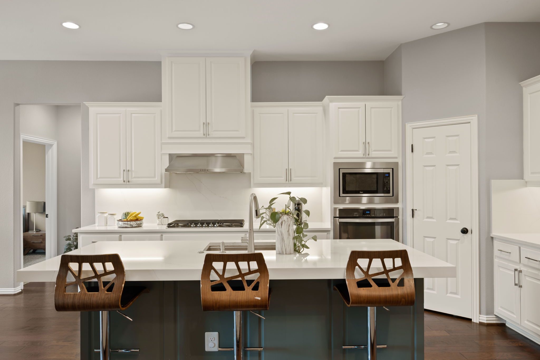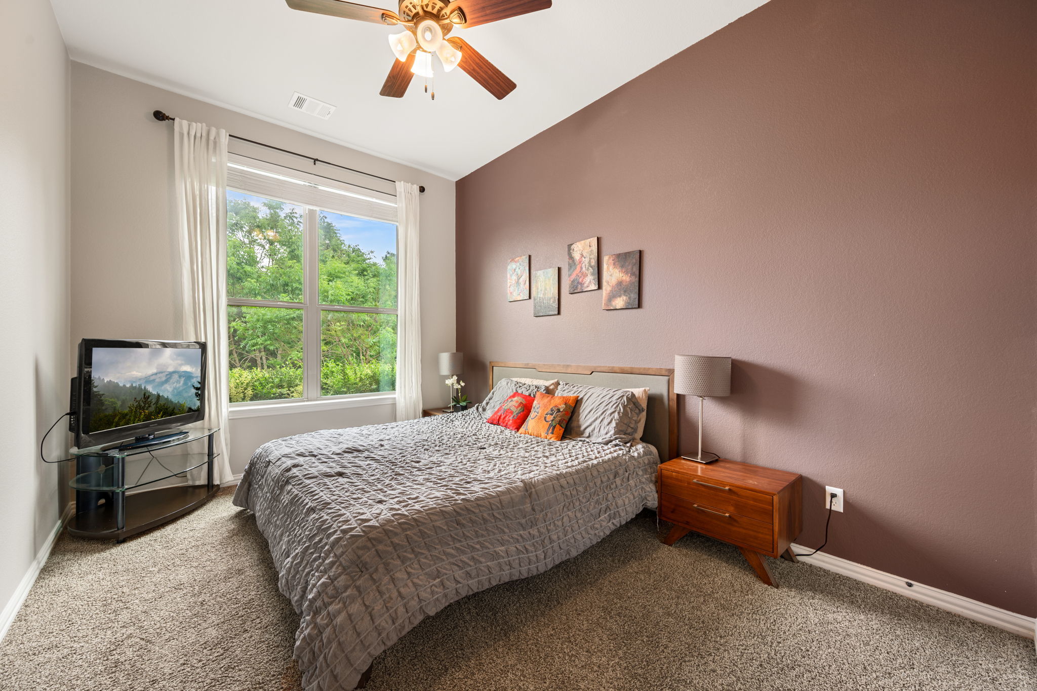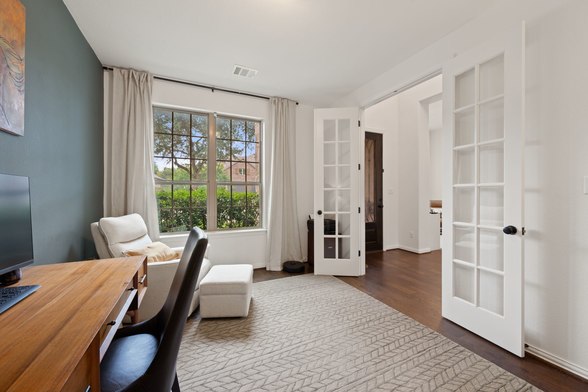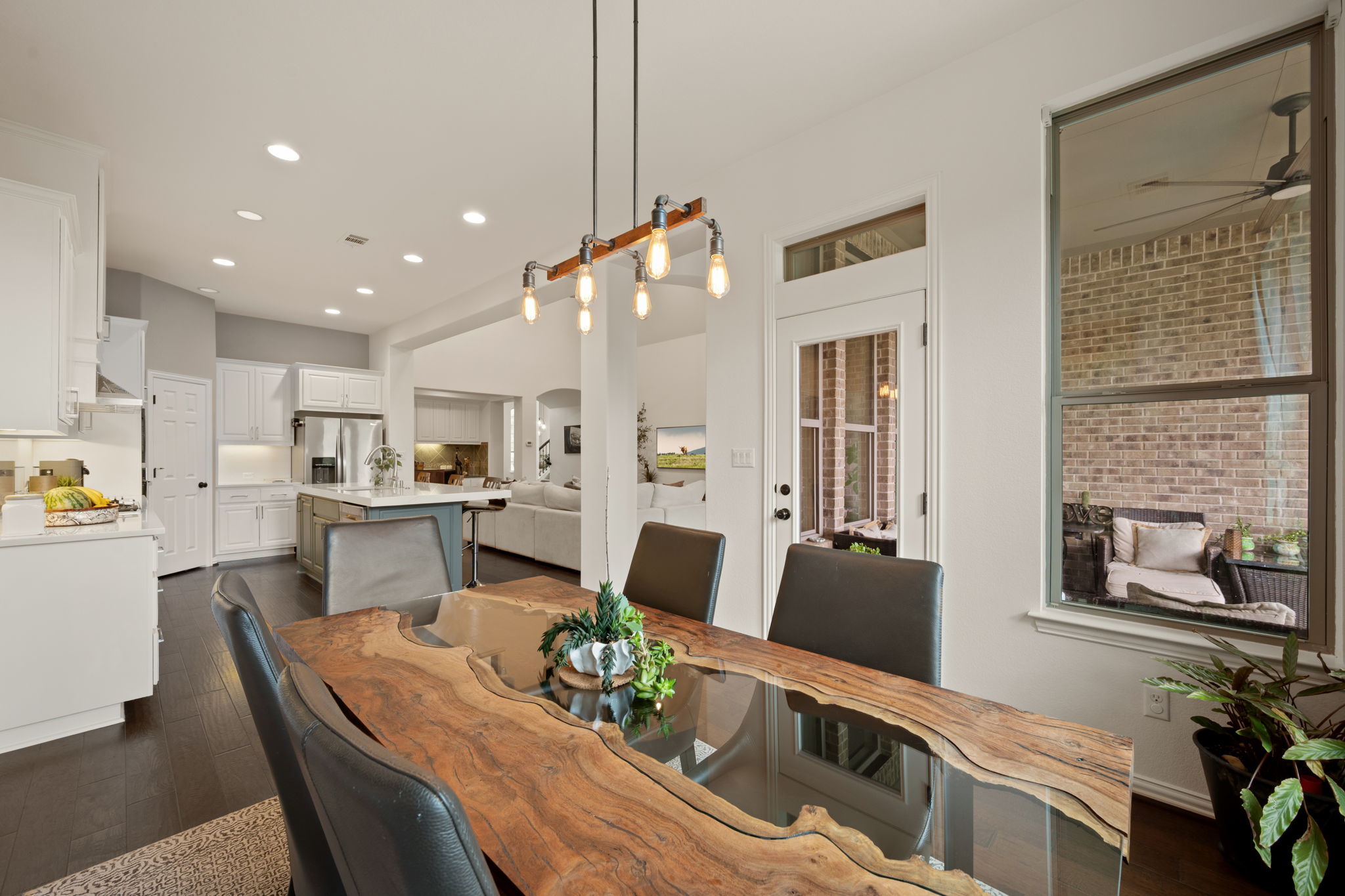 Tucked into the heart of Belterra in Dripping Springs, this five-bedroom four-bath home offers a lifestyle that feels both grounded and expansive. Mornings begin quietly—light pouring through vaulted ceilings, the living room anchored by a warm fireplace, and wide views stretching into the private backyard and protected greenspace beyond. With only one neighboring home and a pocket park at your side, there’s a rare sense of space and calm that stands out among the others. The layout is designed for ease. A primary suite and guest wing on the main floor create comfort and flexibility, while upstairs unfolds into three additional bedrooms, a third living area, and a fully updated media lounge. The kitchen has been thoughtfully renovated with 6 cm quartz countertops, a matching full-height backsplash, and reimagined cabinetry transformed into large, functional drawers for seamless storage and accessibility. An appliance garage tucked beneath the stove keeps surfaces clean and streamlined, maximizing usable space while maintaining a polished, modern feel. The 2021-updated media room goes beyond expectations—an oversized retreat designed for gathering. A 120-inch projector screen, built-in wiring for five-speaker surround sound, recessed lighting, and plush wall-to-wall carpeting create an immersive, acoustically balanced environment perfect for movie nights or game days. Upstairs, expansive, lush views reinforce the appeal of homes backing to greenspace in Dripping Springs. A dedicated office supports working from home, while a formal dining or flexible bonus space adapts to your needs. A spacious laundry room adds everyday practicality. Set within top-rated Dripping Springs ISD and walkable to schools, the location balances convenience and escape—minutes to Belterra Village, local wineries, breweries, and about 25 minutes to Austin and the airport. This is a home that settles you the moment you arrive—quiet, open, and easy, with space to live exactly how you want.