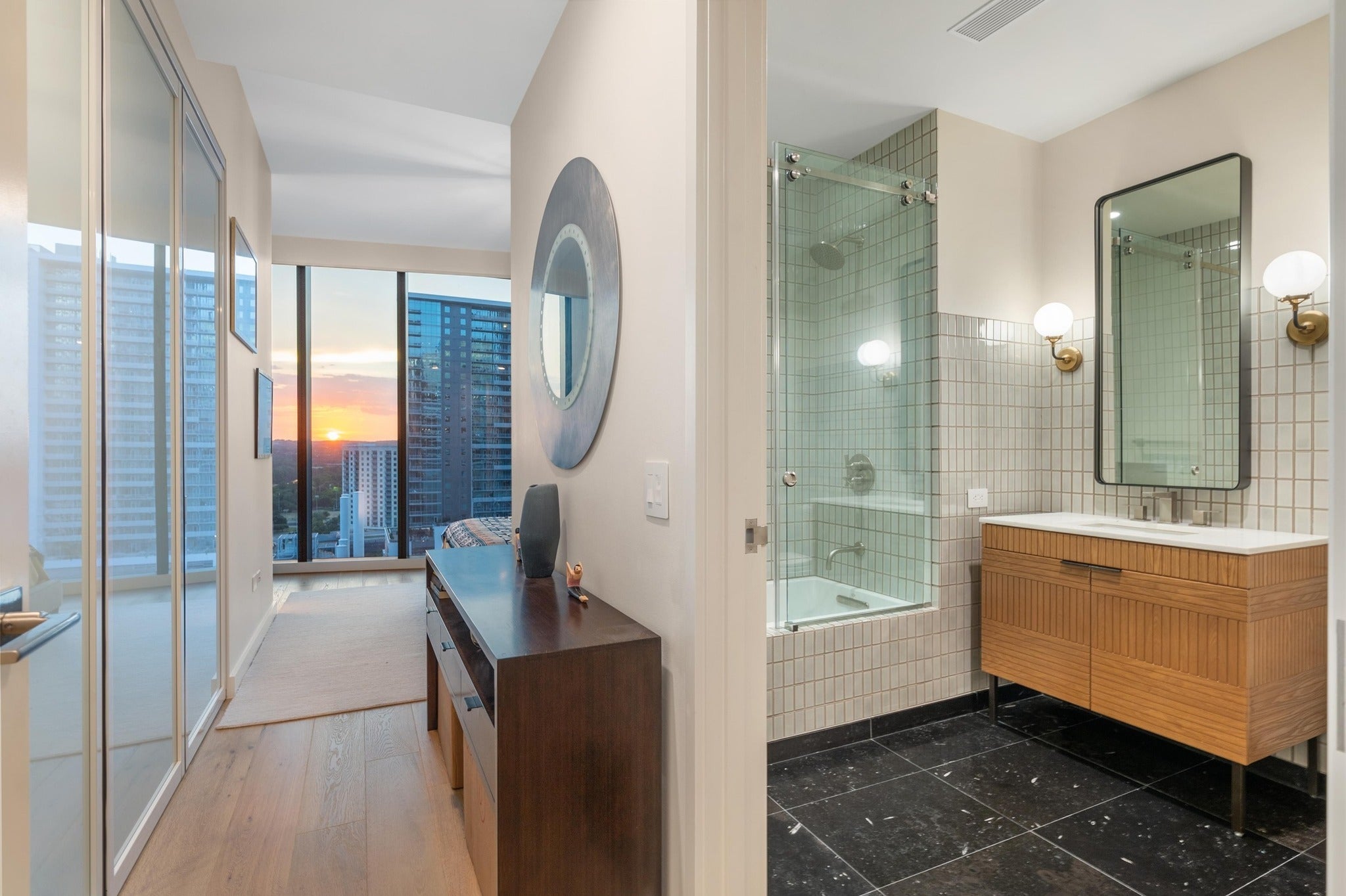 Experience elevated downtown living in this west-facing condominium at the exclusive Austin Proper. Floor-to-ceiling windows frame breathtaking sunsets over Lady Bird Lake and the Austin skyline, while a private balcony extends the living space outdoors, creating an ideal setting to unwind or entertain against a dramatic backdrop. Spanning 1,931 square feet, this thoughtfully designed 2 living, 2-bedroom, 2.5-bath residence offers an abundance of space, and flexibility. The second living area adds flexibility, easily serving as a den, office, or media room. The kitchen was redesigned by Arete, combining clean modern lines with premium Gaggenau appliances to deliver both function and sophistication. California Closets throughout both bedrooms accompanies the residence, offering a thoughtful balance of organization and style. Each designated bedroom features an ensuite bath for comfort and privacy, while a separate powder bath provides convenience for guests. In addition to two dedicated parking spaces, residents of Austin Proper enjoy access to unmatched amenities. These include 24/7 concierge and valet services, a heated rooftop pool with panoramic lake and city views, a private indoor-outdoor lounge, a state-of-the-art fitness center, and a serene spa with treatment rooms. Hotel-style services are also available within the tower, offering a seamless lifestyle that combines convenience with luxury. Situated in the heart of the vibrant 2nd Street District, this residence places you steps from Lady Bird Lake and the Hike & Bike Trail, Trader Joe’s, boutiques, restaurants, and live entertainment. Blending modern design, curated amenities, and one of downtown Austin’s most coveted addresses, this condominium offers a rare opportunity to experience the best of city living.