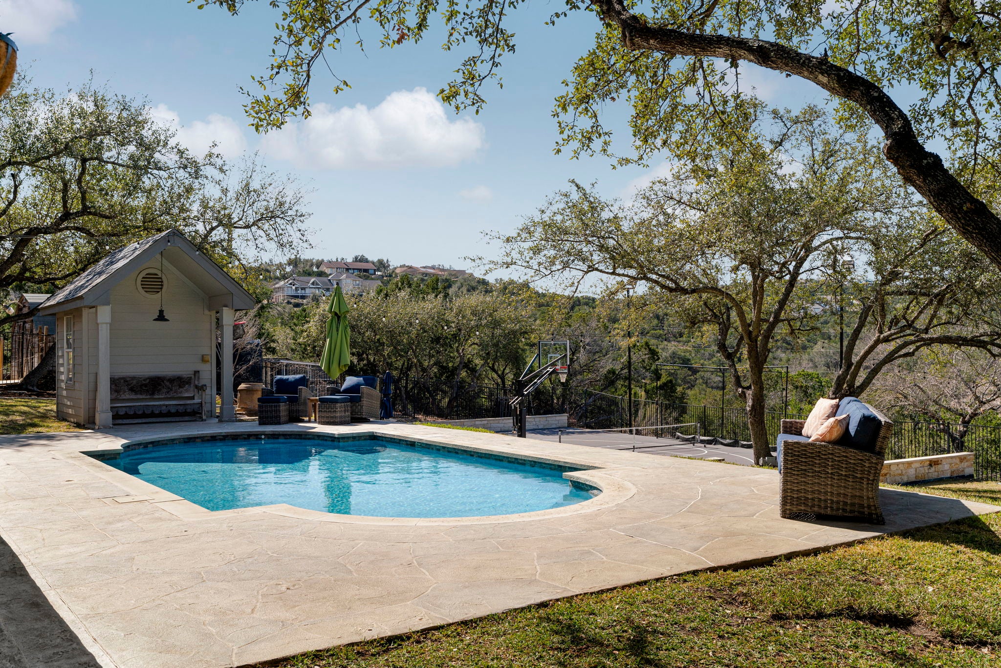 Set on 1.7 private acres just minutes from Lake Travis, this renovated estate offers the kind of everyday living that feels both elevated and relaxed, with expansive outdoor entertaining spaces, a resort style backyard, flexible guest accommodations, and room to work, gather, and unwind. This stunning 4,615 sq ft home has been extensively transformed with over $1M in thoughtful renovations, blending timeless Hill Country charm with elevated modern updates and custom touches at every turn. The thoughtfully renovated primary suite feels like a peaceful sanctuary, complete with high-end finishes and a luxurious bath. The wood-beamed tray ceiling creates an immediate wow factor, and once you see the stunning bathroom, you’ll know this is where you want to unwind every day. Designed for entertaining, the chef’s kitchen opens to expansive outdoor living spaces and a breathtaking backyard. The oversized covered patio with fireplace creates the perfect setting for year-round gatherings. Outdoor amenities include a Sports court, raised garden beds, chicken coop, expansive yard space with mature trees, no neighbors directly behind you and a wood burning fire pit and seating area. Recently added in 2025, the large game room addition upstairs features built-ins, double bunk beds, and a mini fridge. Extensive mud room/laundry room with pantry space, storage space, and a coffee bar. In addition to the main residence, the property features a 705 sq ft guest space with a full kitchen, 1 bedroom, and 1 bath — ideal for guests, multigenerational living, office space, or a private retreat. The 2 car detached garage is climatized and workshop spaces are truly impressive. Also includes utility sink, huge storage closets, additional washer/dryer and a 500 lb attic lift in carport. This one-of-a-kind estate offers privacy and tranquility while remaining close to the hospital, exemplary schools, retail, dining, and the lake.