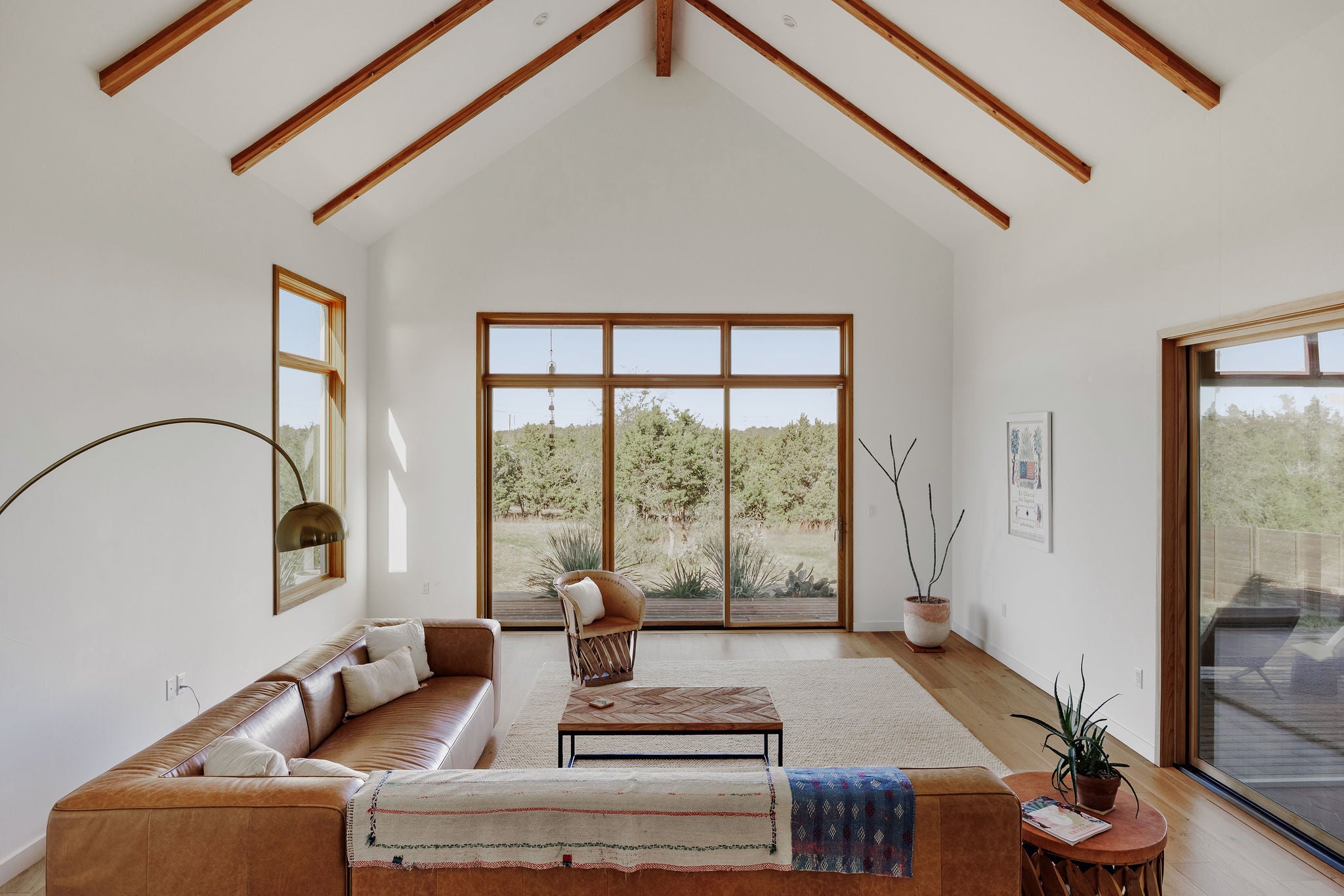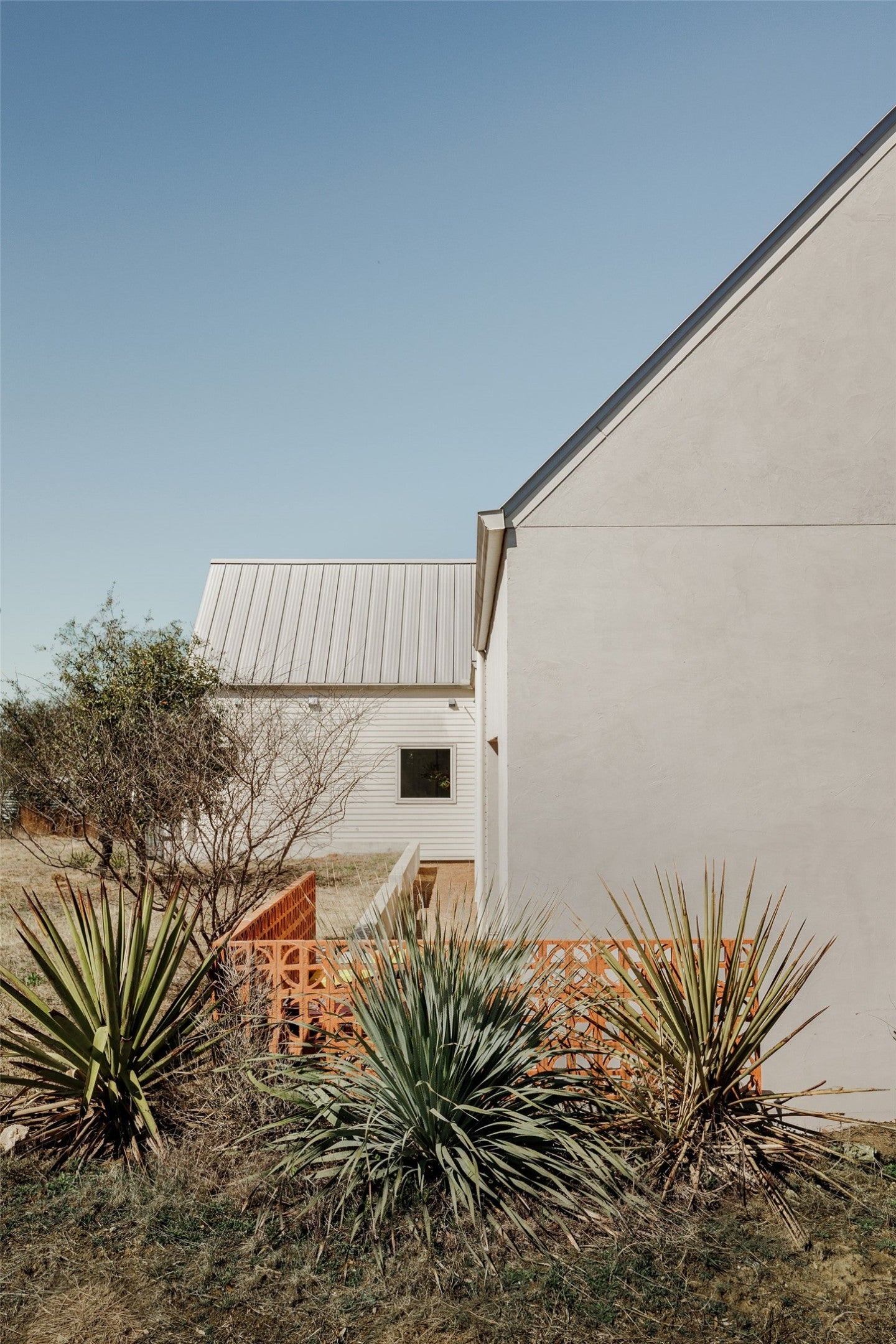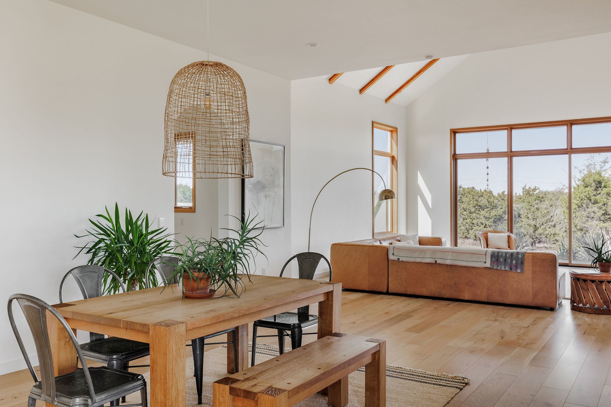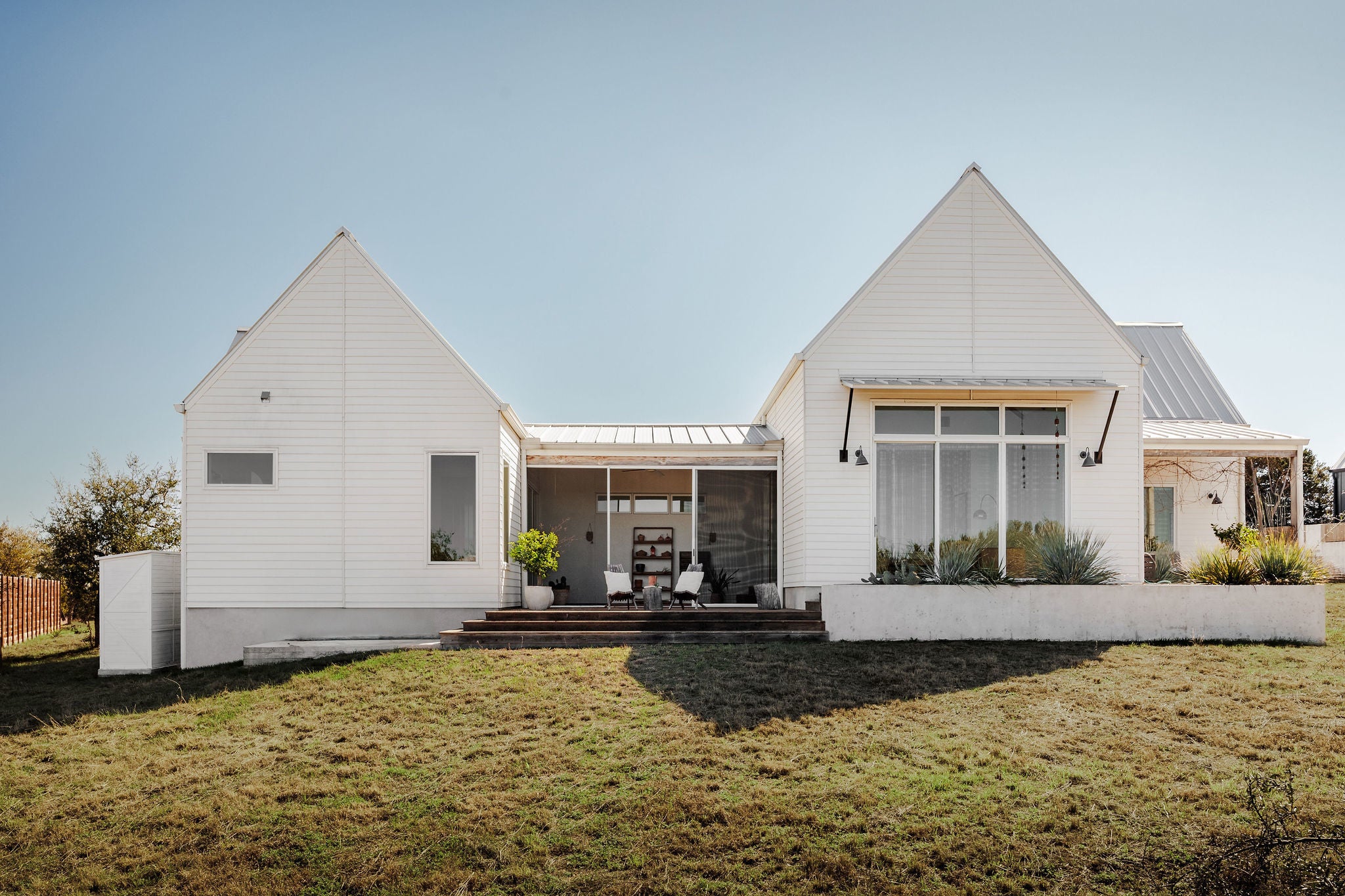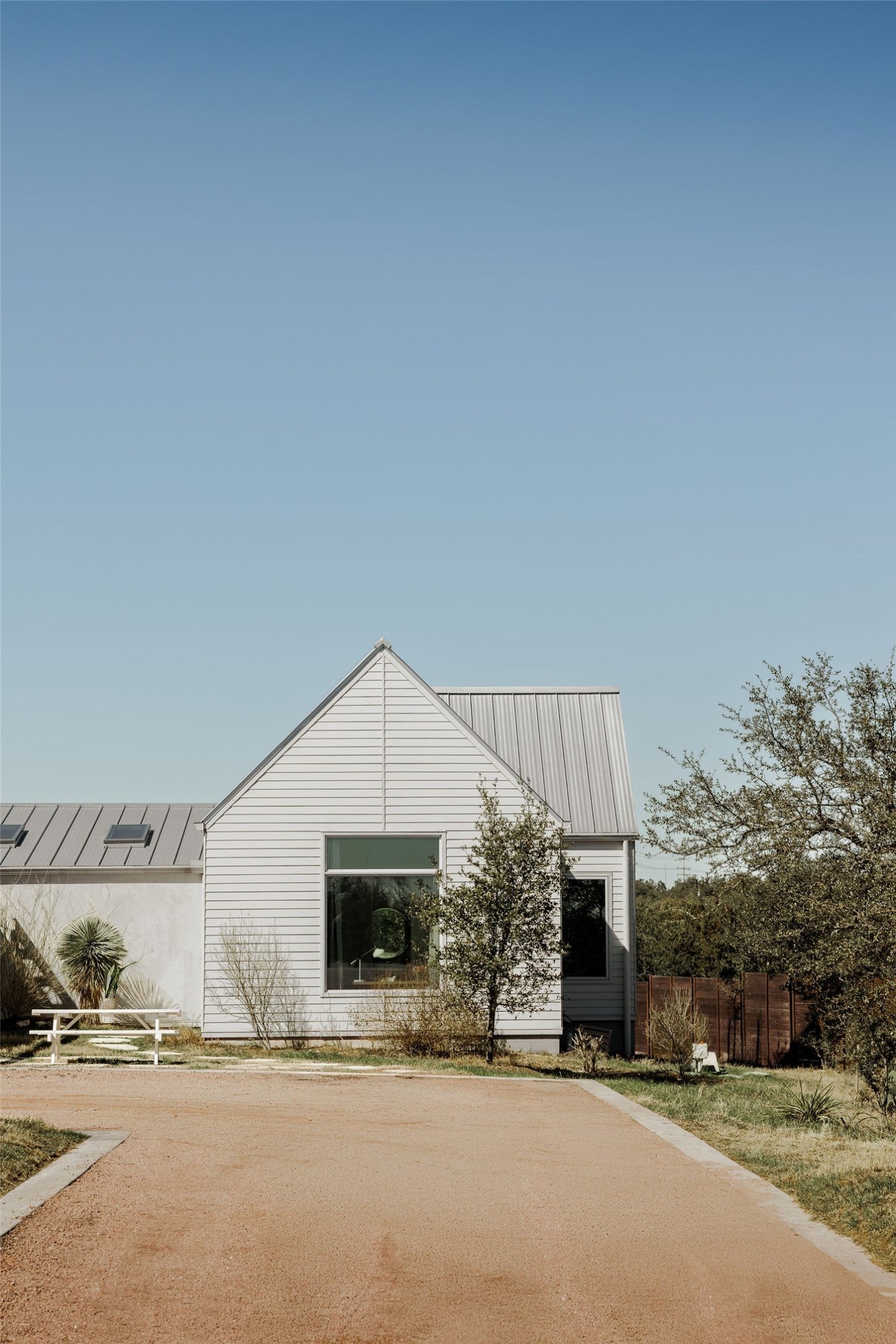 Set within the Terra Scena community in Dripping Springs, 201 Terra Scena Trail is a home that unfolds. Designed by Tim Brown Architects and built by SRD Builder, it blends Scandinavian modern simplicity with the warmth of Marfa and Mexico City, with details that feel natural. From the street, the architecture is understated. White stucco and soft arches create depth, and inside the home opens up. Soaring ceilings with exposed wood beams, expansive windows, and skylights pull light through the space. The main living area is open and well lit. Oversized glass doors connect seamlessly to the outdoors, while wood floors and natural materials keep everything grounded. The kitchen sits at the center. Clean-lined cabinetry, a farmhouse sink, open shelving, and a generous island make it both functional and refined. The primary suite is set apart and feels like a true retreat. Large picture windows bring in soft light, and the bath features a double vanity, soaking tub, and timeless finishes.Three additional bedrooms and two full baths offer flexibility for guests or work. What sets this home apart is how it sits on the property. The one acre lot has been restored to tall grass prairie, surrounded by native, drought resistant landscaping that shifts with the seasons. There is a sense of space and privacy, along with access to a shared 10 acre open space and private hiking trail. Sustainability is fully integrated. Cement board exterior, standing seam metal roof, double pane windows, and a rainwater collection system with approximately 32,000 gallon capacity. Infrastructure is in place for solar and EV. Terra Scena is a small, design focused community built around low impact living and thoughtful land stewardship. It attracts those who value architecture, privacy, and a more intentional way of living, all within minutes of wineries, parks, and downtown Dripping Springs, with easy access to Austin. Within Dripping Springs ISD, it offers both lifestyle and long term value.