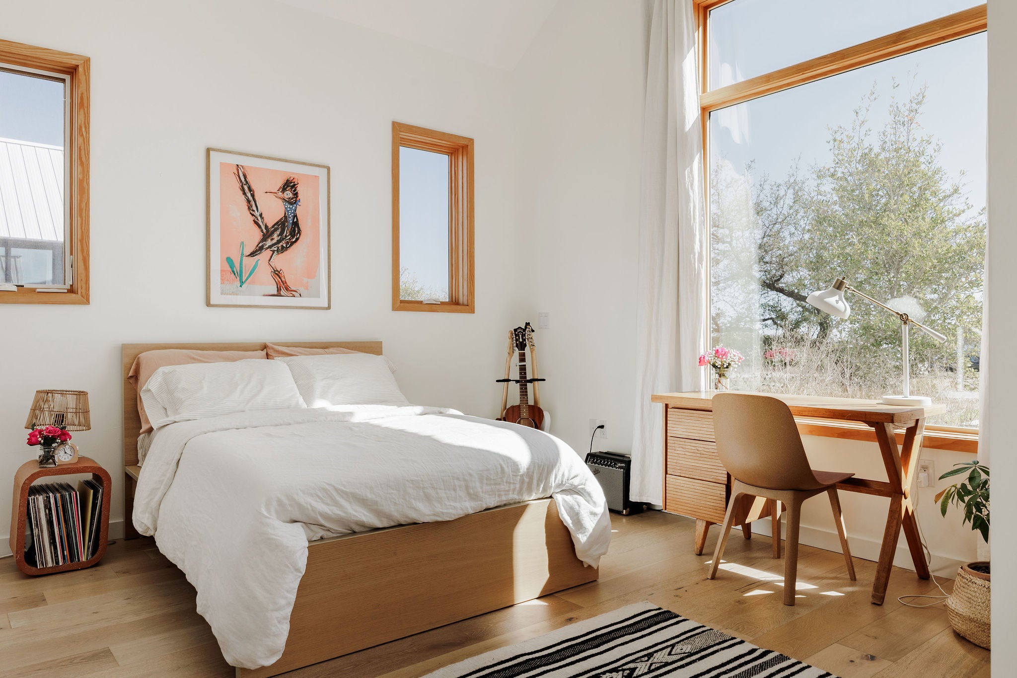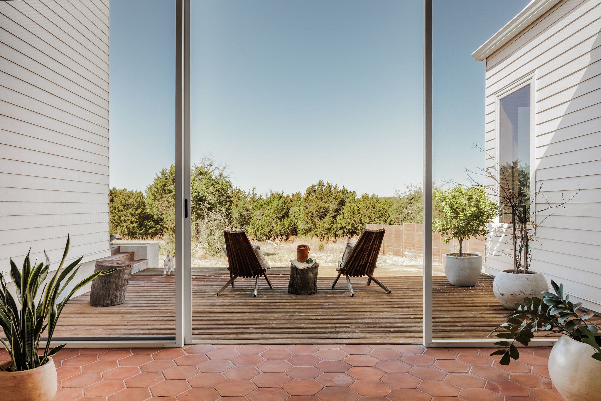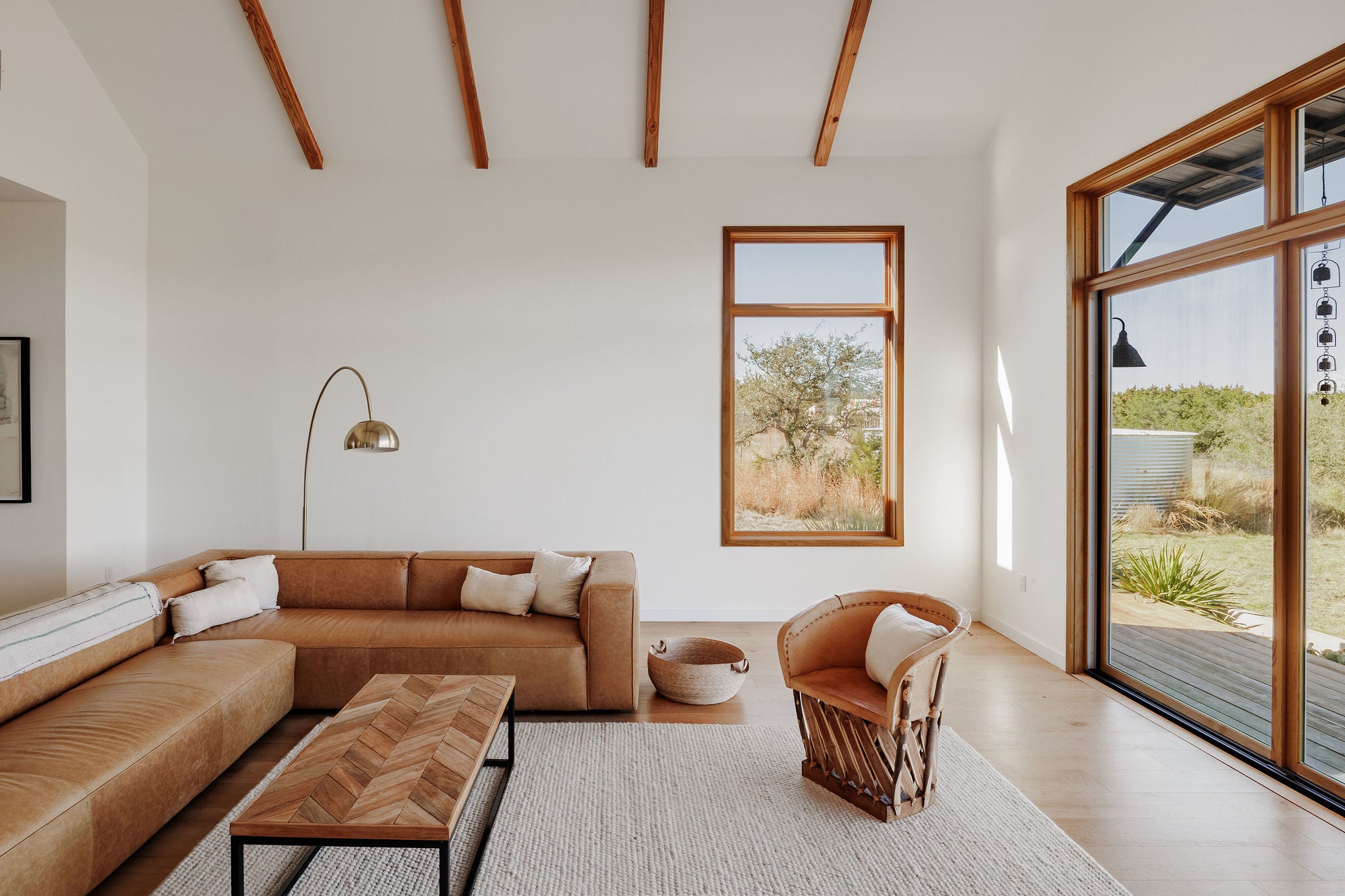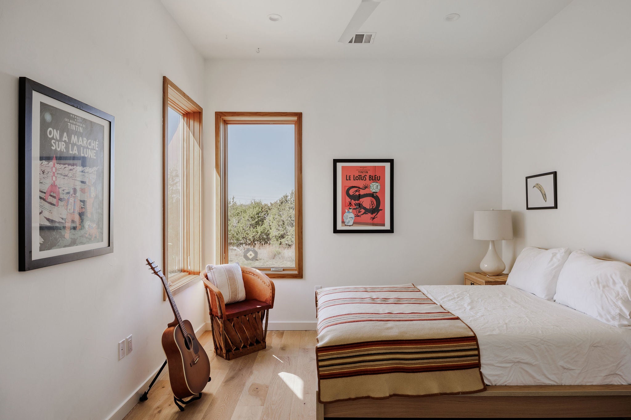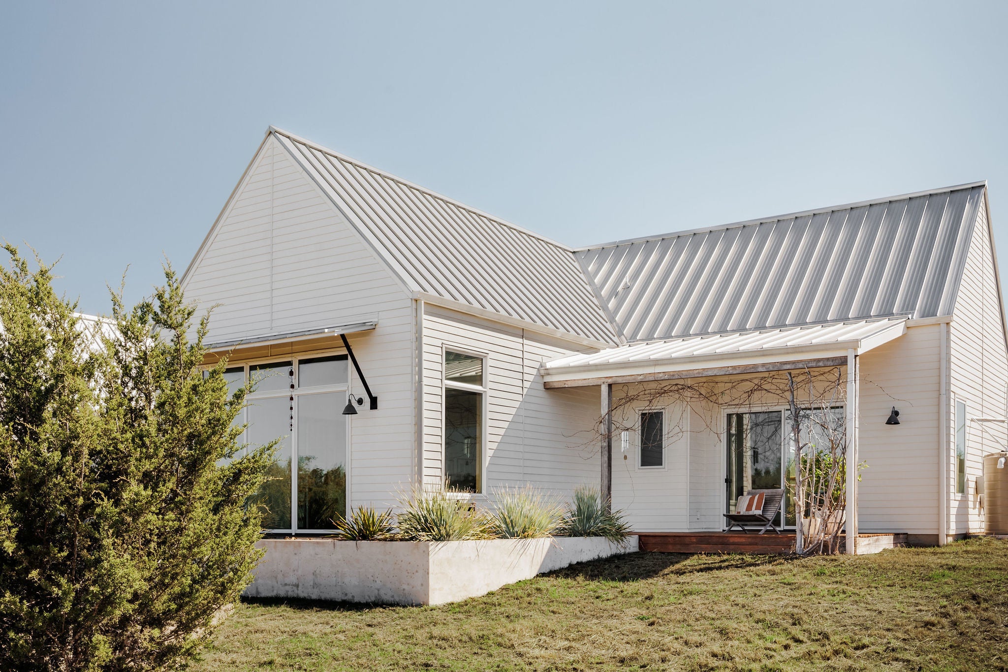Set within the Terra Scena community in Dripping Springs, 201 Terra Scena Trail is a home that unfolds. Designed by Tim Brown Architects and built by SRD Builder, it blends Scandinavian modern simplicity with the warmth of Marfa and Mexico City, with details that feel natural. From the street, the architecture is understated. White stucco and soft arches create depth, and inside the home opens up. Soaring ceilings with exposed wood beams, expansive windows, and skylights pull light through the space. The main living area is open and well lit. Oversized glass doors connect seamlessly to the outdoors, while wood floors and natural materials keep everything grounded. The kitchen sits at the center. Clean-lined cabinetry, a farmhouse sink, open shelving, and a generous island make it both functional and refined. The primary suite is set apart and feels like a true retreat. Large picture windows bring in soft light, and the bath features a double vanity, soaking tub, and timeless finishes.Three additional bedrooms and two full baths offer flexibility for guests or work. What sets this home apart is how it sits on the property. The one acre lot has been restored to tall grass prairie, surrounded by native, drought resistant landscaping that shifts with the seasons. There is a sense of space and privacy, along with access to a shared 10 acre open space and private hiking trail. Sustainability is fully integrated. Cement board exterior, standing seam metal roof, double pane windows, and a rainwater collection system with approximately 32,000 gallon capacity. Infrastructure is in place for solar and EV. Terra Scena is a small, design focused community built around low impact living and thoughtful land stewardship. It attracts those who value architecture, privacy, and a more intentional way of living, all within minutes of wineries, parks, and downtown Dripping Springs, with easy access to Austin. Within Dripping Springs ISD, it offers both lifestyle and long term value.