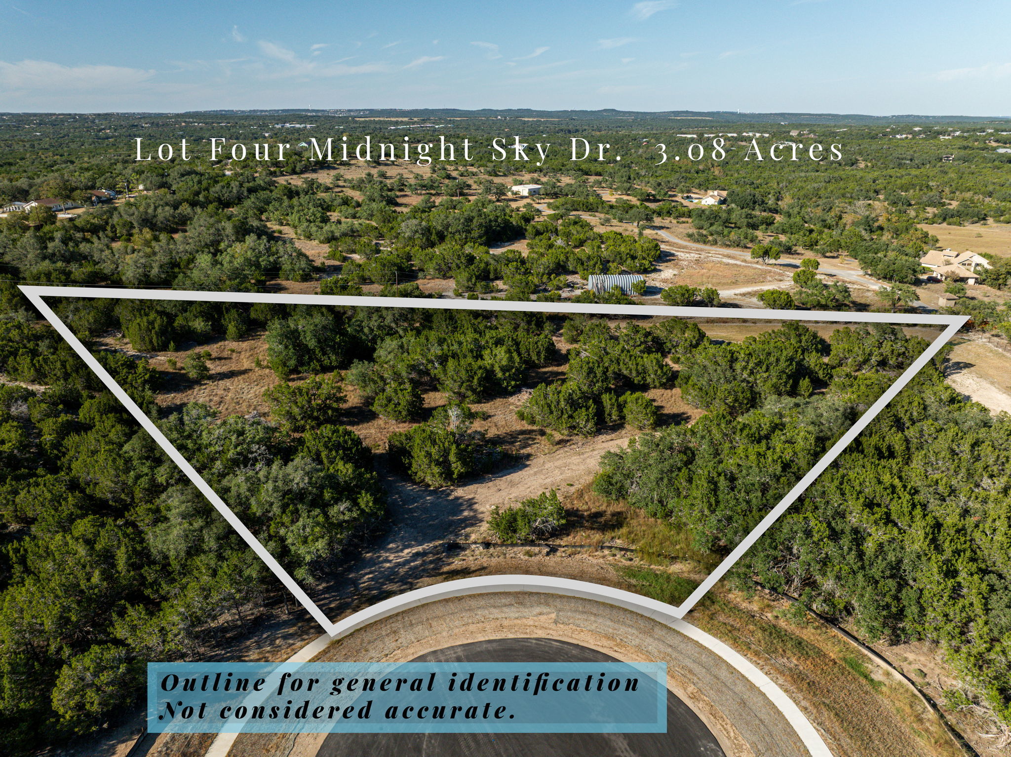 Possibilities are Endless! Price is for a finished home TBB similar to 13400 Paisano Trail as a baseline. MLS #7954992 3 acre build site that is partially cleared for a home. Listed as a To Be Built by Robert Kathman with great Hill Country views. Style and finish out for this price is similar to 13400 Paisano Trail. Open floorplan currently with walls of windows. Can be closed in as a buyer prefers. HUGE walk in pantry/dirty kitchen/ prep space. Largely a 1 story home with only a Gameroom up. Gameroom will be plumbed to add another full bath. No HOA. Low taxes. Can have 1 horse for every 1.5 acres. 2 other parcels available adjacent to this lot. www.midnightskydrive.com Plans have been submitted to Hays. Can build multiple buildings on the site. Casita, ADU, Guest House. No HOA. Low taxes. Water is MUD which is HUGE. Can have 1 horse for every 1.5 acres. 2 other parcels available adjacent to this lot.