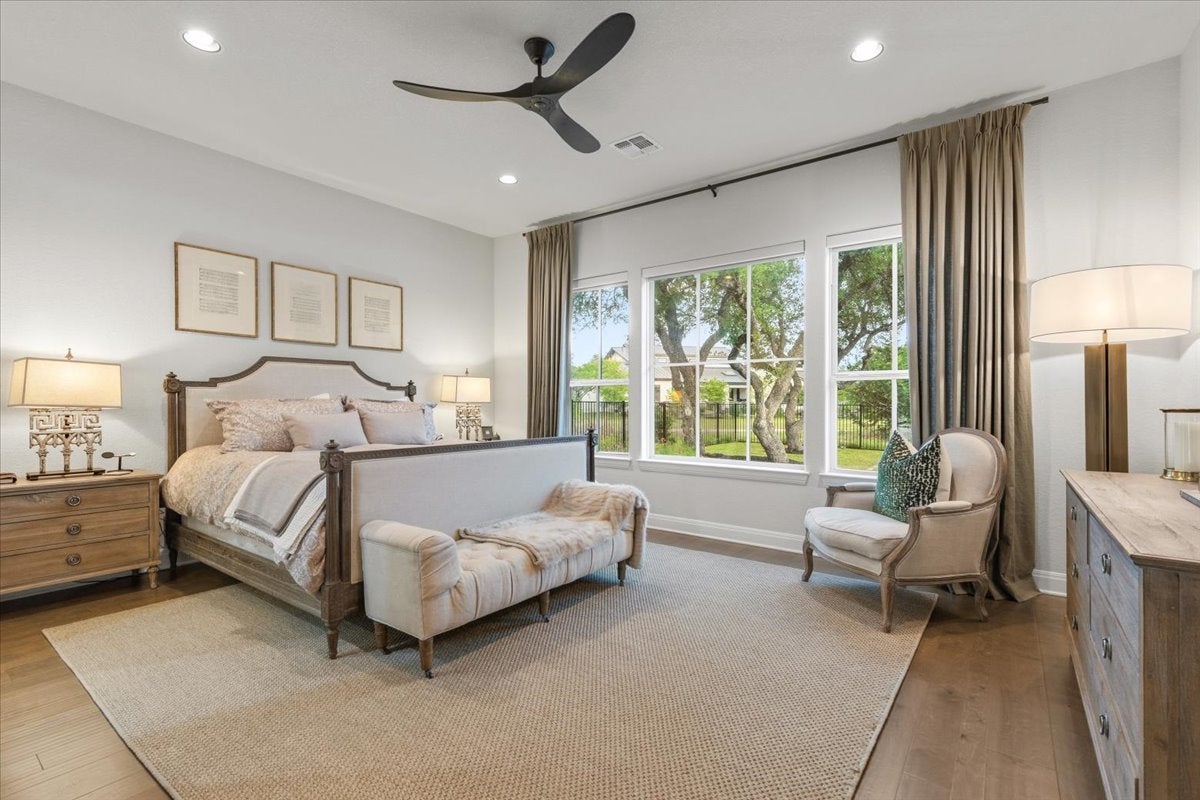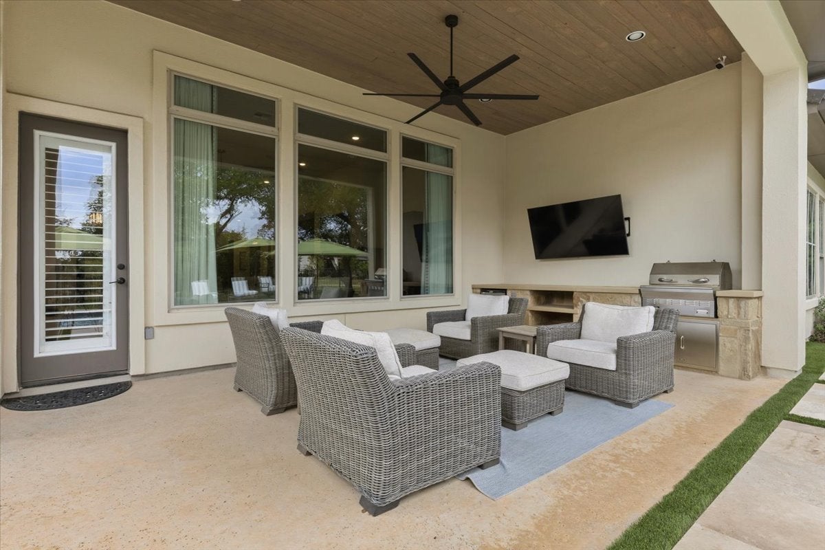 Nestled on a spacious 1/3-acre lot in the prestigious Cimarron Hills Golf & Country Club, this beautifully updated home offers privacy, luxury, and a true resort-style living experience. With no direct neighbor beside or behind, enjoy a peaceful setting surrounded by a 2024 built new private pool, mature trees and lush landscaping backing to a serene greenbelt. Inside, the home has been thoughtfully upgraded with wood flooring throughout, replacing all carpeted areas for a seamless and elevated look. Fresh interior paint, custom closet systems, automatic shades, plantation shutters, and designer lighting from Restoration Hardware enhance both style and functionality. The open-concept layout features a spacious living area with a gas fireplace, a large kitchen island, gas cooktop, and a walk-in wine cellar, perfect for entertaining. A standout feature is the private guest suite with its own entrance, kitchenette, and full bath, ideal for visitors or multigenerational living, guests and privacy. Step outside to your newly completed backyard oasis featuring a 2024 pool, outdoor kitchen, professional landscaping, and exterior lighting, all designed for elevated outdoor living. The recent epoxy-coated garage floors and water softener install add even more convenience and care to the home. Located within the Jack Nicklaus Signature Golf Course community of Cimarron Hills, residents enjoy access to world-class amenities including a private golf course, clubhouse dining, full-service spa, fitness center, resort-style pool, tennis and pickleball courts, and scenic walking trails. A golf cart is included, making it easy to explore everything this exceptional community has to offer. Experience refined Hill Country living with unmatched privacy, thoughtful upgrades, and luxury amenities, this is Cimarron Hills at its finest.